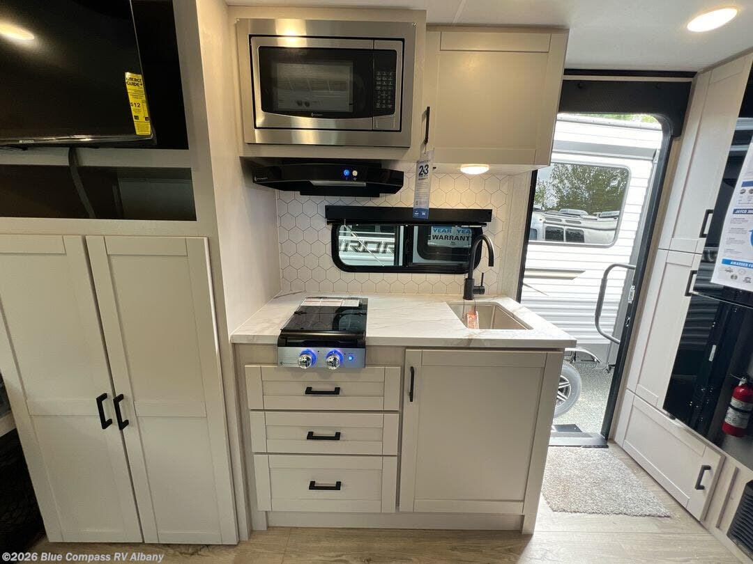 Kitchen: Equipped with a 2-burner cooktop, convection microwave, 11 cu. ft. 12V refrigerator, and stainless-steel sink.