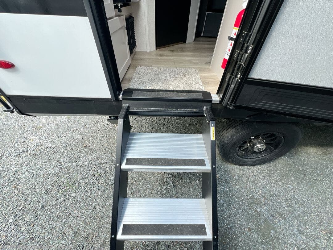 Exterior: Includes a 13-foot power awning with LED lighting, rear-mounted ladder, and a 2-inch rear receiver for additional cargo or bike racks.