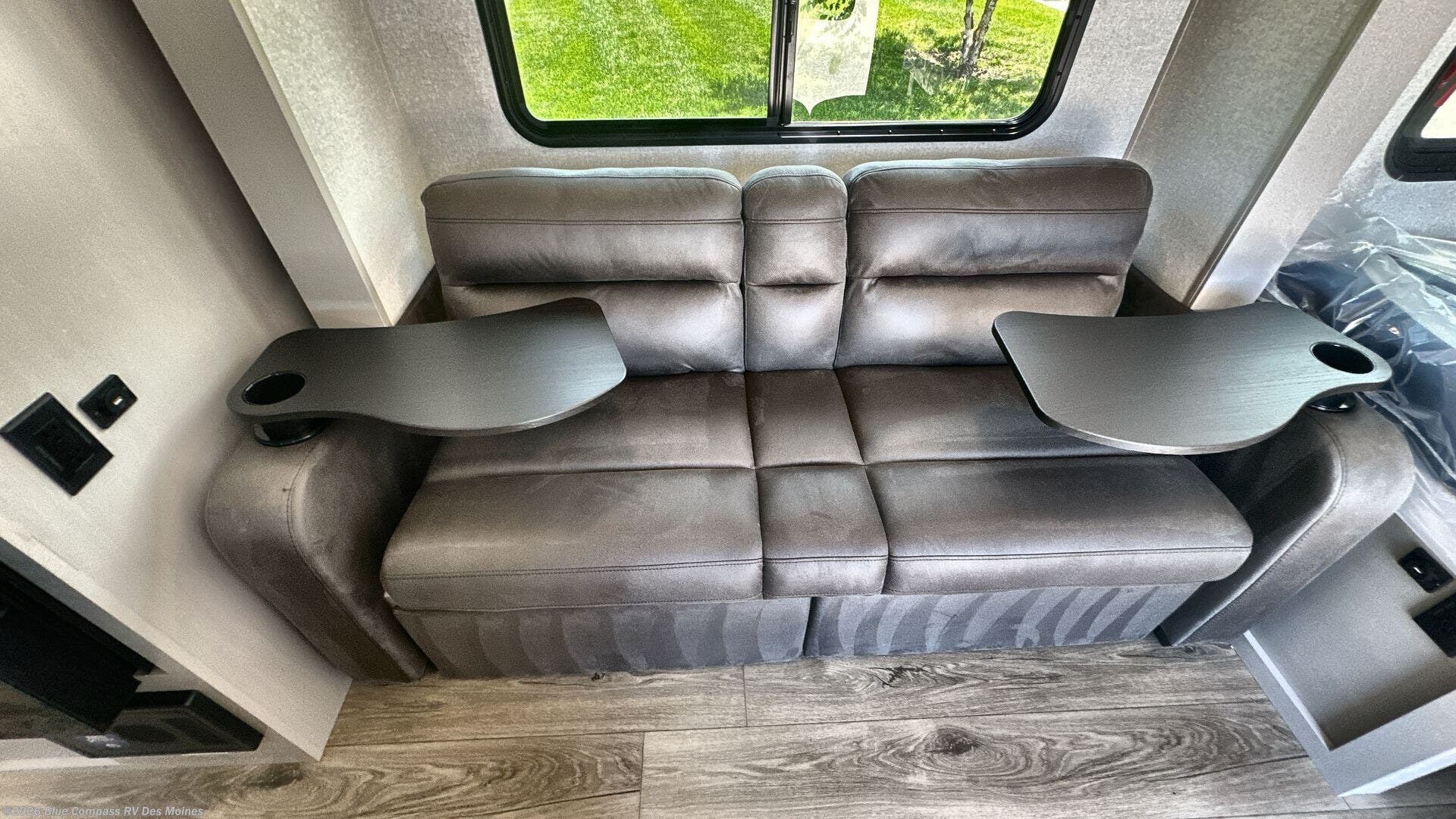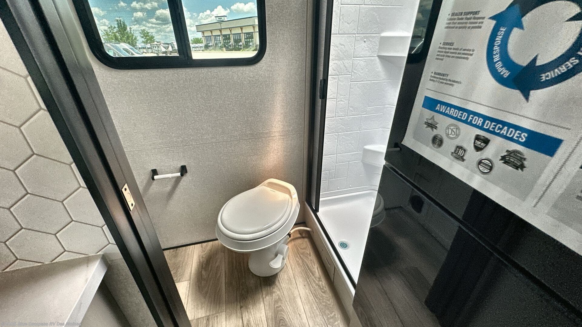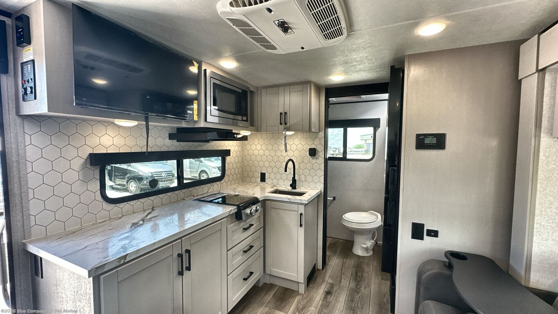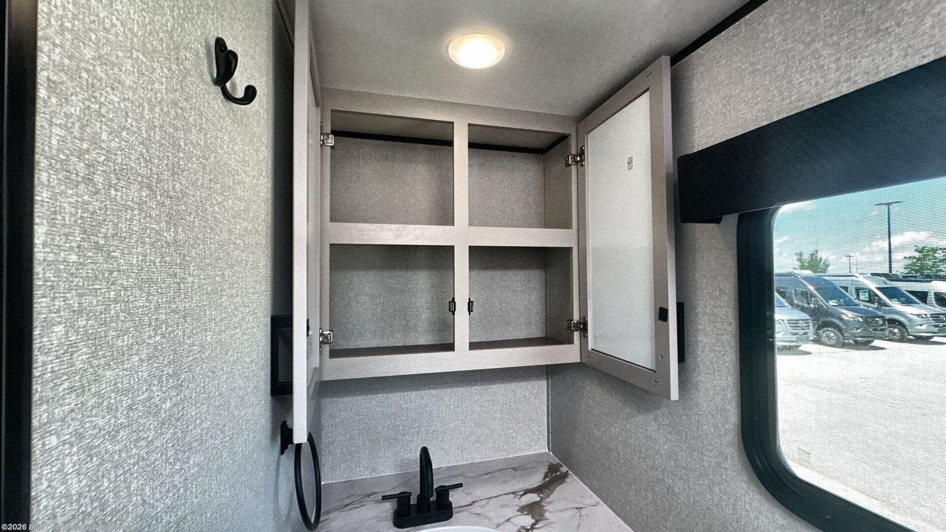 This travel trailer will feel just like home with its front queen bed, full rear bath, and fully-equipped kitchen! There is a jack-knife sofa slide out where you can relax each day, and there are swivel tables so you can enjoy meals here too. The LED Smart TV will let you stay in and watch movies if the weather isn't cooperating, or you can grab the fishing gear from the outside storage and weather the storm! You'll also find plenty of interior storage in the multiple overhead cabinets and the bath medicine cabinet!