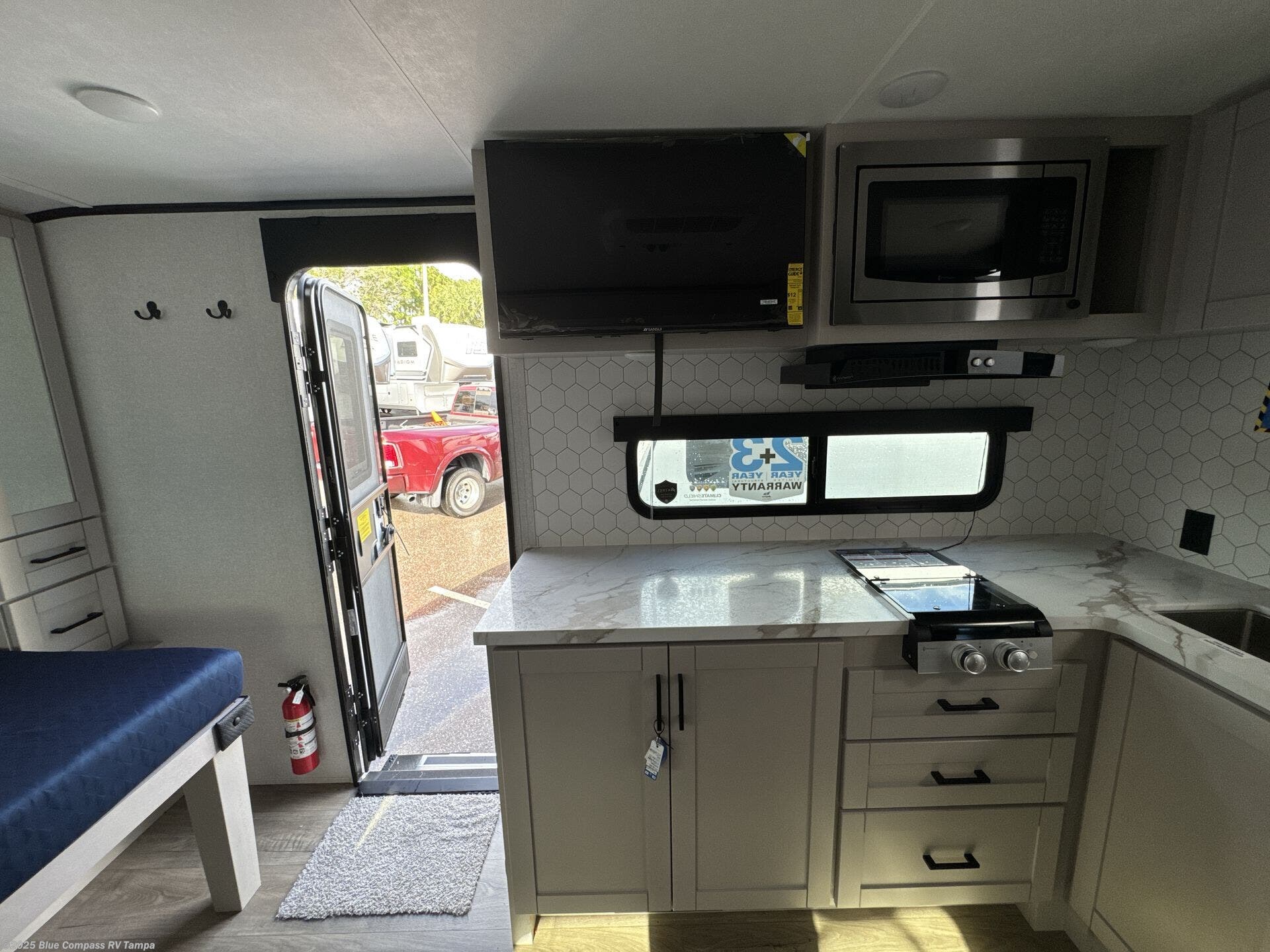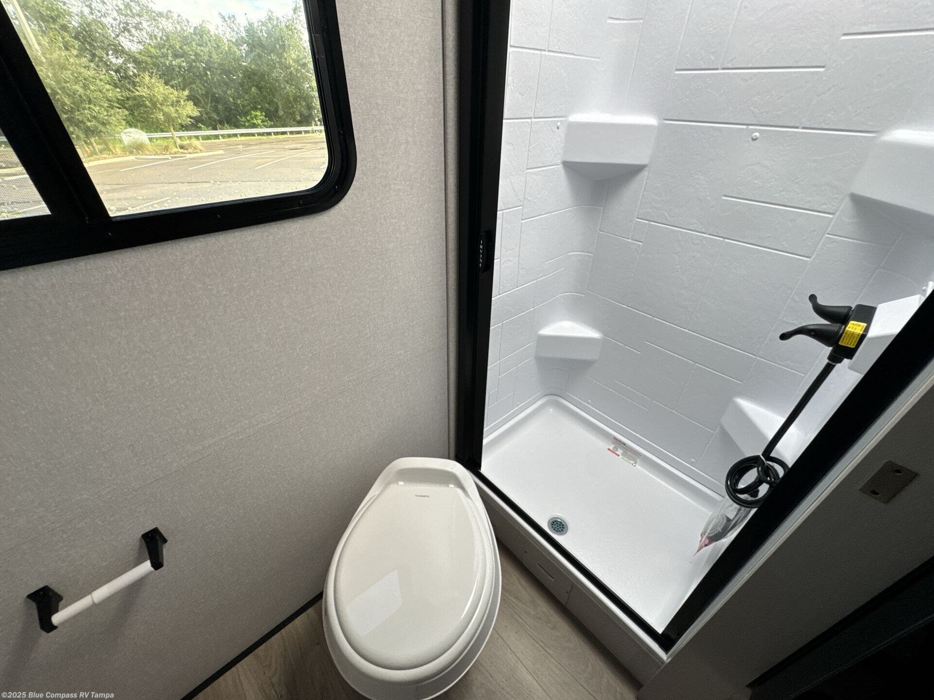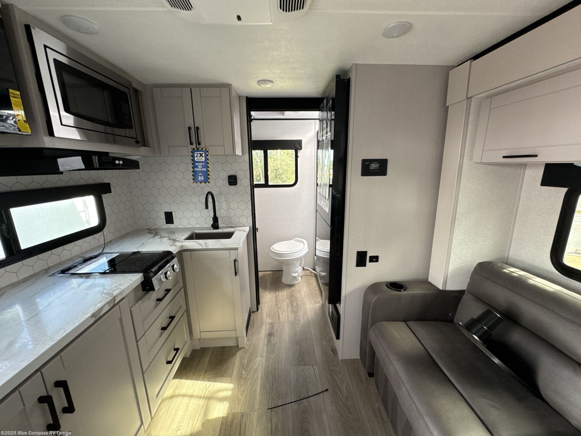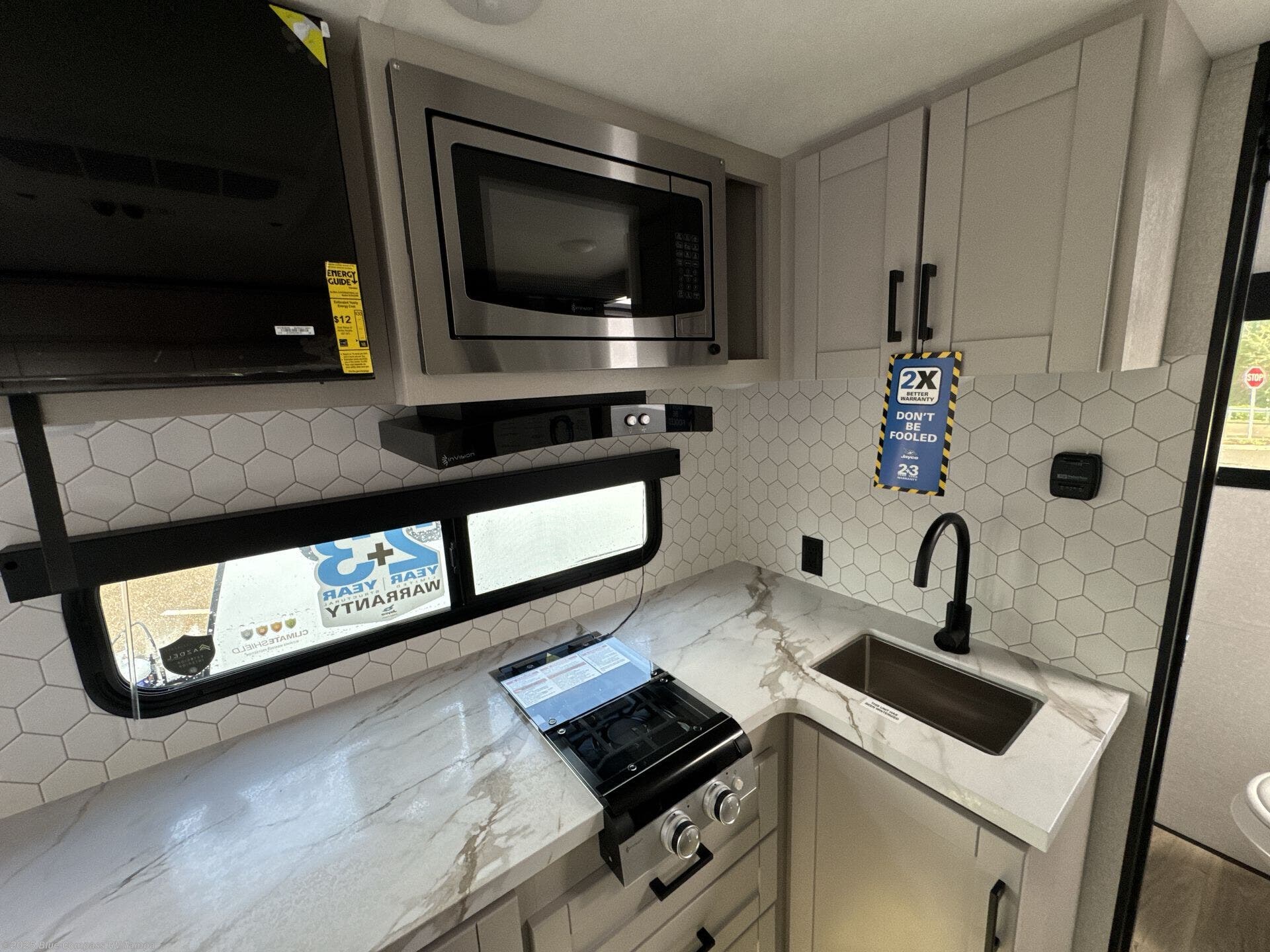This travel trailer will feel just like home with its front queen bed, full rear bath, and fully-equipped kitchen! There is a jack-knife sofa slide out where you can relax each day, and there are swivel tables so you can enjoy meals here too. The LED Smart TV will let you stay in and watch movies if the weather isn't cooperating, or you can grab the fishing gear from the outside storage and weather the storm! You'll also find plenty of interior storage in the multiple overhead cabinets and the bath medicine cabinet!