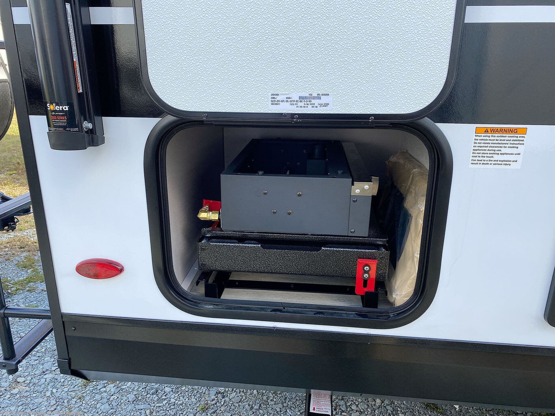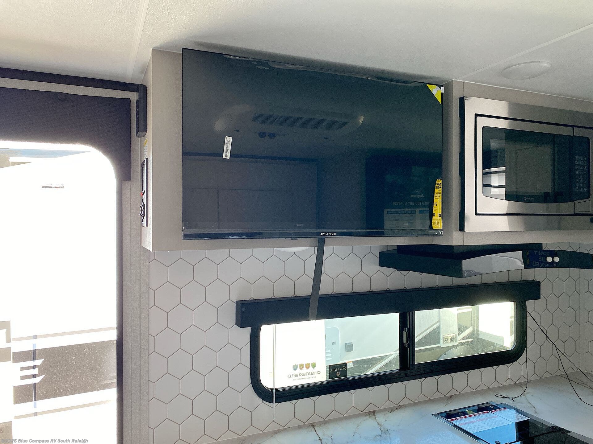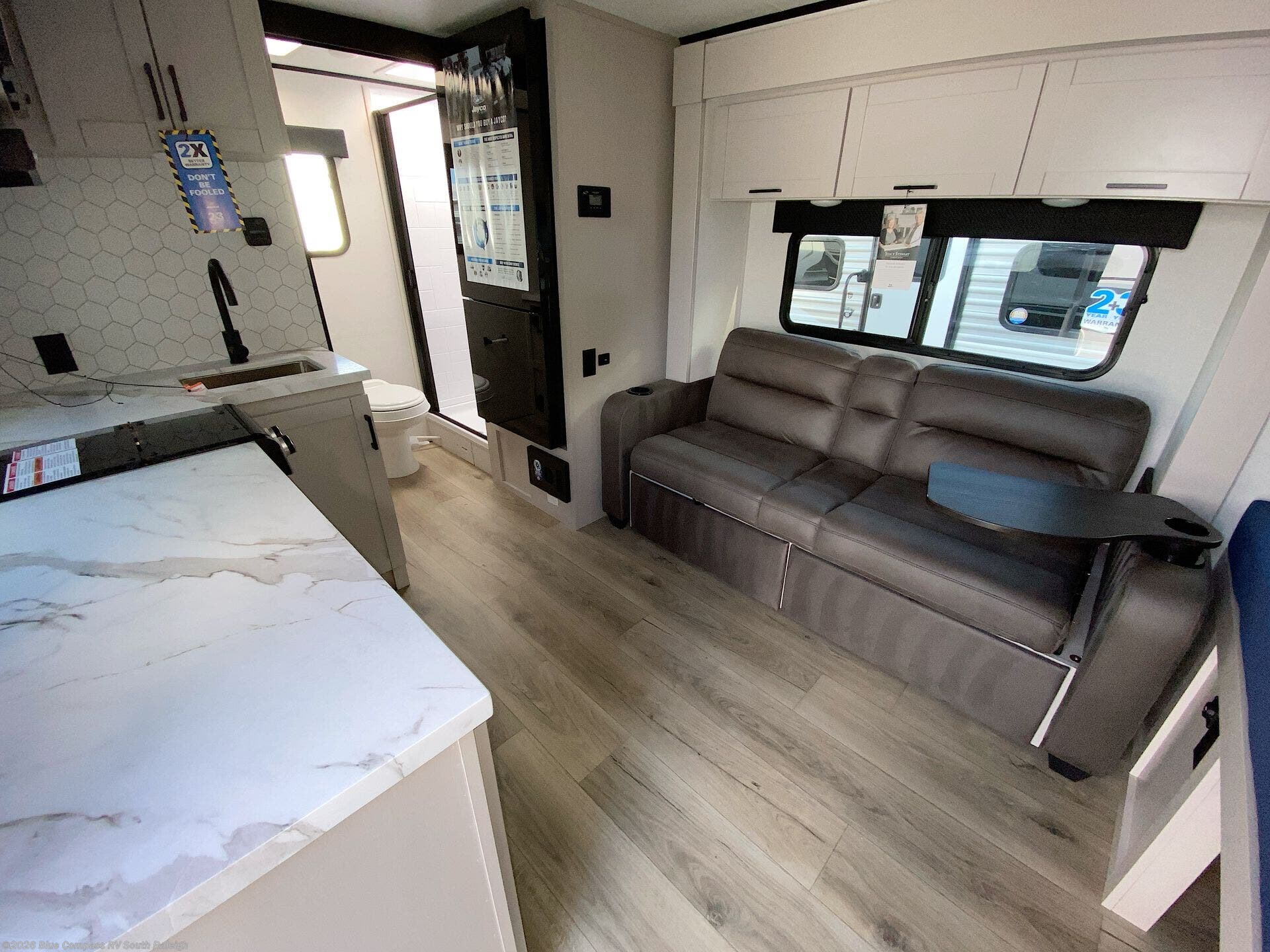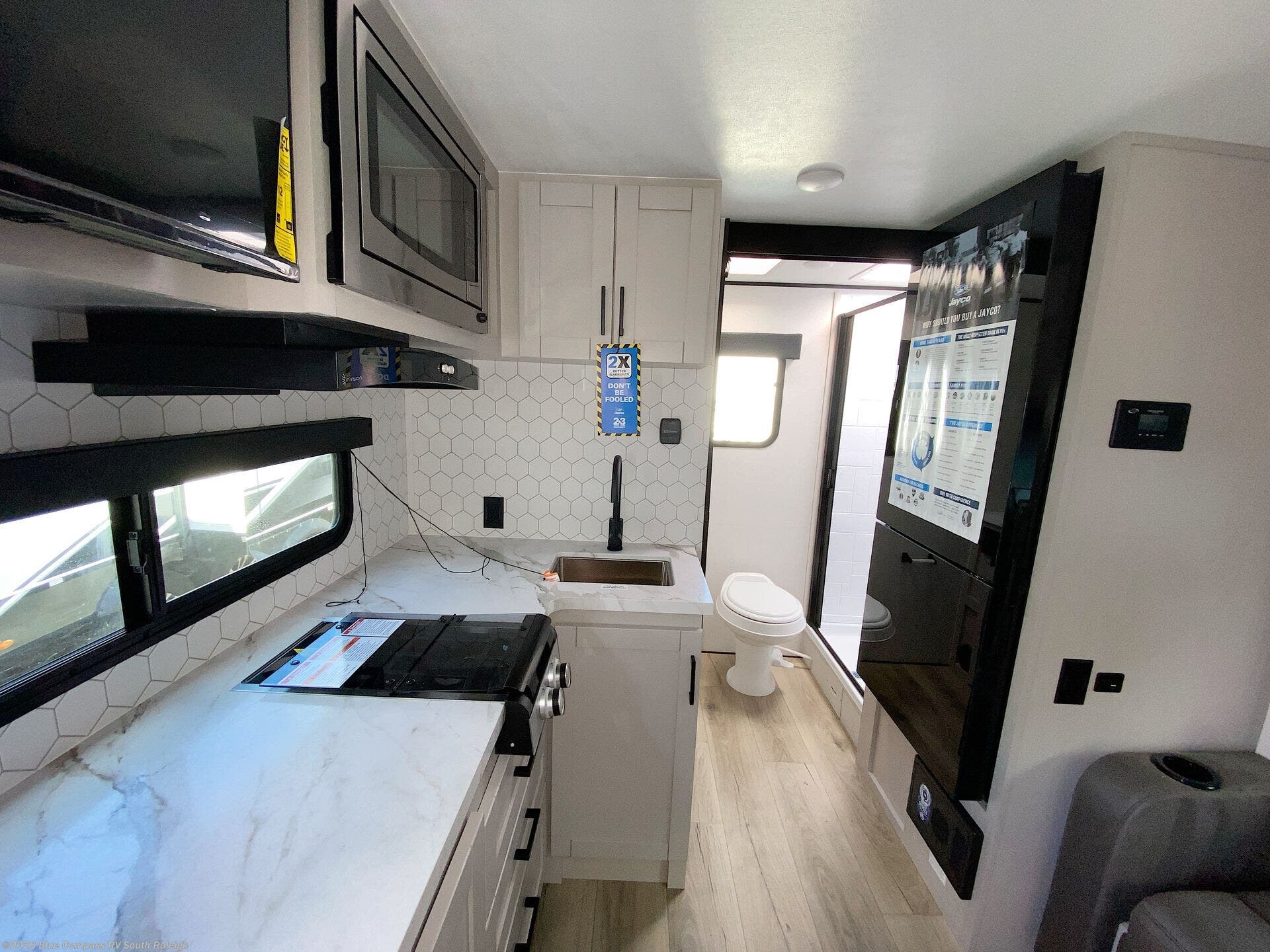 This travel trailer will feel just like home with its front queen bed, full rear bath, and fully-equipped kitchen! There is a jack-knife sofa slide out where you can relax each day, and there are swivel tables so you can enjoy meals here too. The LED Smart TV will let you stay in and watch movies if the weather isn't cooperating, or you can grab the fishing gear from the outside storage and weather the storm! You'll also find plenty of interior storage in the multiple overhead cabinets and the bath medicine cabinet!