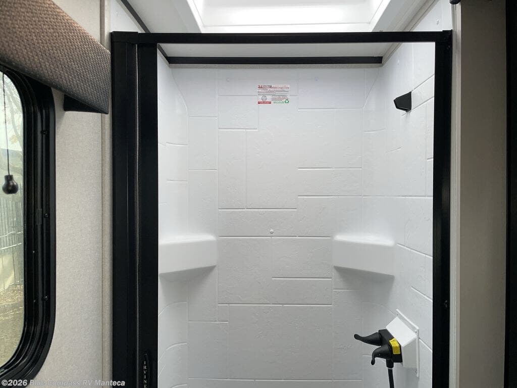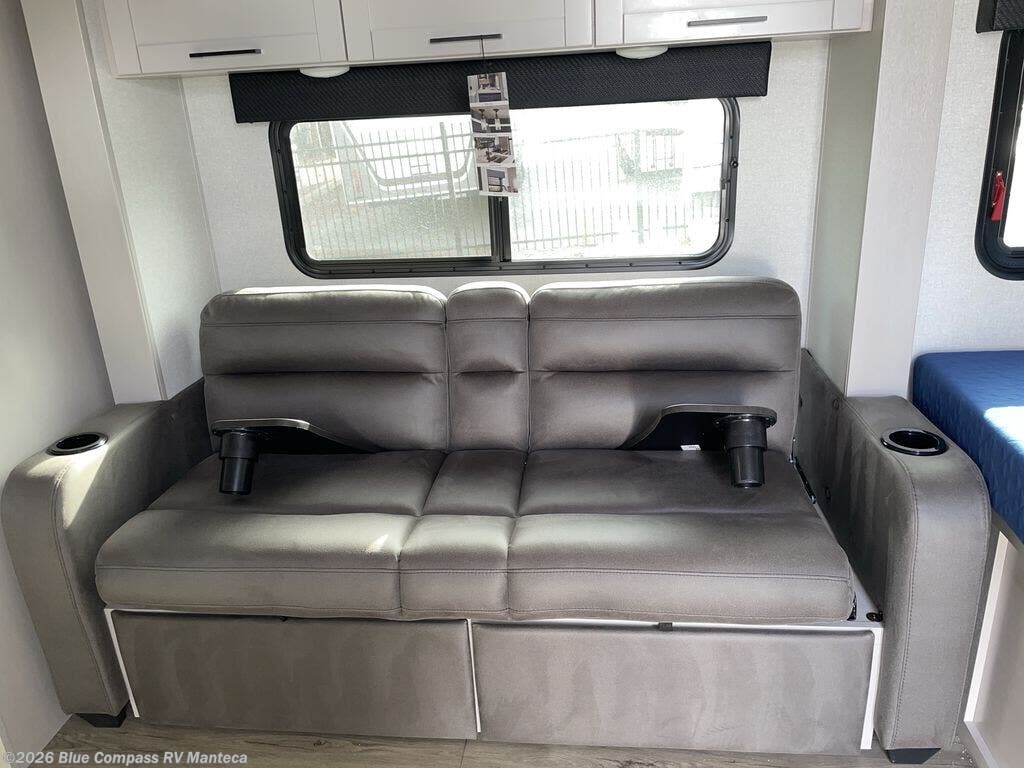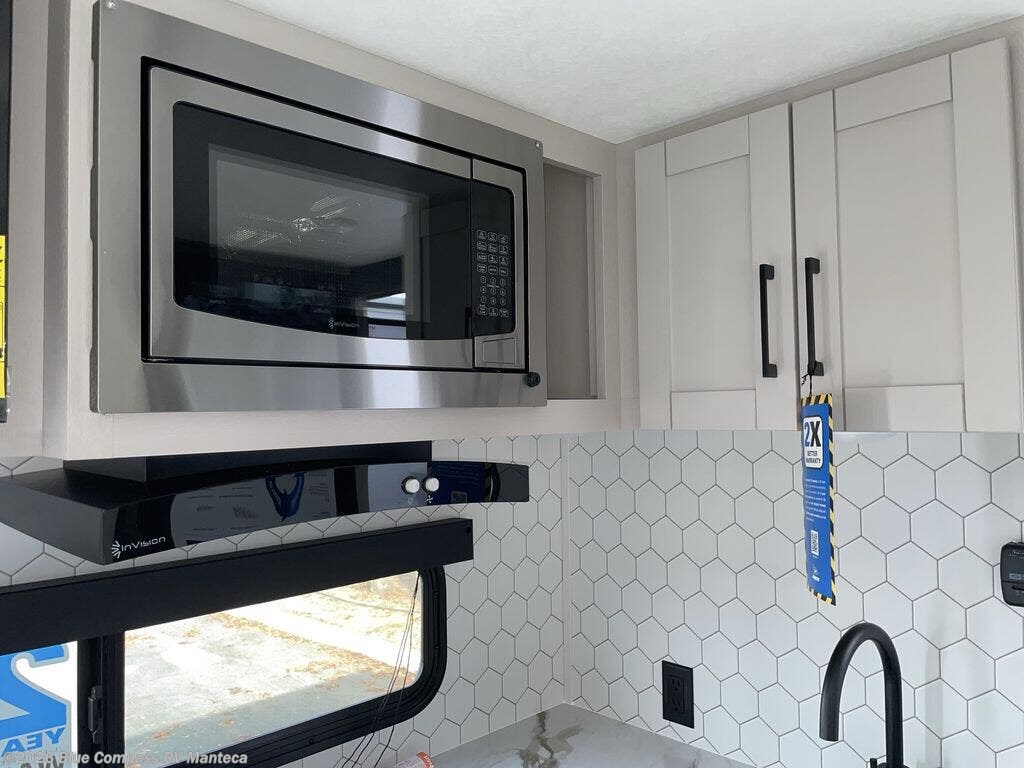 This travel trailer will feel just like home with its front queen bed, full rear bath, and fully equipped kitchen! There is a jack-knife sofa slide out where you can relax each day, and there are swivel tables so you can enjoy meals here too. The LED Smart TV will let you stay in and watch movies if the weather isn't cooperating, or you can grab the fishing gear from the outside storage and weather the storm! You'll also find plenty of interior storage in the multiple overhead cabinets and the bath medicine cabinet!