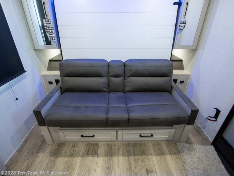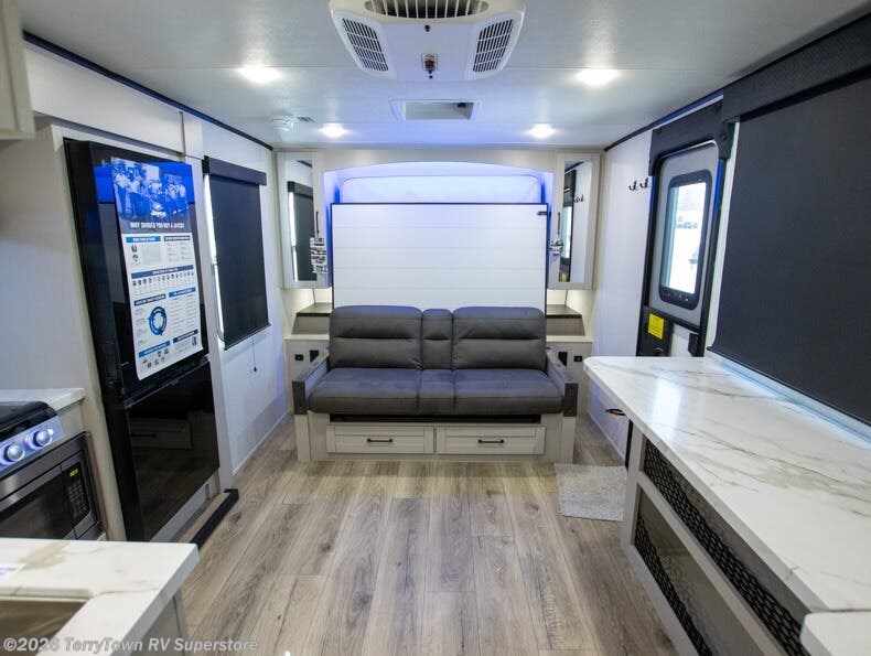 Light on weight doesn't mean light on features, and this Jay Feather Air proves that! You will appreciate the added space thanks to the kitchen slide out that houses the 11-cu. ft. 12V refrigerator and two burner cooktop. Your crew can enjoy meals together at the dining bar with a hinged top and two stools, or you can take your plate outdoors to sit under the 15' power awning with LED lights. The front Murphy bed can be folded away during the day so you can relax on the sofa, and your guests can make their bunk beds before heading out for the day. This model also includes ample storage space, including a pantry/wardrobe, overhead cabinets, dual bedside wardrobes, and outside storage!