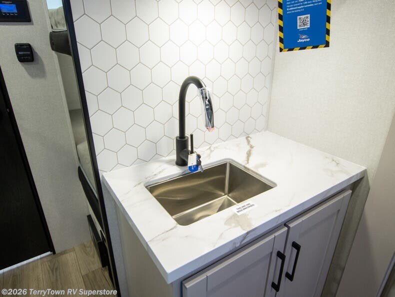 With any Jay Feather Air travel trailer by Jayco, you will enjoy lightweight towing and a variety of features to make each camping trip count! The Climate Shield insulation system helps by keeping you comfortable even in extreme weather conditions, and the Rock Solid jacks create a firm, steady foundation so your trailer feels solid underfoot and an easy setup. A rear roof ladder lets you easily clean the top of your Magnum Truss roof, and the 2" receiver will be perfect for your bike rack. The Overland 1 Solar Package with a 200W solar panel and 30-amp controller will provide off-grid capabilities, or you can choose the optional Overland 2 Solar Package with two panels instead! Each Jay Feather Air includes seamless countertops throughout, along with stainless steel sinks, decorative backsplash, and roller shades with a radiant barrier backer to help keep the sun's rays out.