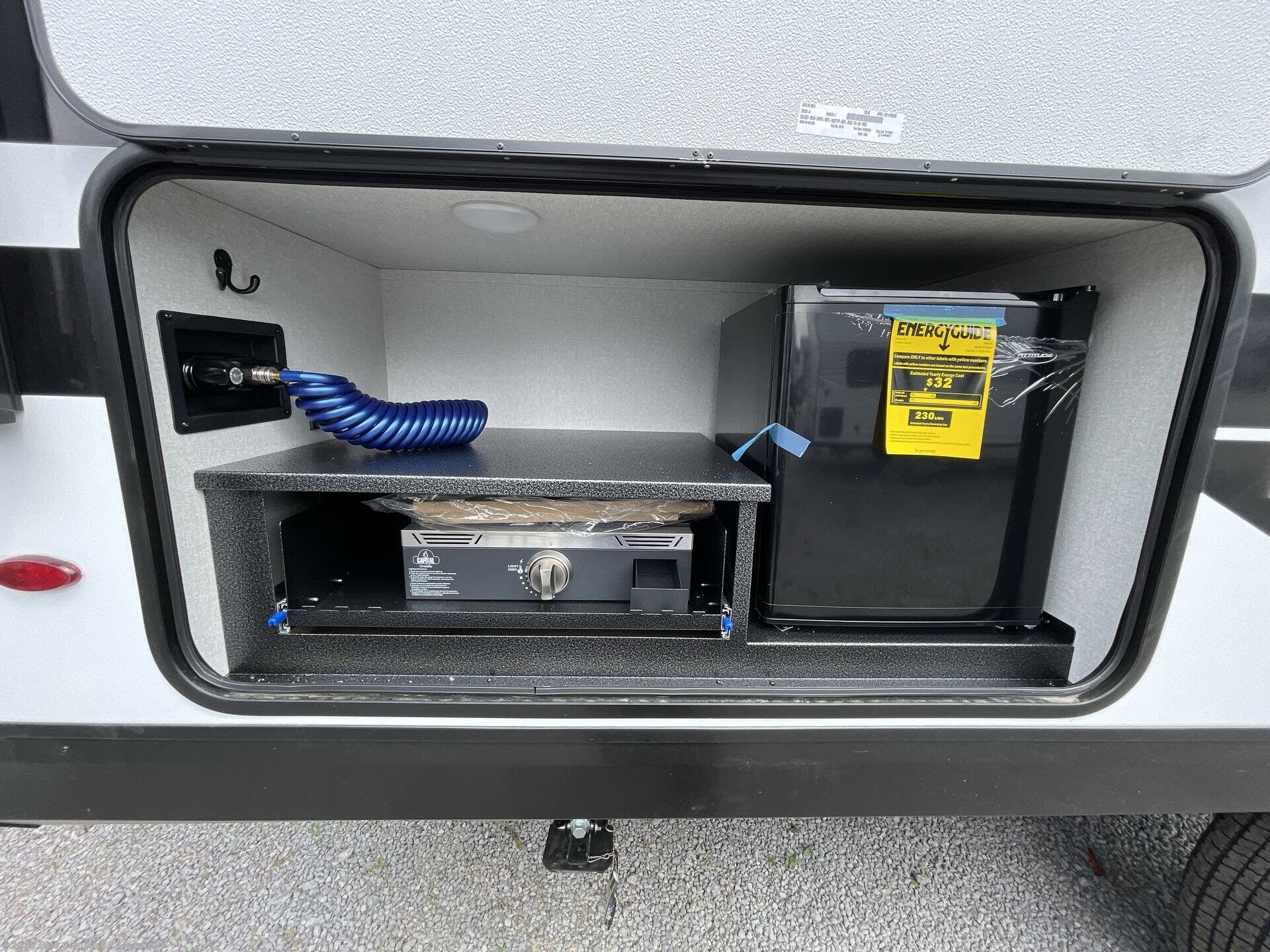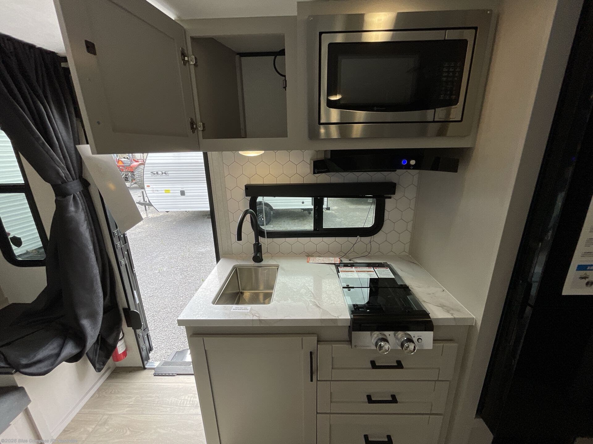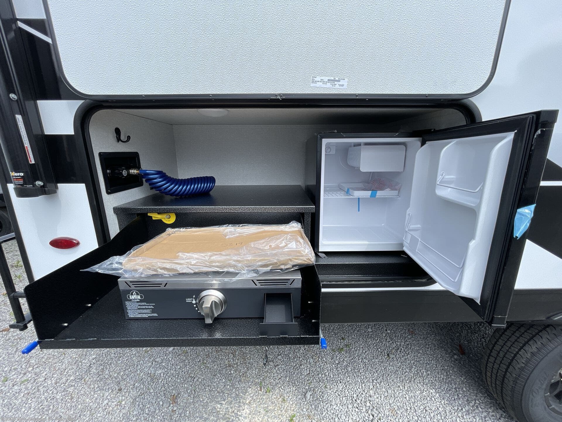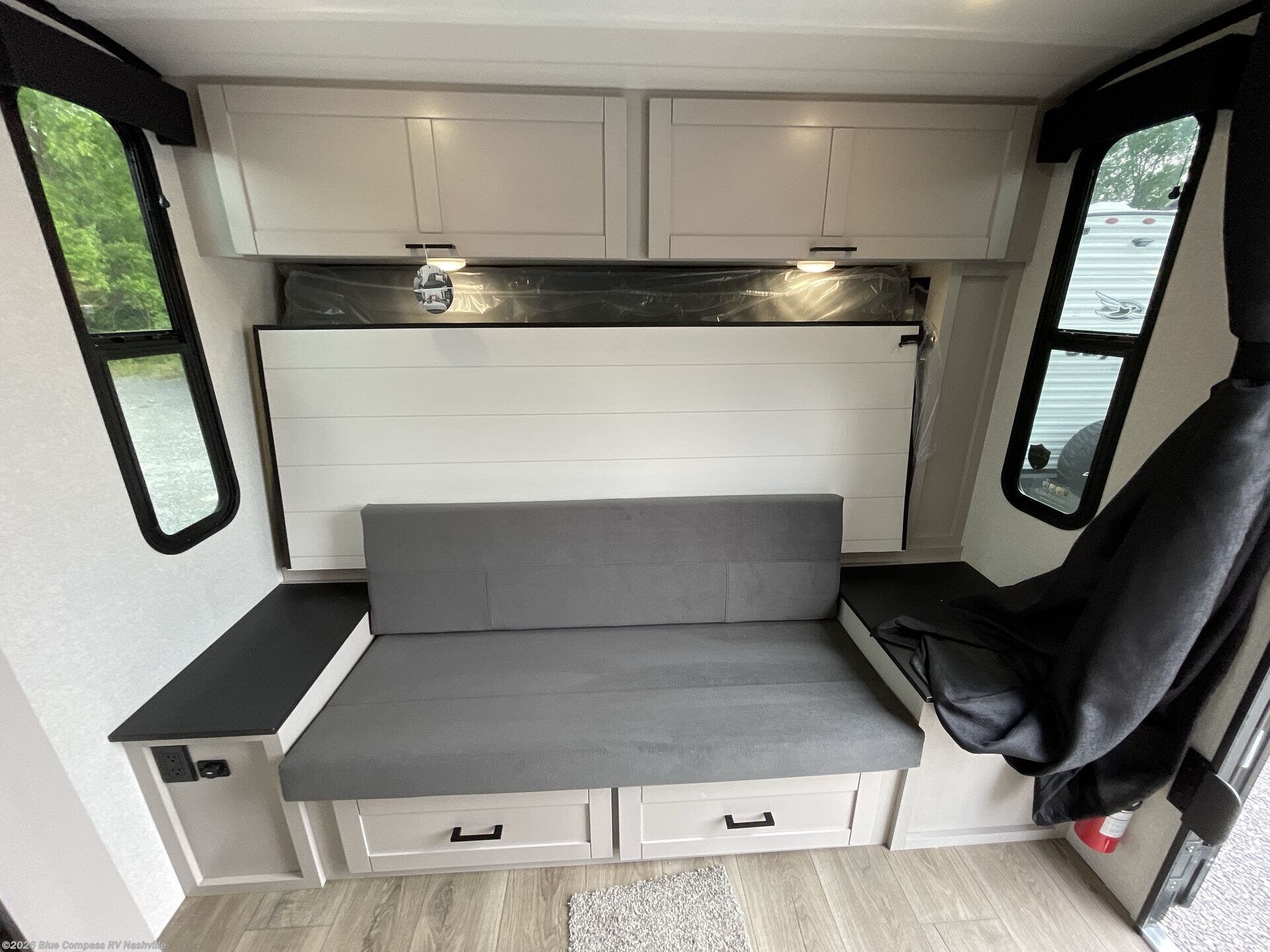 The double-size bunks in this travel trailer mean more friends and family can tag along! Once you arrive at the campground, you can put out the 15' power awning, unload the exterior storage and start lunch on the exterior griddle. A full kitchen indoors will let you make meals here when the weather isn't cooperating. The booth dinette slide will be perfect for meals times, game night, and even additional sleeping space. Up front, you'll find a sofa to relax on during the day and a Murphy bed to sleep on at night; how convenient!