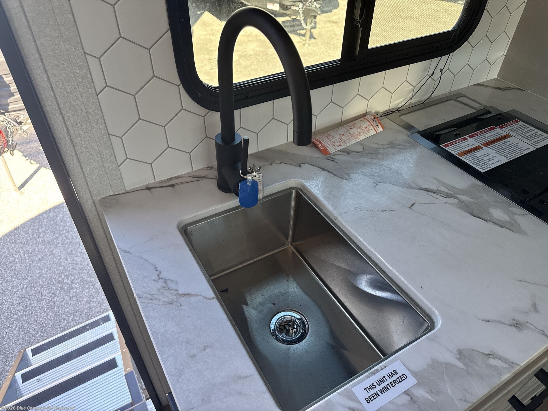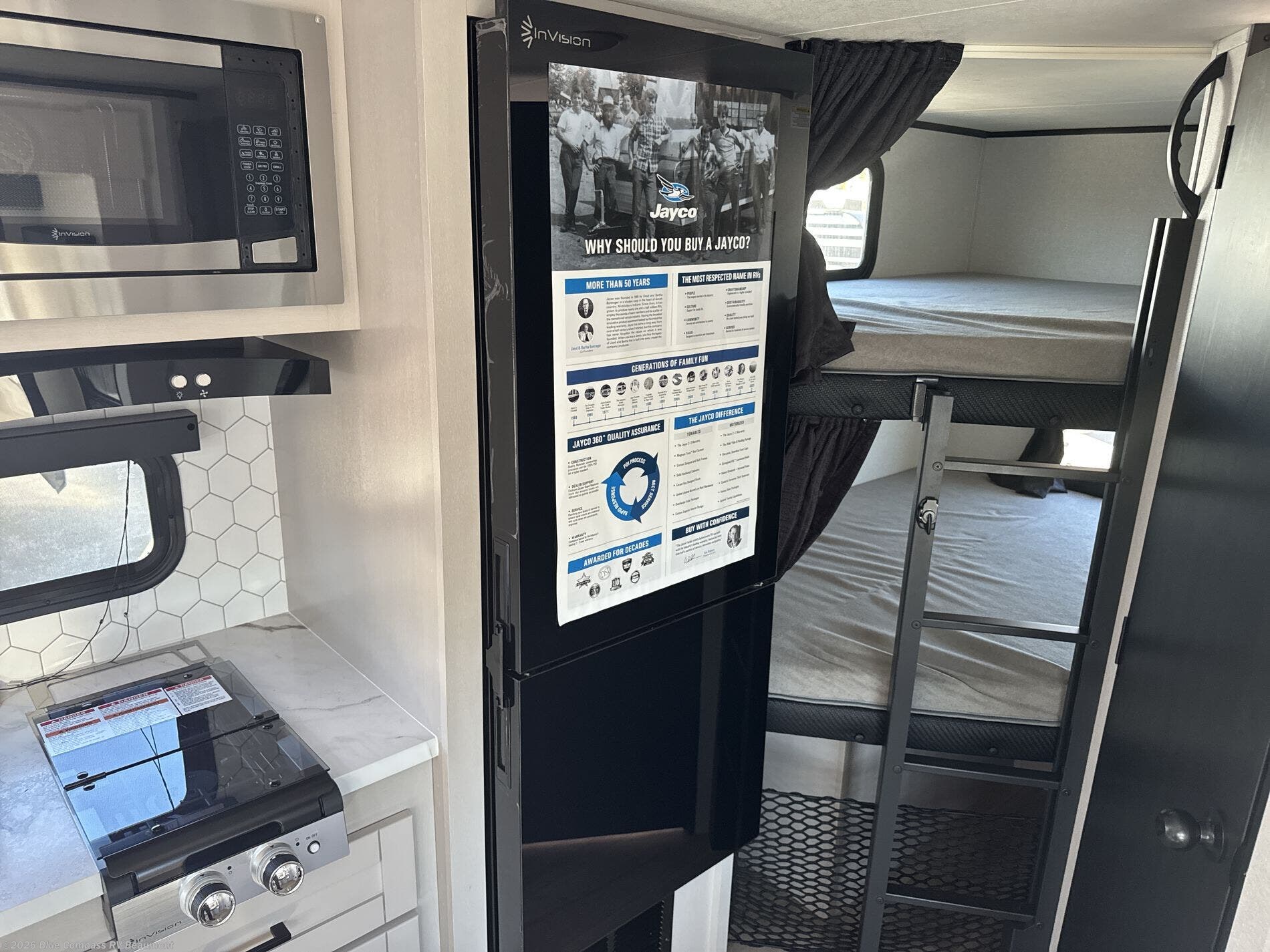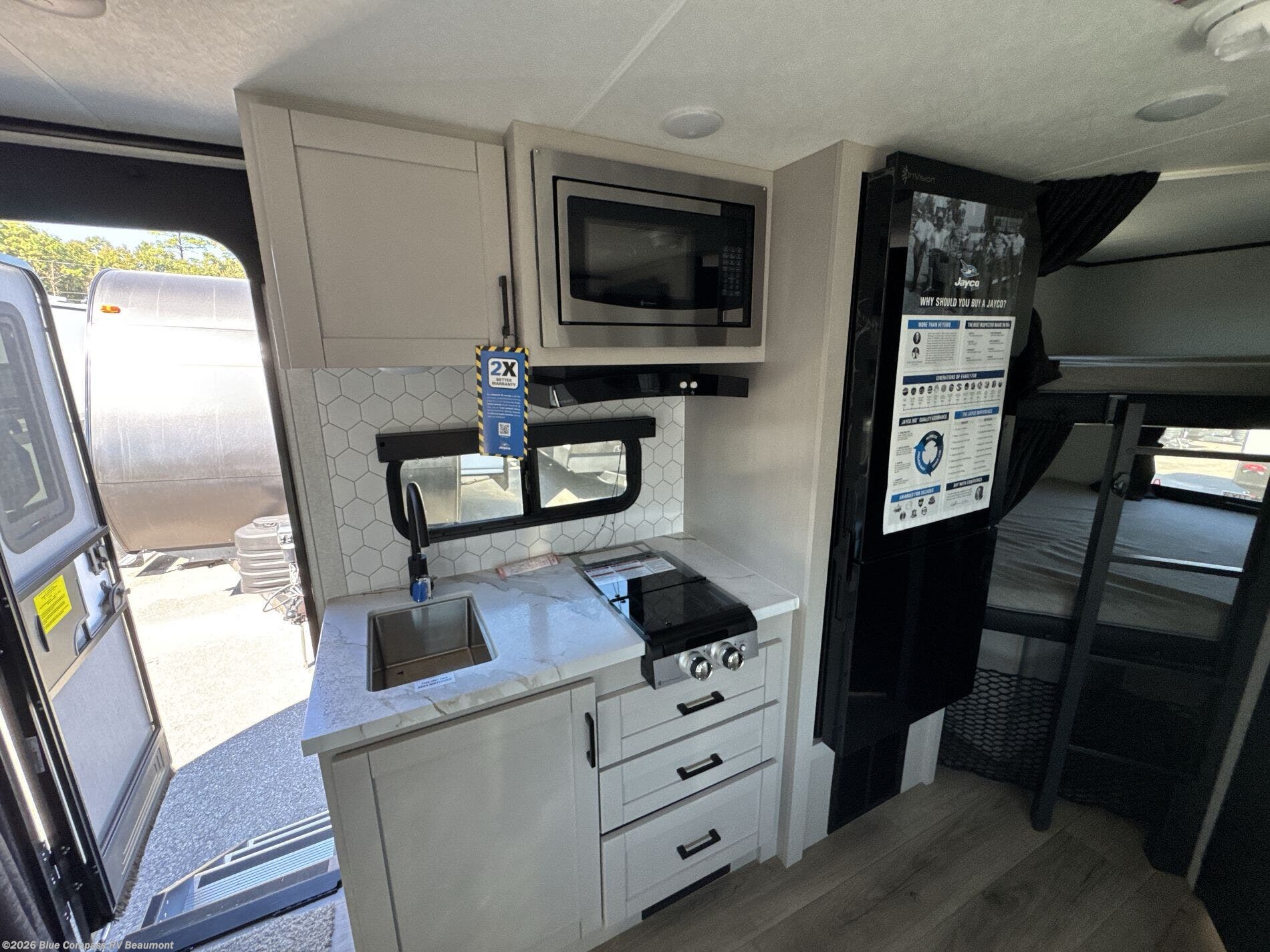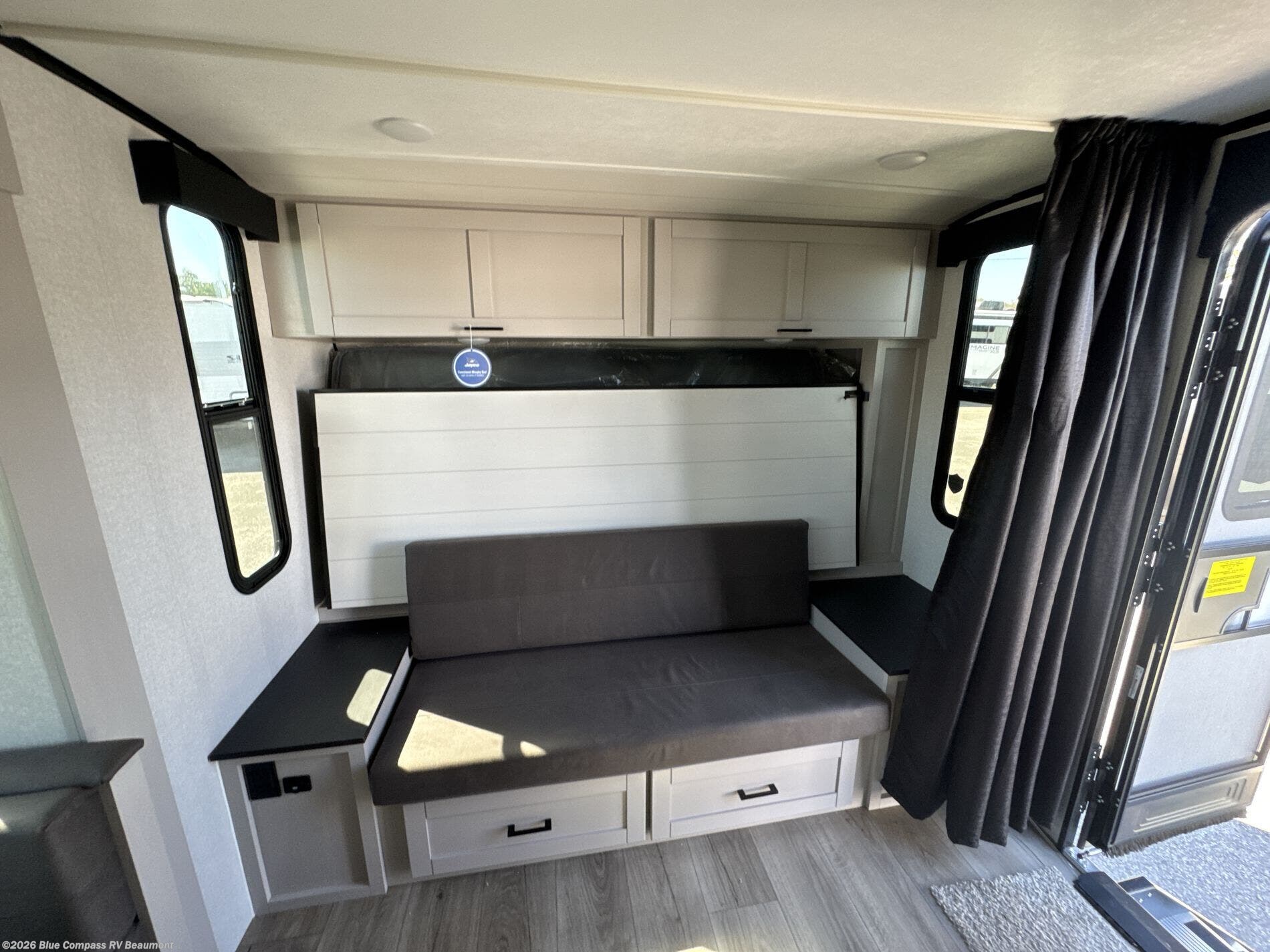 The double-size bunks in this travel trailer mean more friends and family can tag along! Once you arrive at the campground, you can put out the 15' power awning, unload the exterior storage and start lunch on the exterior griddle. A full kitchen indoors will let you make meals here when the weather isn't cooperating. The booth dinette slide will be perfect for meals times, game night, and even additional sleeping space. Up front, you'll find a sofa to relax on during the day and a Murphy bed to sleep on at night; how convenient!