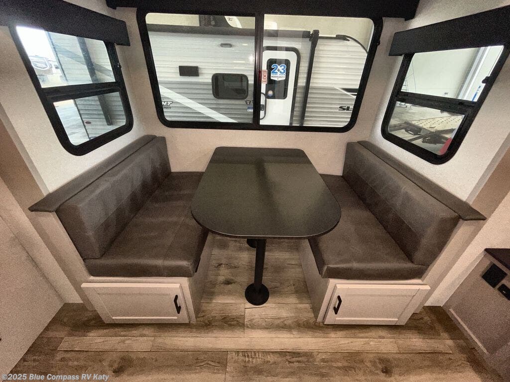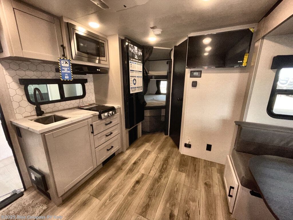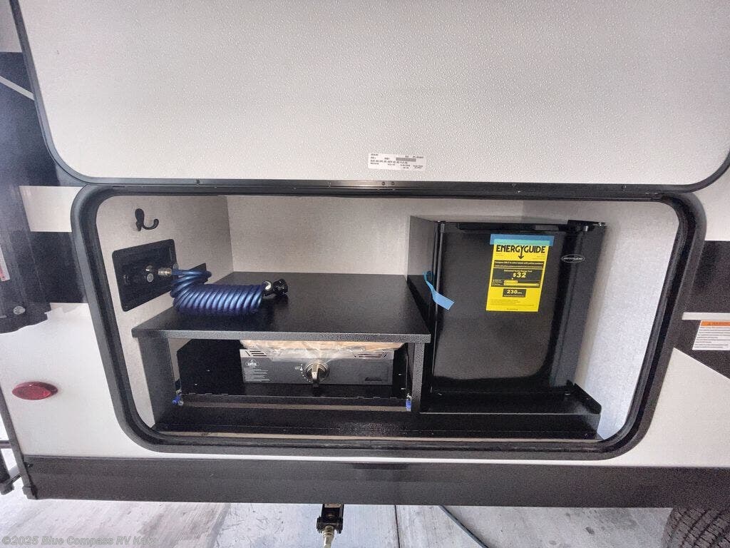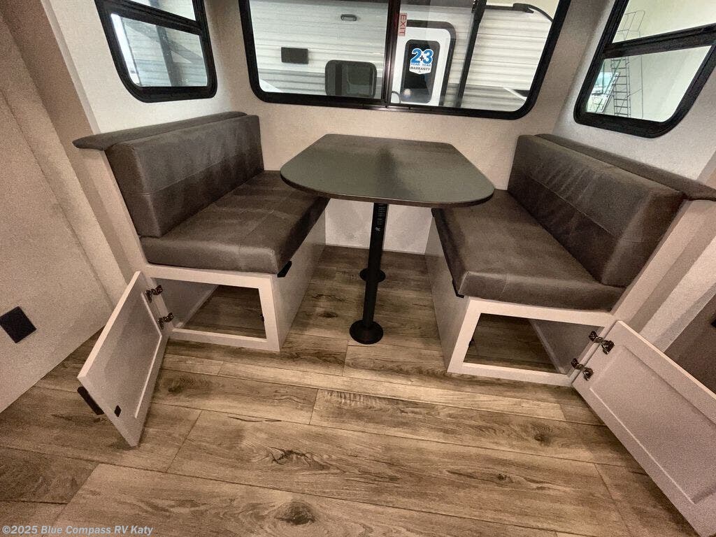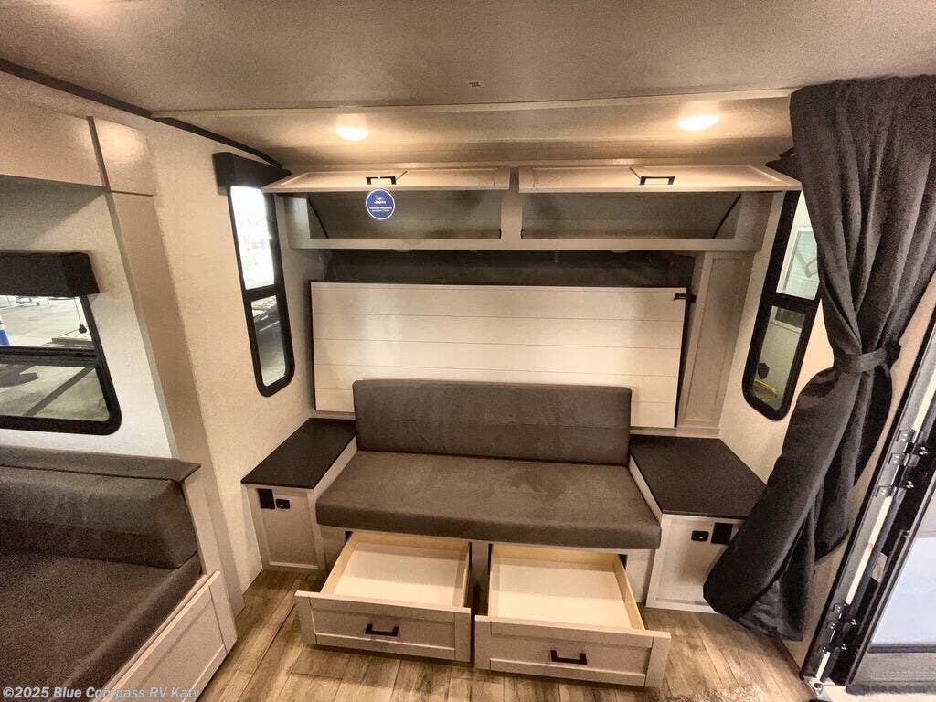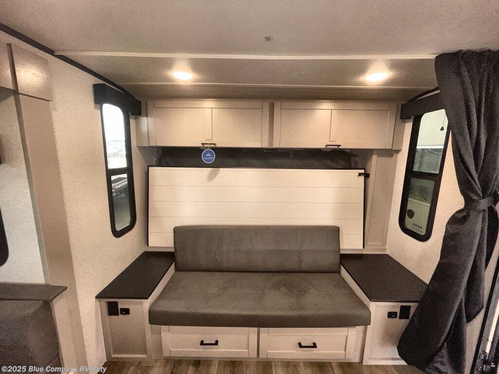 The double-size bunks in this travel trailer mean more friends and family can tag along! Once you arrive at the campground, you can put out the 15' power awning, unload the exterior storage and start lunch on the exterior griddle. A full kitchen indoors will let you make meals here when the weather isn't cooperating. The booth dinette slide will be perfect for meals times, game night, and even additional sleeping space. Up front, you'll find a sofa to relax on during the day and a Murphy bed to sleep on at night; how convenient!