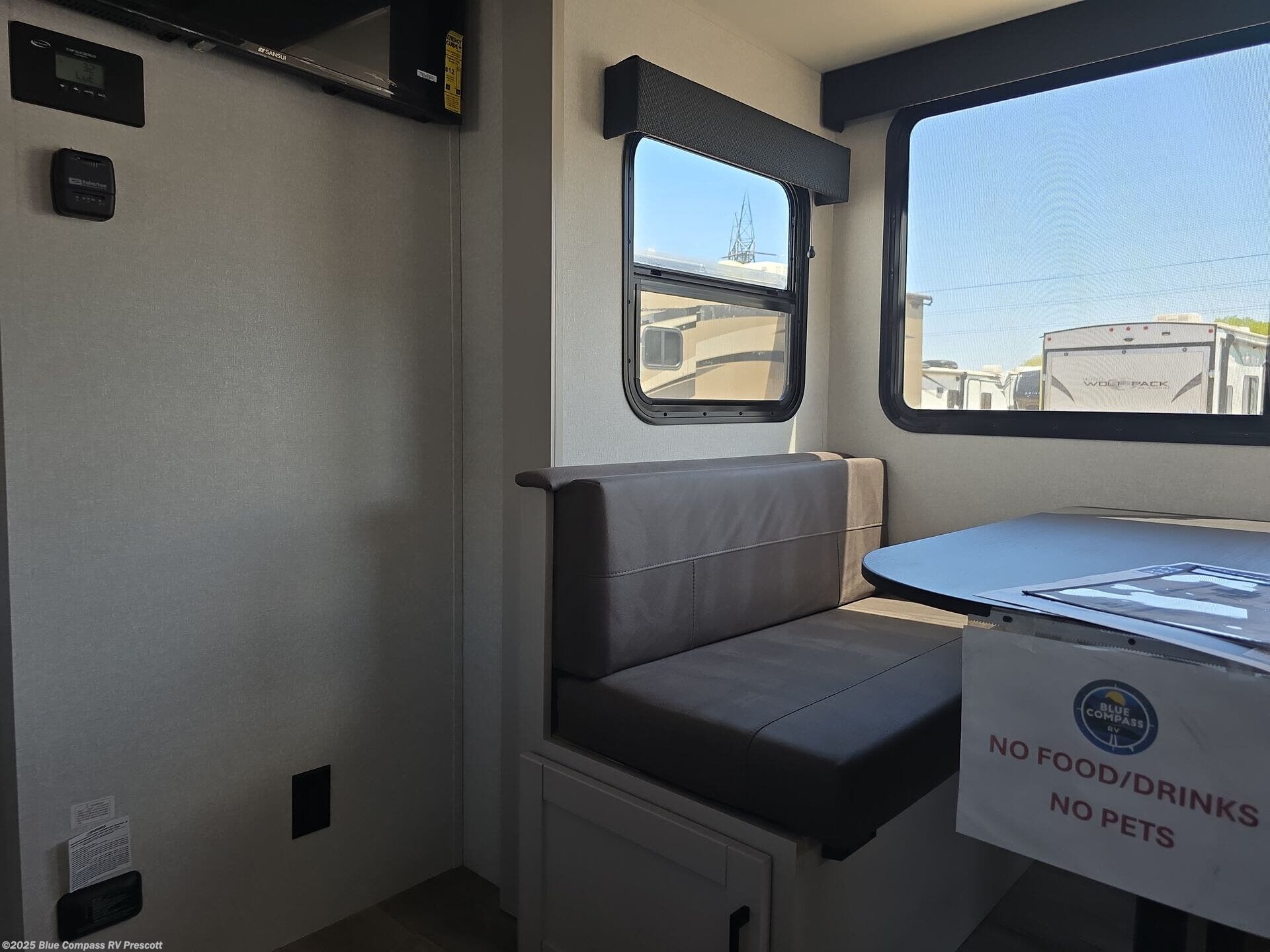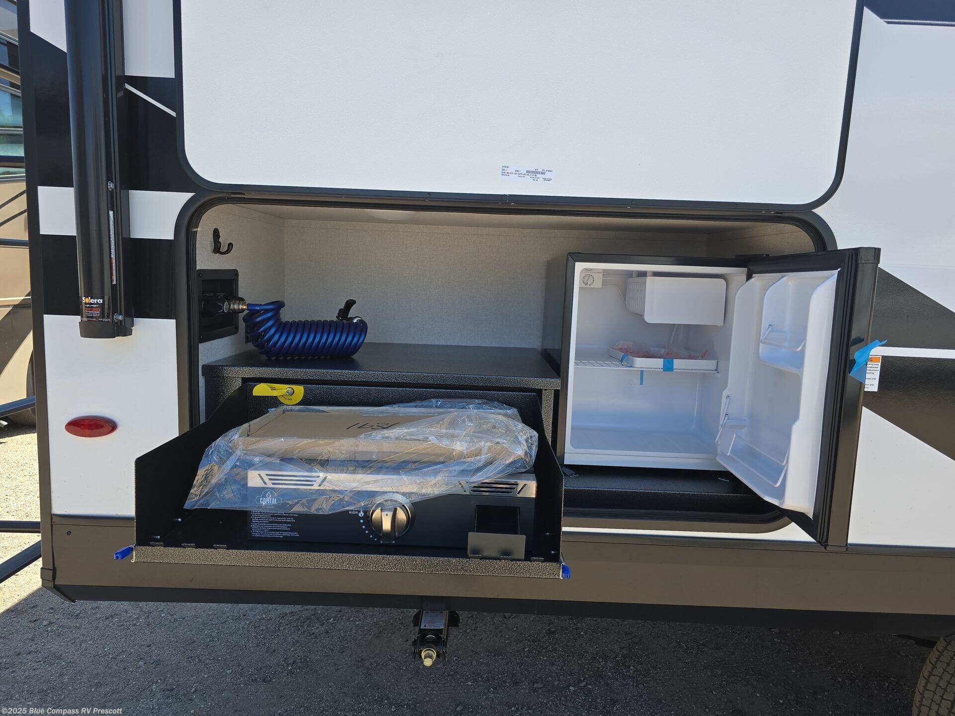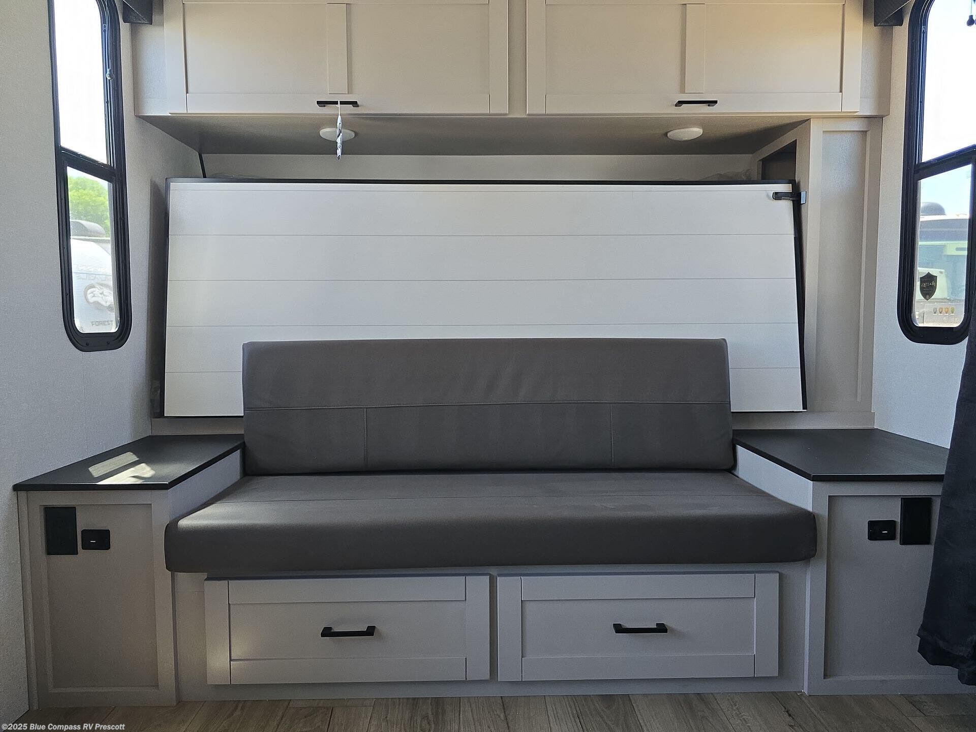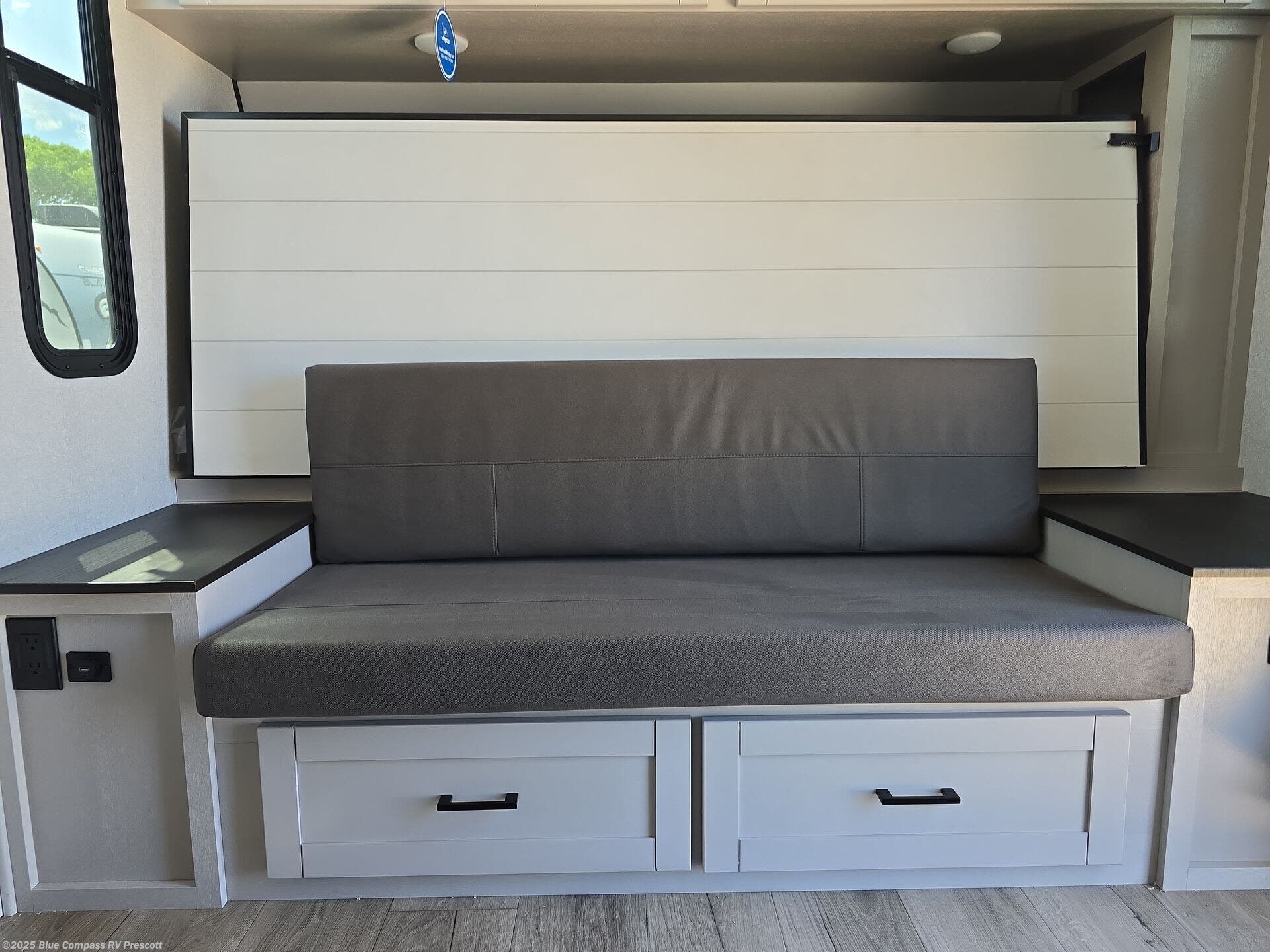 The double-size bunks in this travel trailer mean more friends and family can tag along! Once you arrive at the campground, you can put out the 15' power awning, unload the exterior storage and start lunch on the exterior griddle. A full kitchen indoors will let you make meals here when the weather isn't cooperating. The booth dinette slide will be perfect for meals times, game night, and even additional sleeping space. Up front, you'll find a sofa to relax on during the day and a Murphy bed to sleep on at night; how convenient!