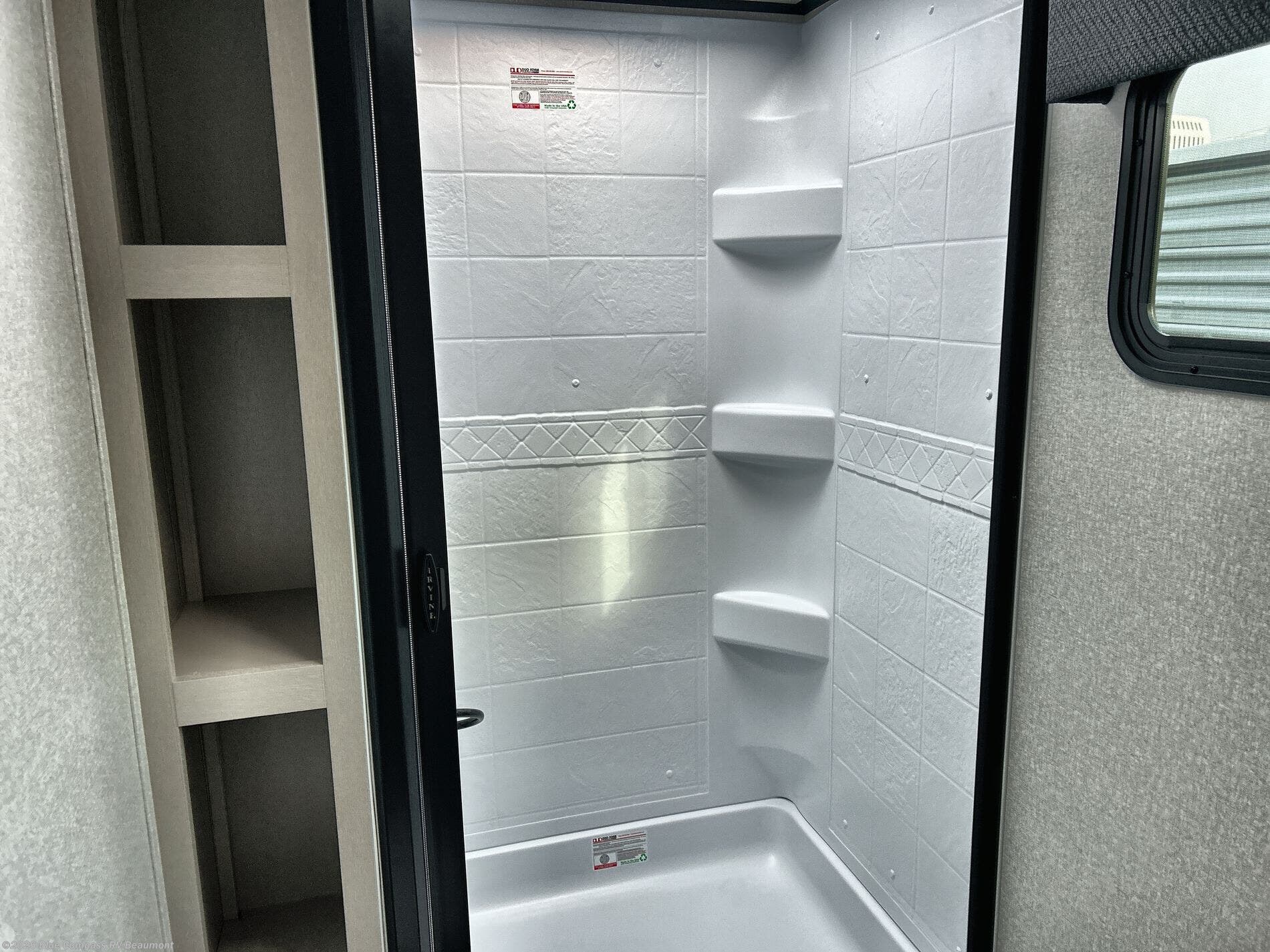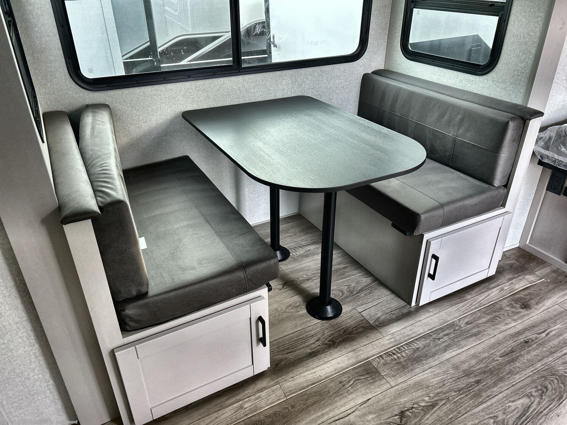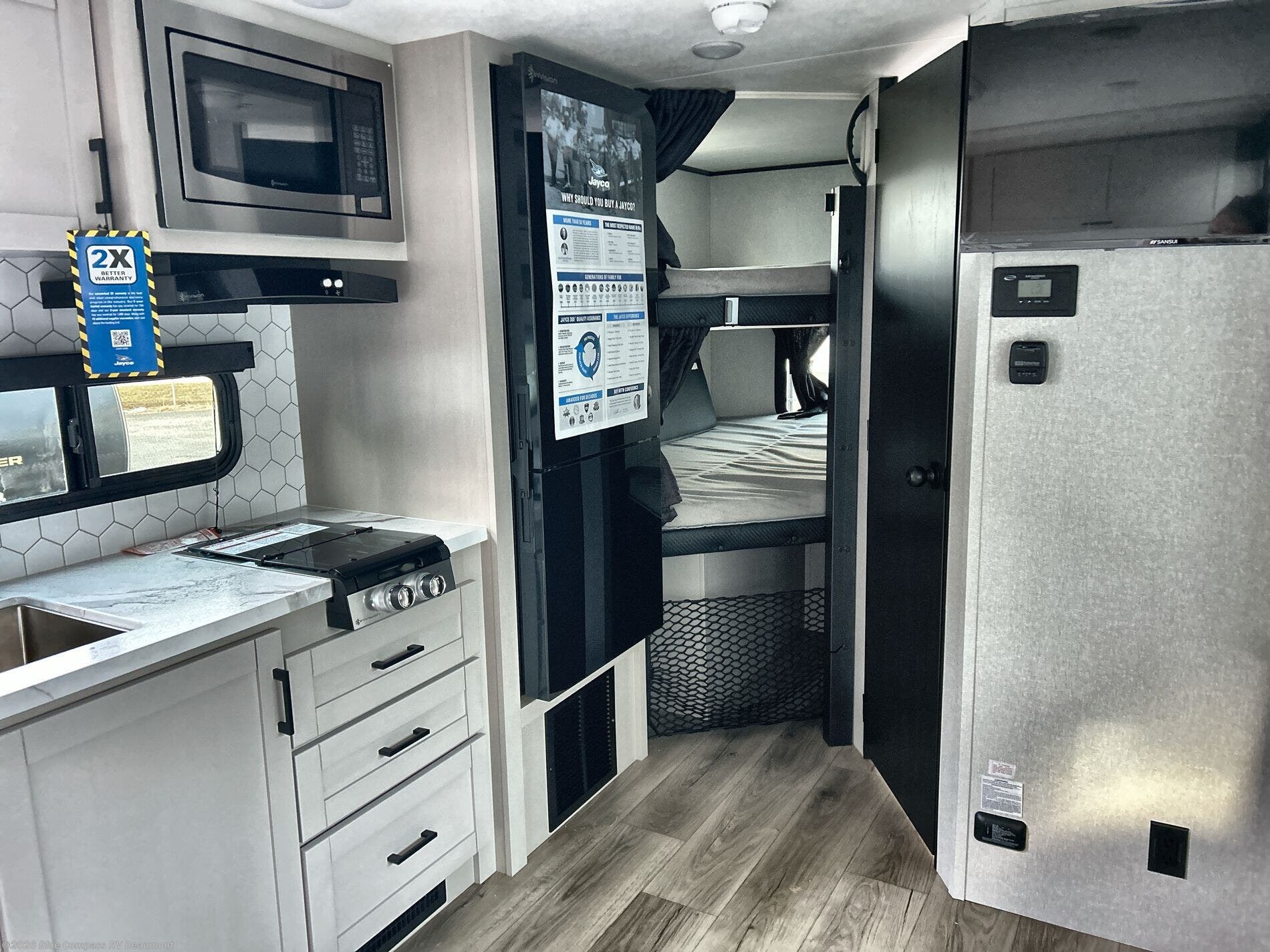 The double-size bunks in this travel trailer mean more friends and family can tag along! Once you arrive at the campground, you can put out the 15' power awning, unload the exterior storage and start lunch on the exterior griddle. A full kitchen indoors will let you make meals here when the weather isn't cooperating. The booth dinette slide will be perfect for meals times, game night, and even additional sleeping space. Up front, you'll find a sofa to relax on during the day and a Murphy bed to sleep on at night; how convenient!