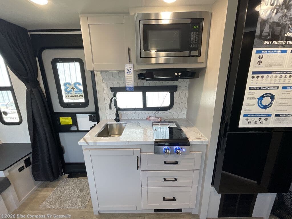 With any Jay Feather Air travel trailer by Jayco, you will enjoy lightweight towing and a variety of features to make each camping trip count! The Climate Shield insulation system helps extend your camping season by keeping you comfortable even in extreme weather conditions, and the Rock Solid stabilizer system means set up will be a breeze. An 18" rear roof ladder lets you easily clean the top of your Magnum Truss roof, and the 2" receiver will be perfect for your bike rack. The Overland 1 Solar Package with a 200W solar panel and 30-amp controller will provide off-grid capabilities, or you can can choose the optional Overland 2 Solar Package with two panels instead! Each Jay Feather Air includes residential-style seamless countertops inside, along with stainless steel sinks, decorative backsplash, and decorative roller shades with a reflective barrier to help keep the sun's rays out.