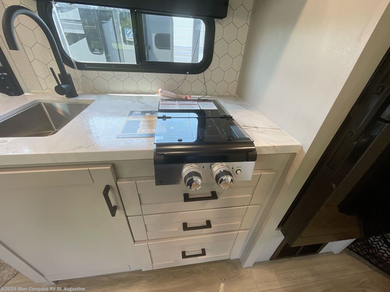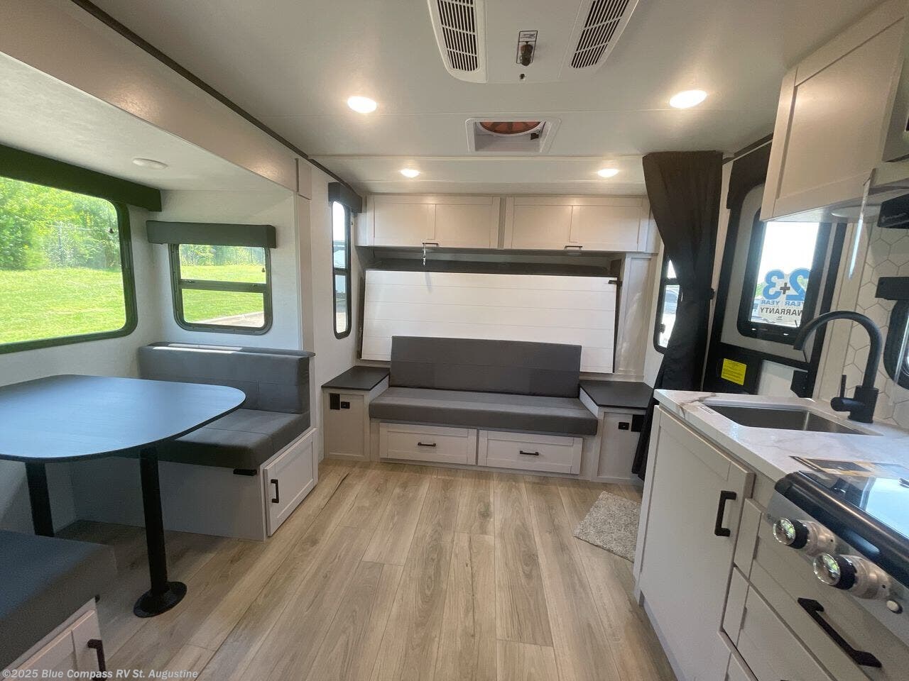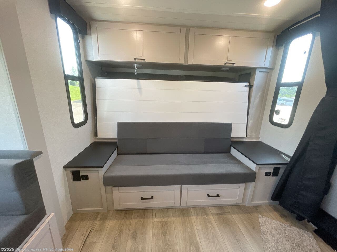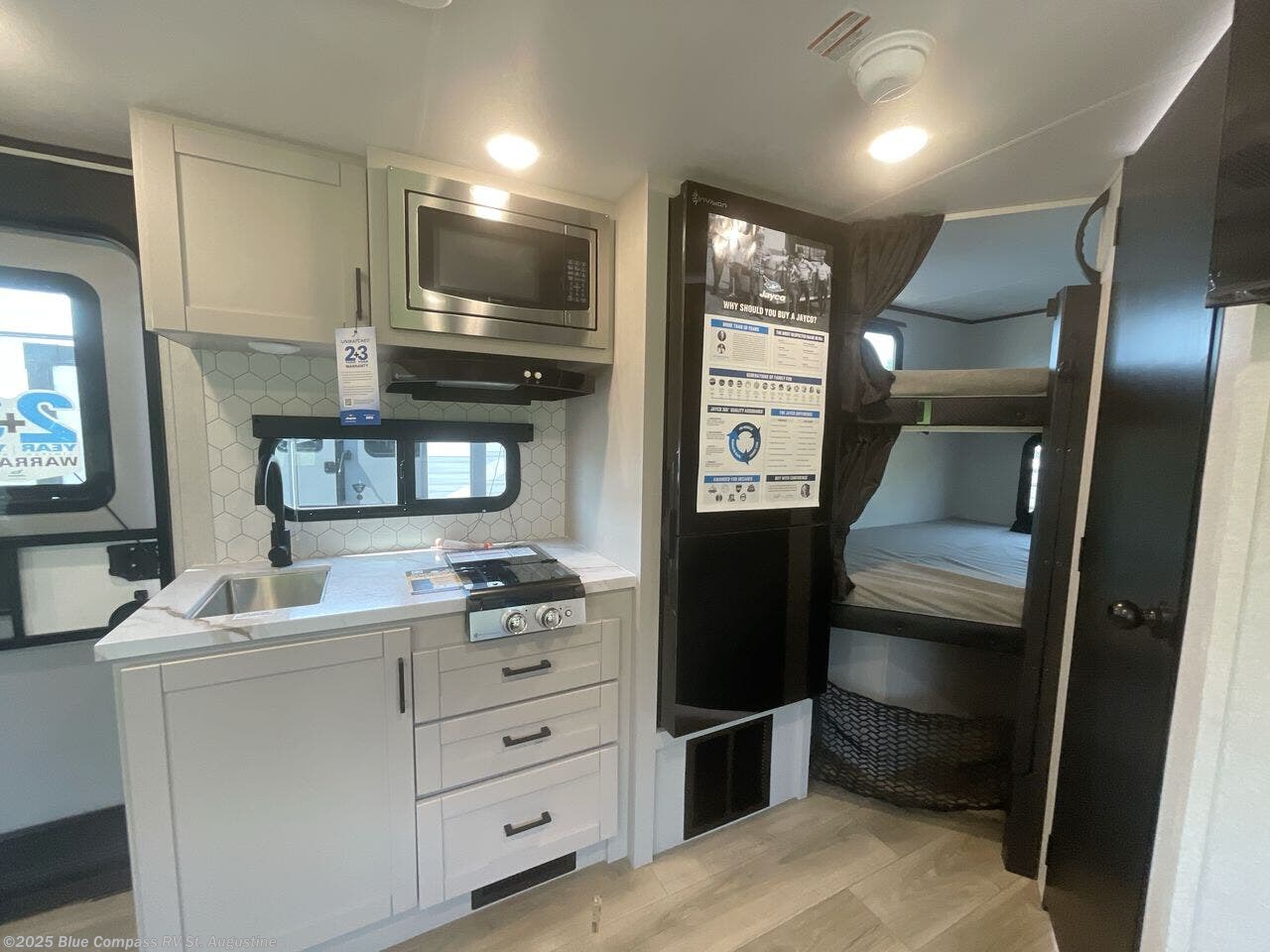 The double-size bunks in this travel trailer mean more friends and family can tag along! Once you arrive at the campground, you can put out the 15' power awning, unload the exterior storage and start lunch on the exterior griddle. A full kitchen indoors will let you make meals here when the weather isn't cooperating. The booth dinette slide will be perfect for meals times, game night, and even additional sleeping space. Up front, you'll find a sofa to relax on during the day and a Murphy bed to sleep on at night; how convenient!