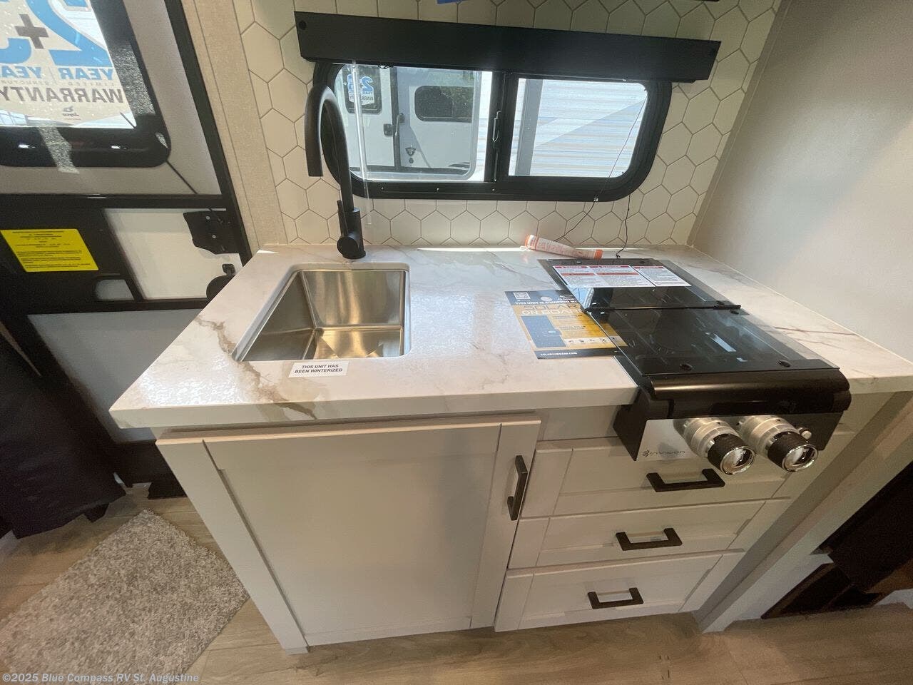 With any Jay Feather Air travel trailer by Jayco, you will enjoy lightweight towing and a variety of features to make each camping trip count! The Climate Shield insulation system helps extend your camping season by keeping you comfortable even in extreme weather conditions, and the Rock Solid stabilizer system means set up will be a breeze. An 18" rear roof ladder lets you easily clean the top of your Magnum Truss roof, and the 2" receiver will be perfect for your bike rack. The Overland 1 Solar Package with a 200W solar panel and 30-amp controller will provide off-grid capabilities, or you can can choose the optional Overland 2 Solar Package with two panels instead! Each Jay Feather Air includes residential-style seamless countertops inside, along with stainless steel sinks, decorative backsplash, and decorative roller shades with a reflective barrier to help keep the sun's rays out.