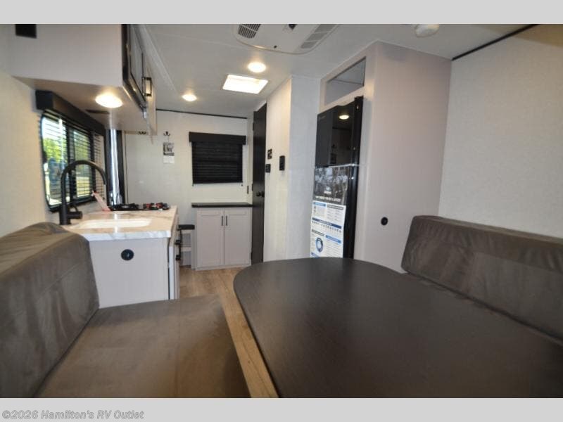 You'll love camping in this lightweight and versatile travel trailer! Once you've arrived at the campground and have unpacked your things, you can make a quick lunch on the two-burner cooktop. There are two 32" x 74" twin-size bed/benches that include a table for a king-size bed conversion, and you'll find a large overhead cabinet here to keep books or board games stored away. A private bath includes a shower and a toilet to easily clean up each day, and a dresser just outside the bath will let you keep clothes or towels organized. Don't let this cozy travel trailer slip away!