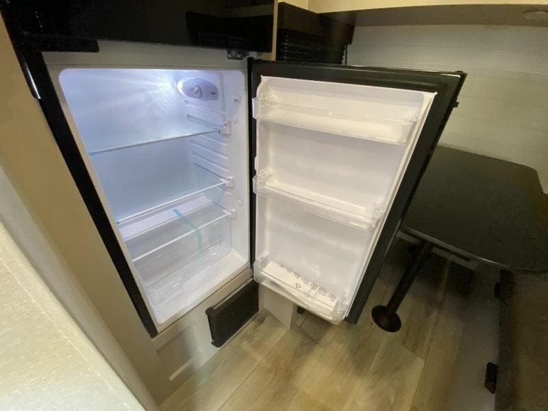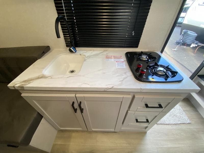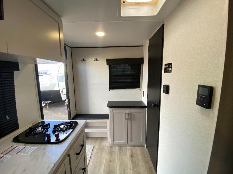 You'll love camping in this lightweight and versatile travel trailer! Once you've arrived at the campground and have unpacked your things, you can make a quick lunch on the two-burner cooktop. There are two 32" x 74" twin-size bed/benches that include a table for a king-size bed conversion, and you'll find a large overhead cabinet here to keep books or board games stored away. A private bath includes a shower and a toilet to easily clean up each day, and a dresser just outside the bath will let you keep clothes or towels organized. Don't let this cozy travel trailer slip away!