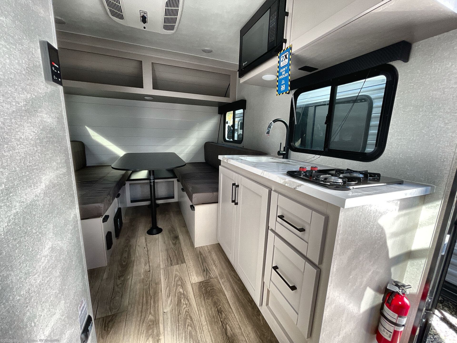 You'll love camping in this lightweight and versatile travel trailer! Once you've arrived at the campground and have unpacked your things, you can make a quick lunch on the two-burner cooktop. There are two 32" x 74" twin-size bed/benches that include a table for a king-size bed conversion, and you'll find a large overhead cabinet here to keep books or board games stored away. A private bath includes a shower and a toilet to easily clean up each day, and a dresser just outside the bath will let you keep clothes or towels organized. Don't let this cozy travel trailer slip away!