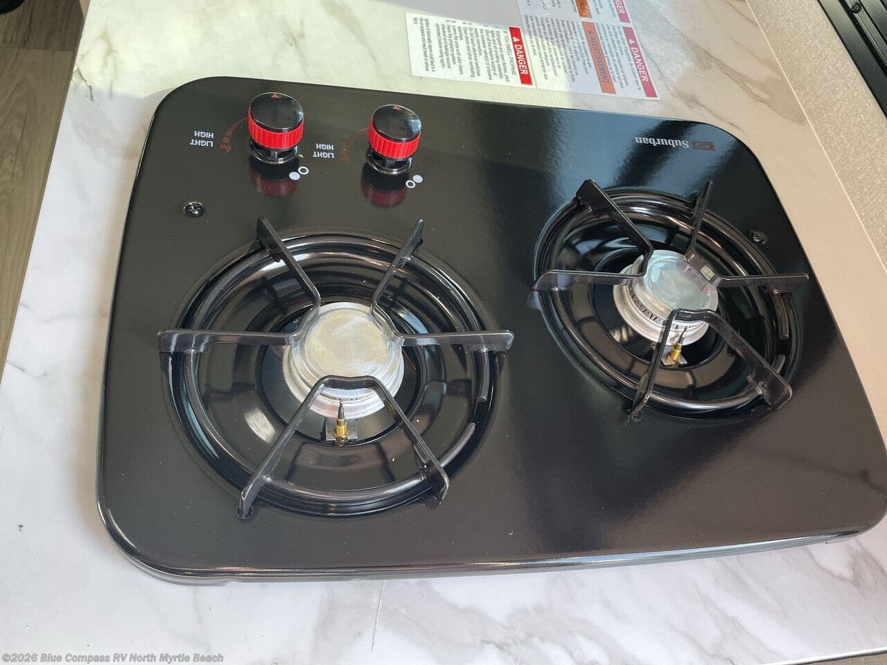 You'll love camping in this lightweight and versatile travel trailer! Once you've arrived at the campground and have unpacked your things, you can make a quick lunch on the two-burner cooktop. There are two 32" x 74" twin-size bed/benches that include a table for a king-size bed conversion, and you'll find a large overhead cabinet here to keep books or board games stored away. A private bath includes a shower and a toilet to easily clean up each day, and a dresser just outside the bath will let you keep clothes or towels organized. Don't let this cozy travel trailer slip away!