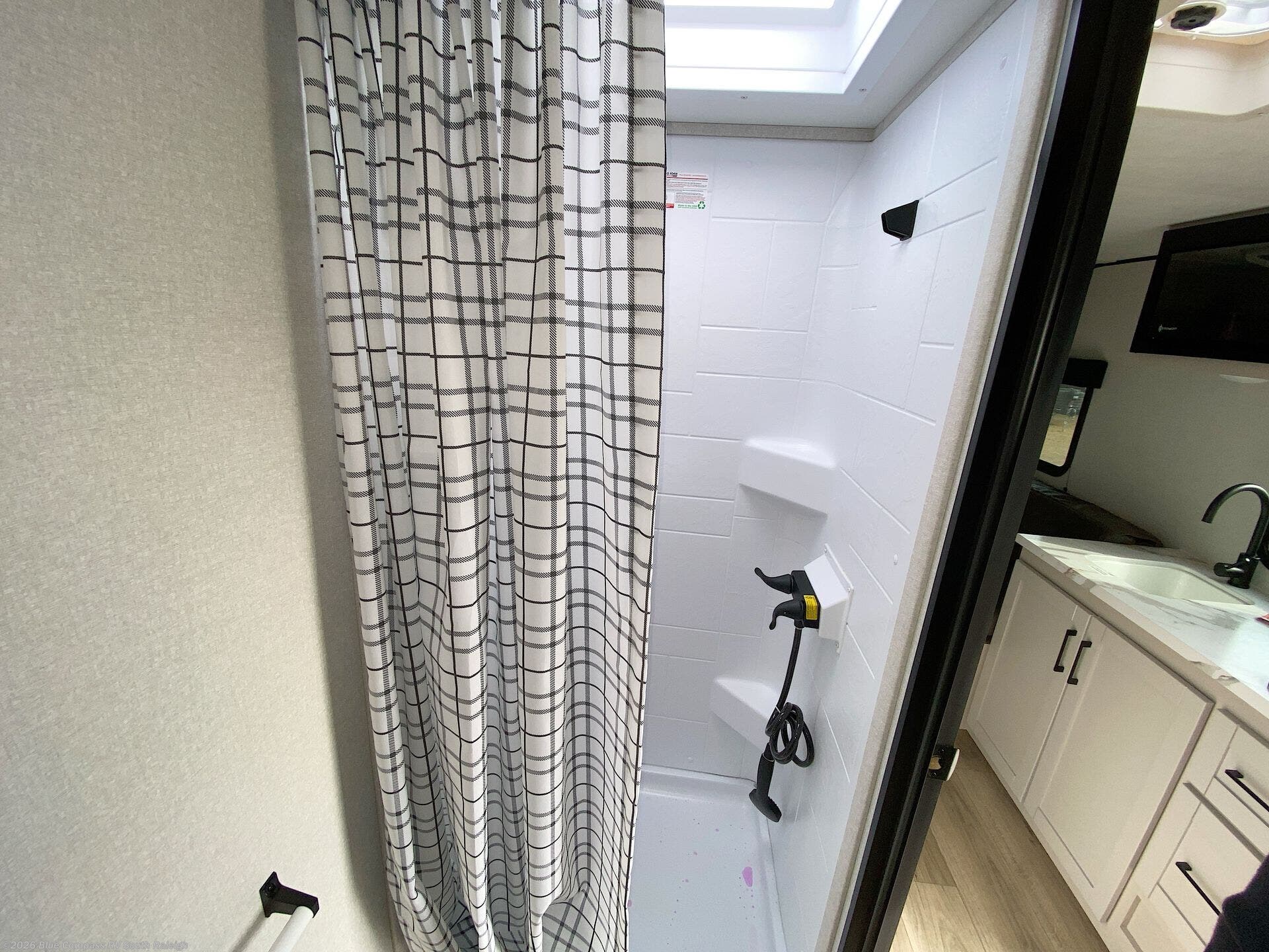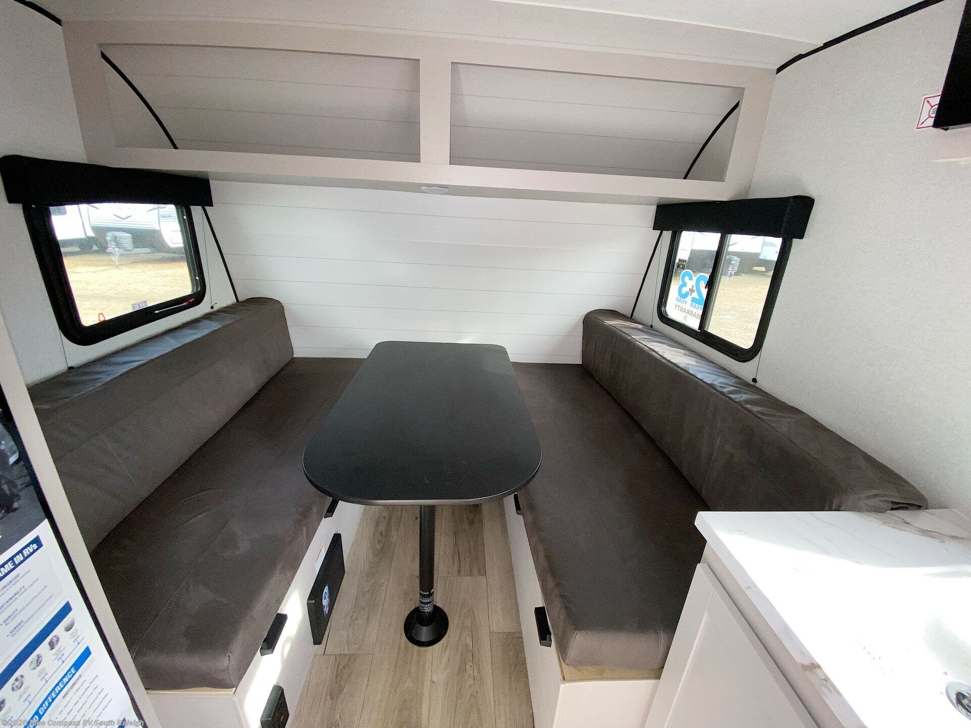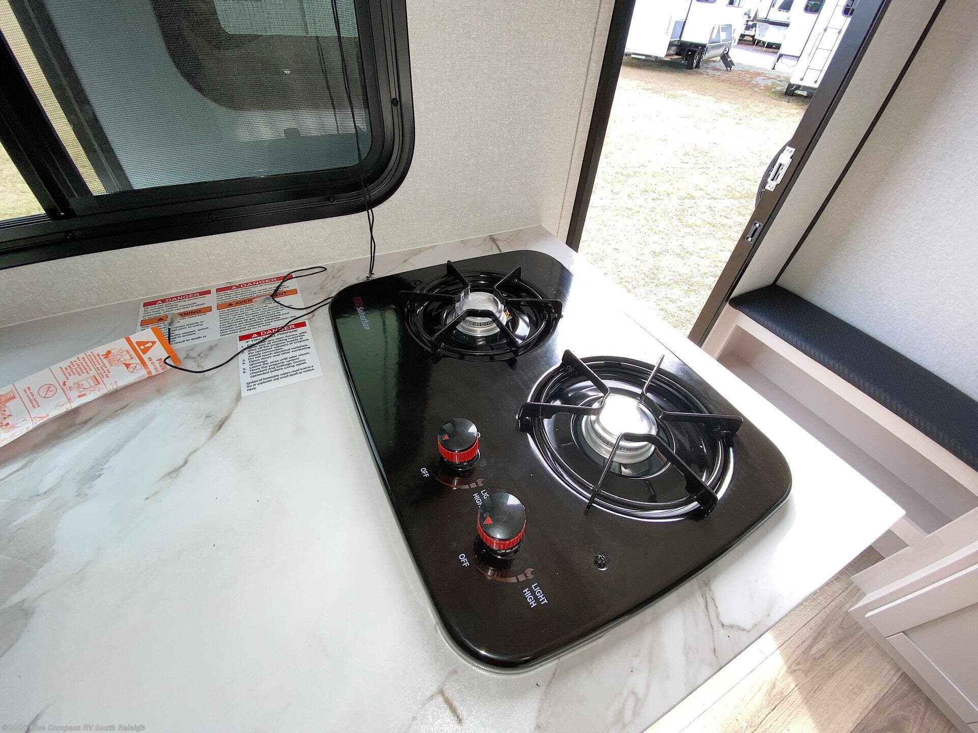 You'll love camping in this lightweight and versatile travel trailer! Once you've arrived at the campground and have unpacked your things, you can make a quick lunch on the two-burner cooktop. There are two 32" x 74" twin-size bed/benches that include a table for a king-size bed conversion, and you'll find a large overhead cabinet here to keep books or board games stored away. A private bath includes a shower and a toilet to easily clean up each day, and a dresser just outside the bath will let you keep clothes or towels organized. Don't let this cozy travel trailer slip away!