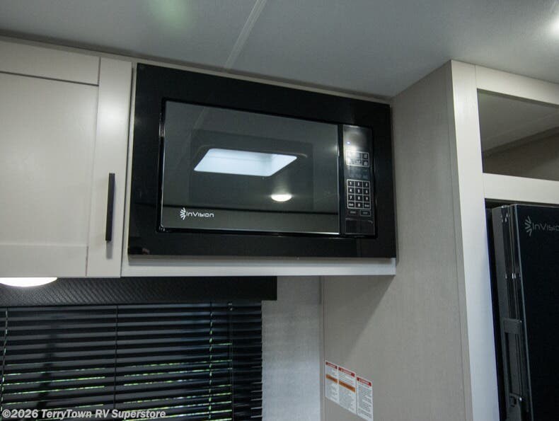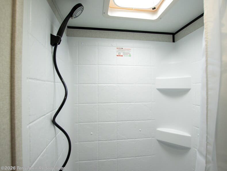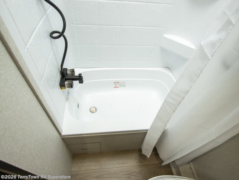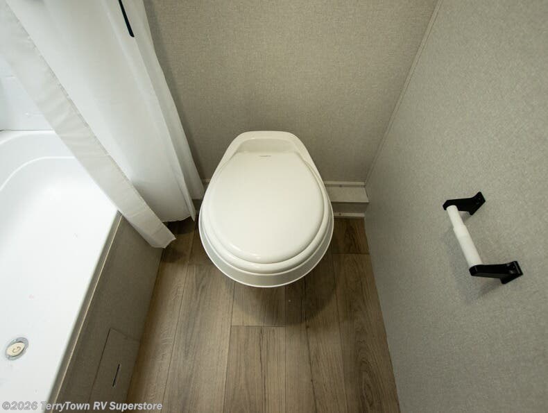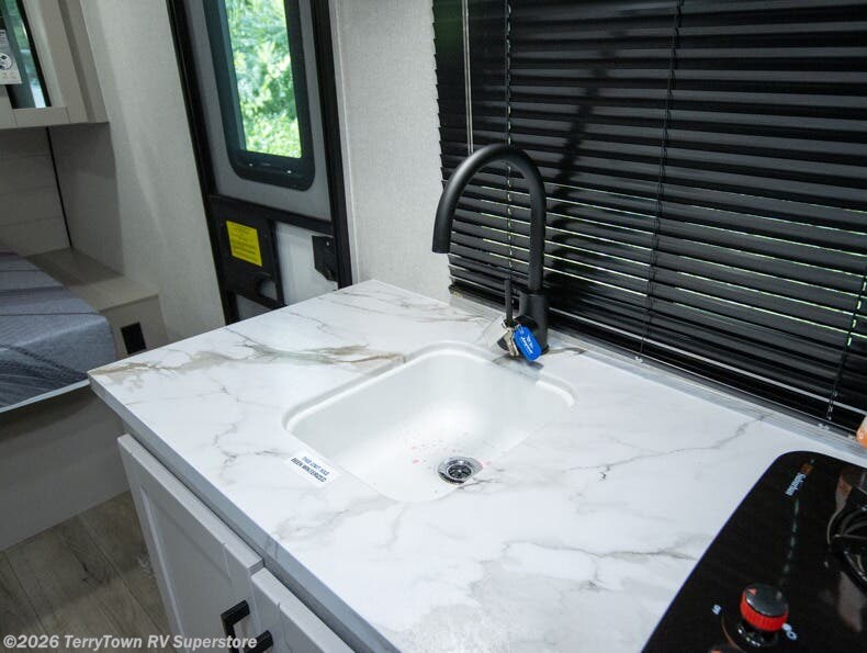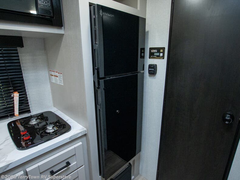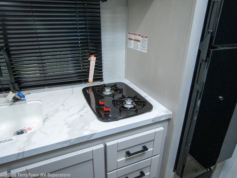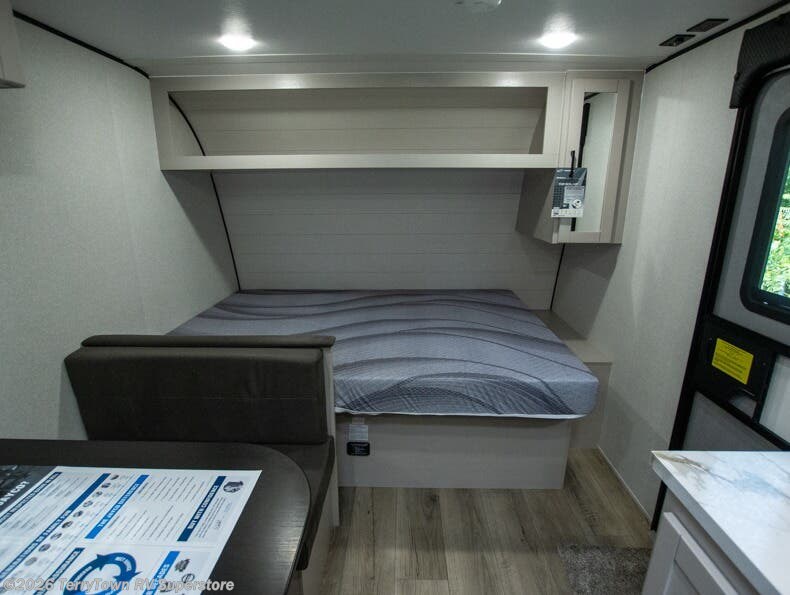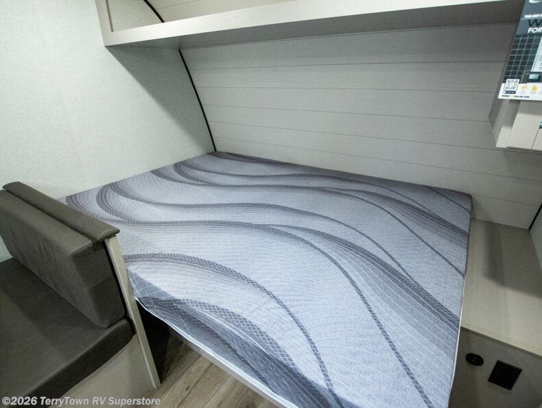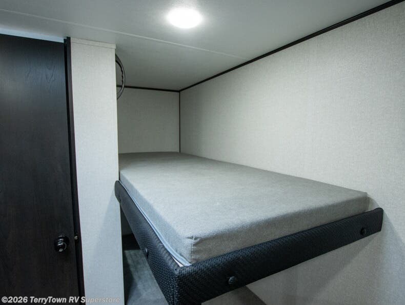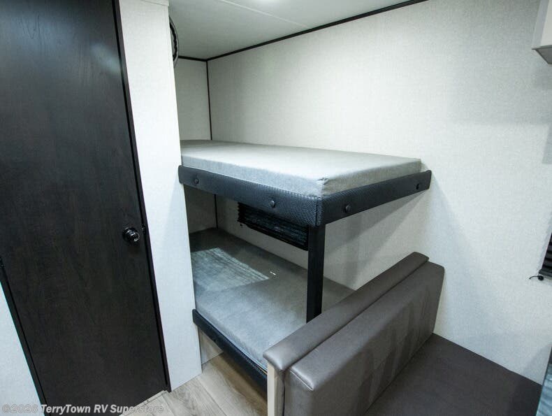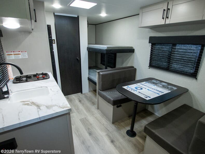 This compact travel trailer has everything you need for convenient camping trips! Once you arrive at the park, you can unload the exterior storage and put out the 10' power awning. The two burner cooktop and microwave oven will let you make lunch for your crew, and there is a 5 cu. ft. 12V refrigerator to keep your cold items fresh. A booth dinette will provide dining space when you don't want to eat outdoors, and this can convert to sleeping space for one guest or two little ones. You'll appreciate the private bath with a toilet and 36" tub/shower to freshen up in each day, and the bunk beds in the back provide compact sleeping space for more campers. The front queen bed will be reserved just for you, and there is a nightstand, wardrobe, and overhead cabinet here to keep your things tidy!