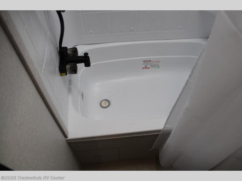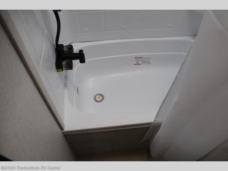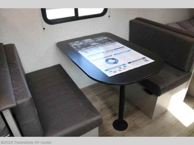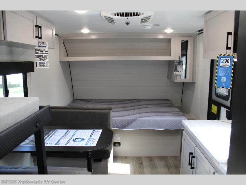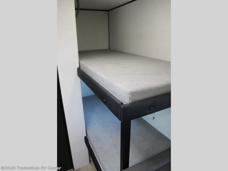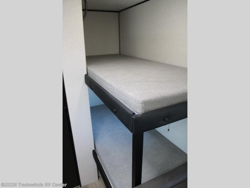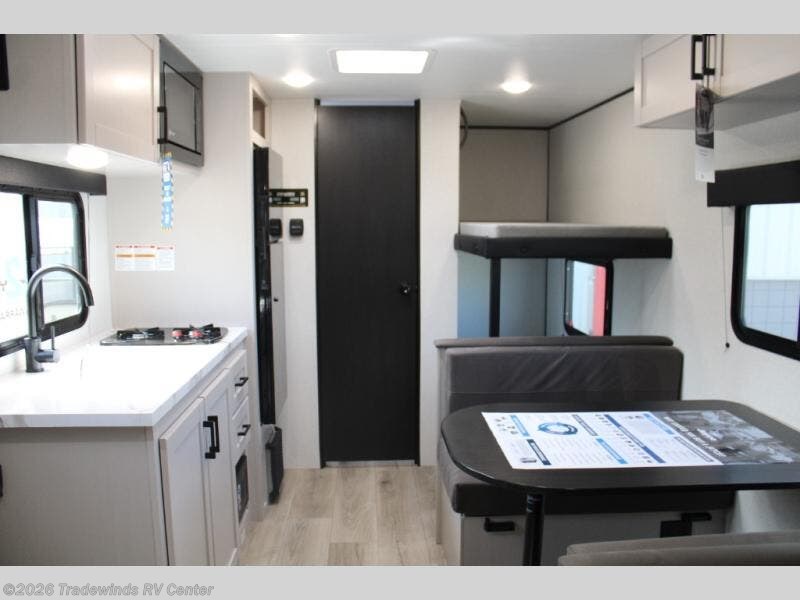 This compact travel trailer has everything you need for convenient camping trips! Once you arrive at the park, you can unload the exterior storage and put out the 10' power awning. The two burner cooktop and microwave oven will let you make lunch for your crew, and there is a 5 cu. ft. 12V refrigerator to keep your cold items fresh. A booth dinette will provide dining space when you don't want to eat outdoors, and this can convert to sleeping space for one guest or two little ones. You'll appreciate the private bath with a toilet and 36" tub/shower to freshen up in each day, and the bunk beds in the back provide compact sleeping space for more campers. The front queen bed will be reserved just for you, and there is a nightstand, wardrobe, and overhead cabinet here to keep your things tidy!