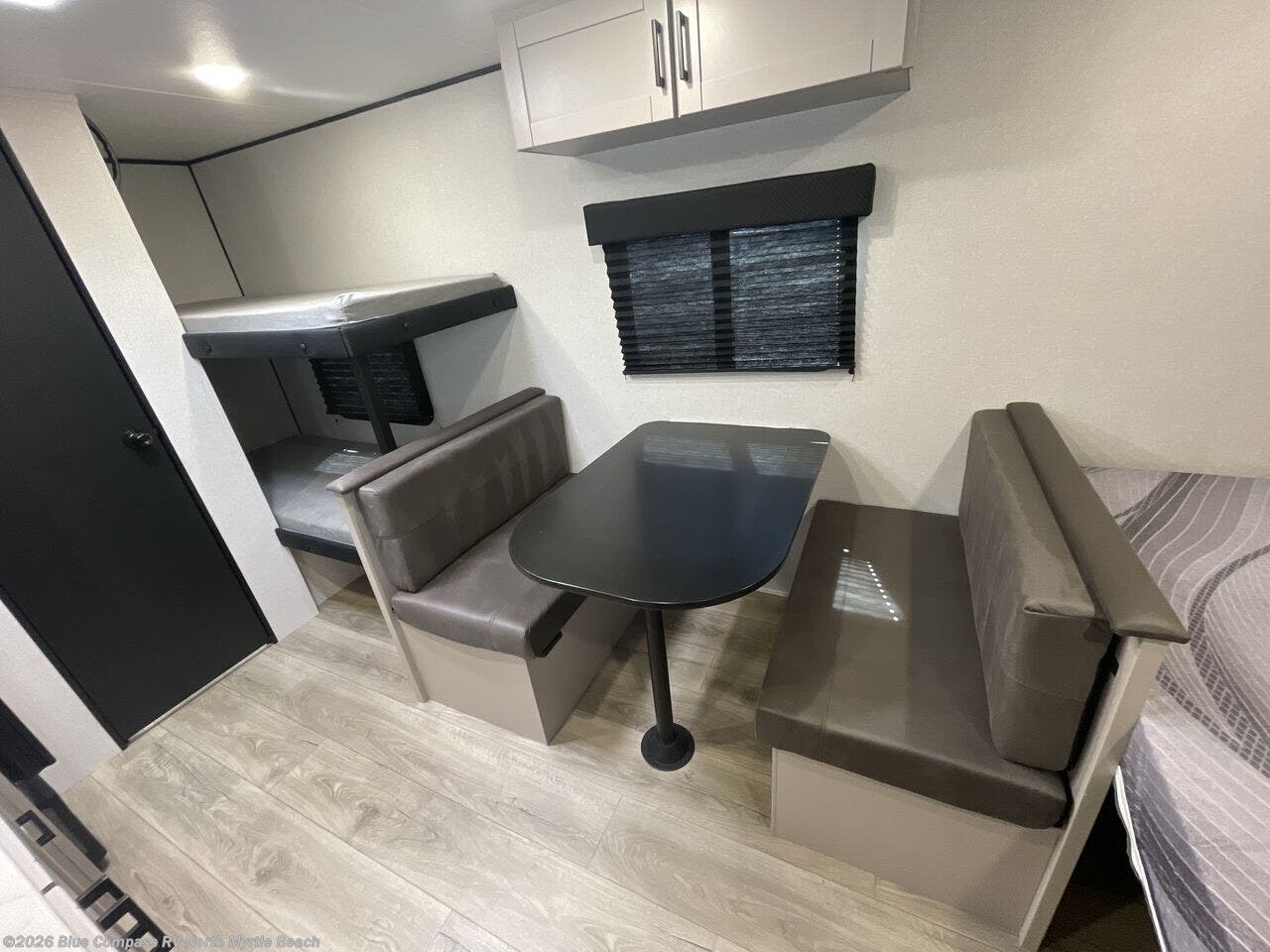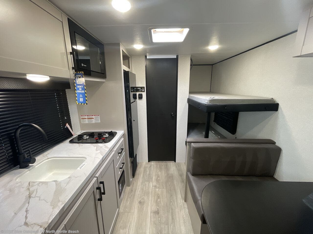 This compact travel trailer has everything you need for convenient camping trips! Once you arrive at the park, you can unload the exterior storage and put out the 10' power awning. The two burner cooktop and microwave oven will let you make lunch for your crew, and there is a 5 cu. ft. 12V refrigerator to keep your cold items fresh. A booth dinette will provide dining space when you don't want to eat outdoors, and this can convert to sleeping space for one guest or two little ones. You'll appreciate the private bath with a toilet and 36" tub/shower to freshen up in each day, and the bunk beds in the back provide compact sleeping space for more campers. The front queen bed will be reserved just for you, and there is a nightstand, wardrobe, and overhead cabinet here to keep your things tidy!