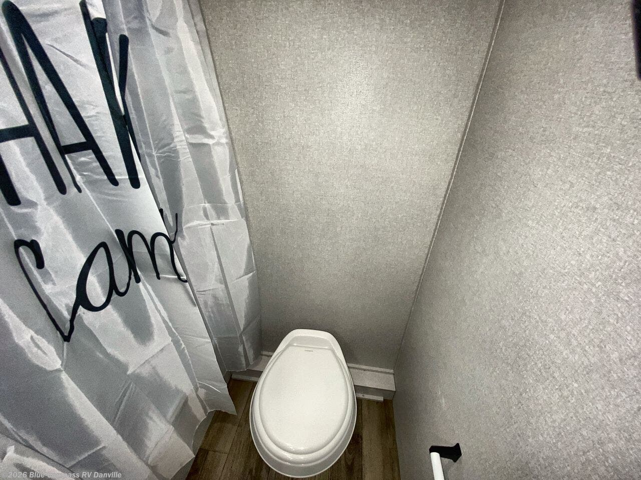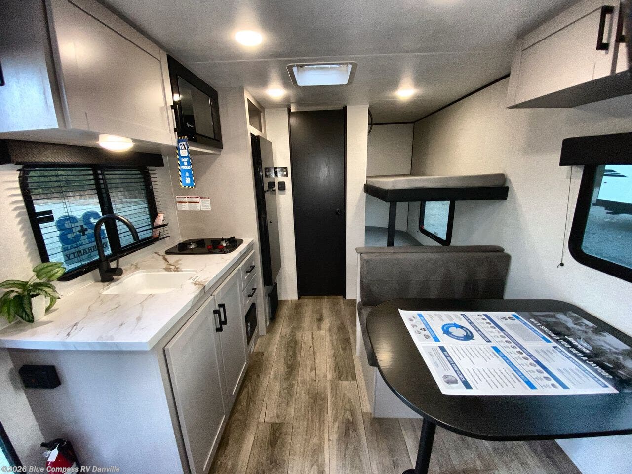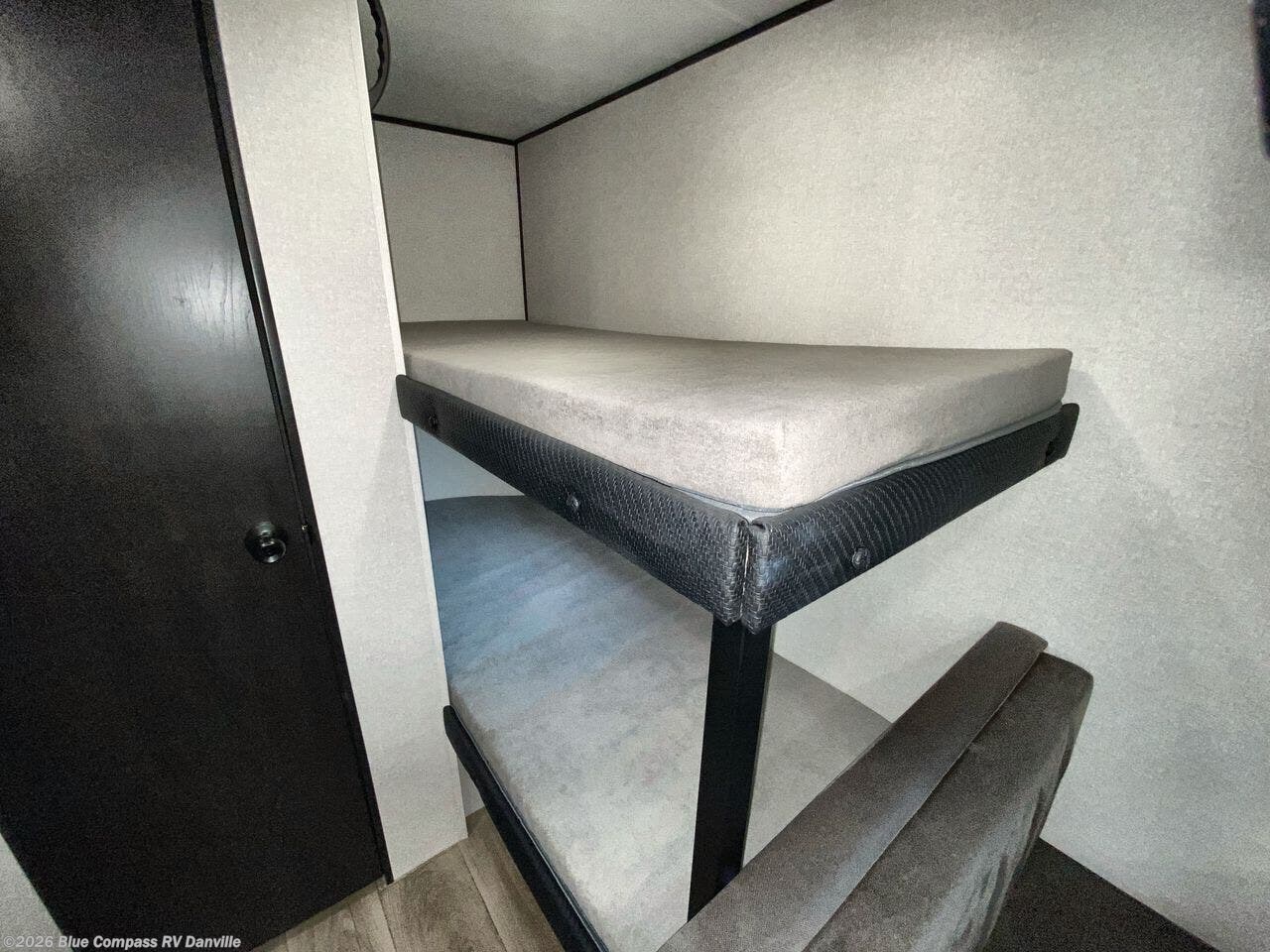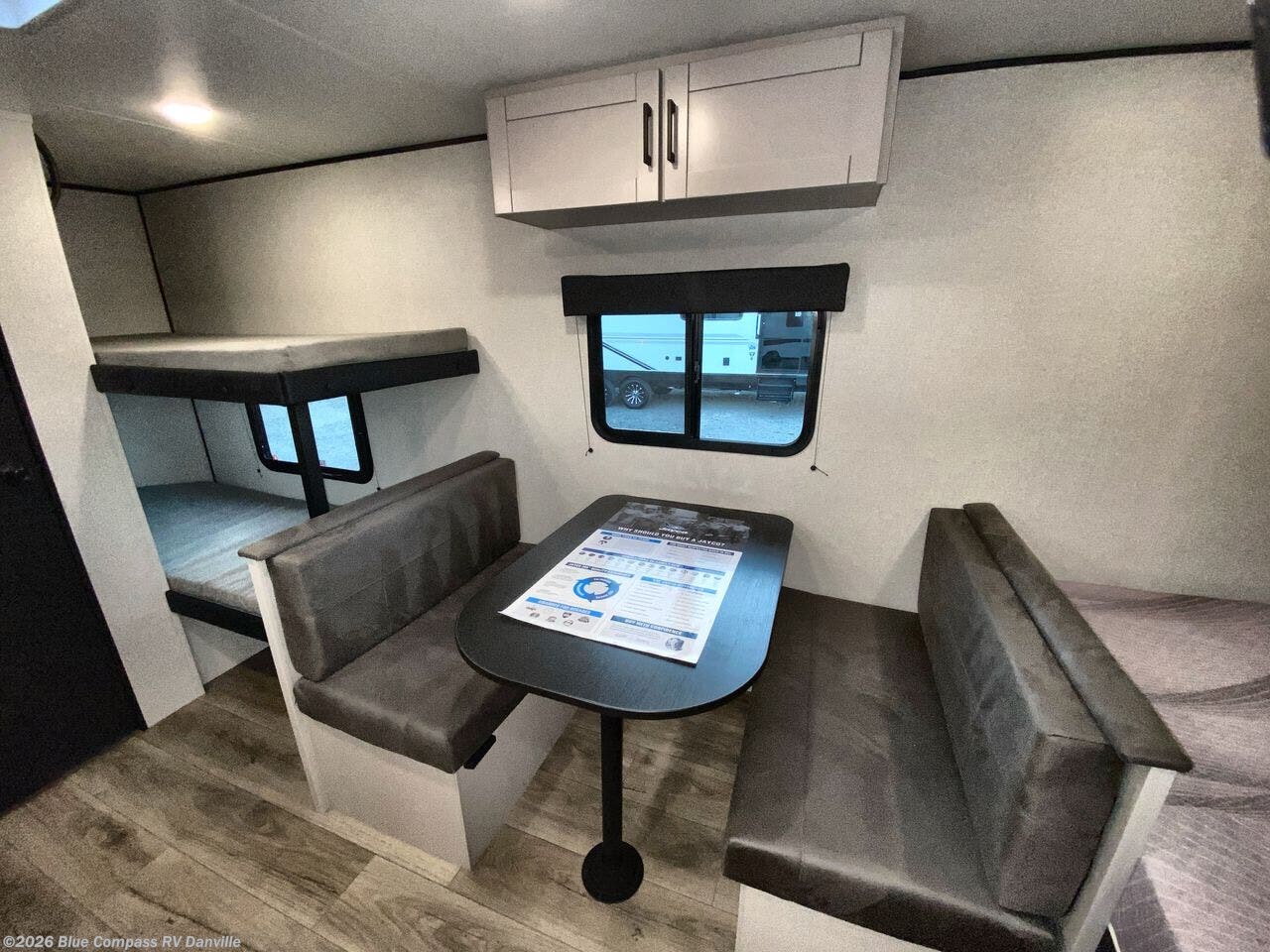 This compact travel trailer has everything you need for convenient camping trips! Once you arrive at the park, you can unload the exterior storage and put out the 10' power awning. The two burner cooktop and microwave oven will let you make lunch for your crew, and there is a 5 cu. ft. 12V refrigerator to keep your cold items fresh. A booth dinette will provide dining space when you don't want to eat outdoors, and this can convert to sleeping space for one guest or two little ones. You'll appreciate the private bath with a toilet and 36" tub/shower to freshen up in each day, and the bunk beds in the back provide compact sleeping space for more campers. The front queen bed will be reserved just for you, and there is a nightstand, wardrobe, and overhead cabinet here to keep your things tidy!