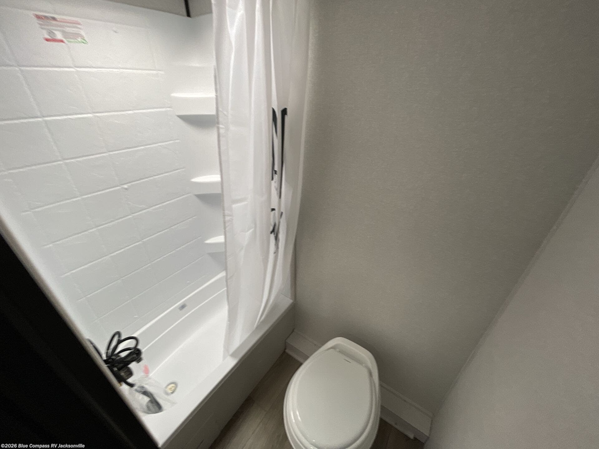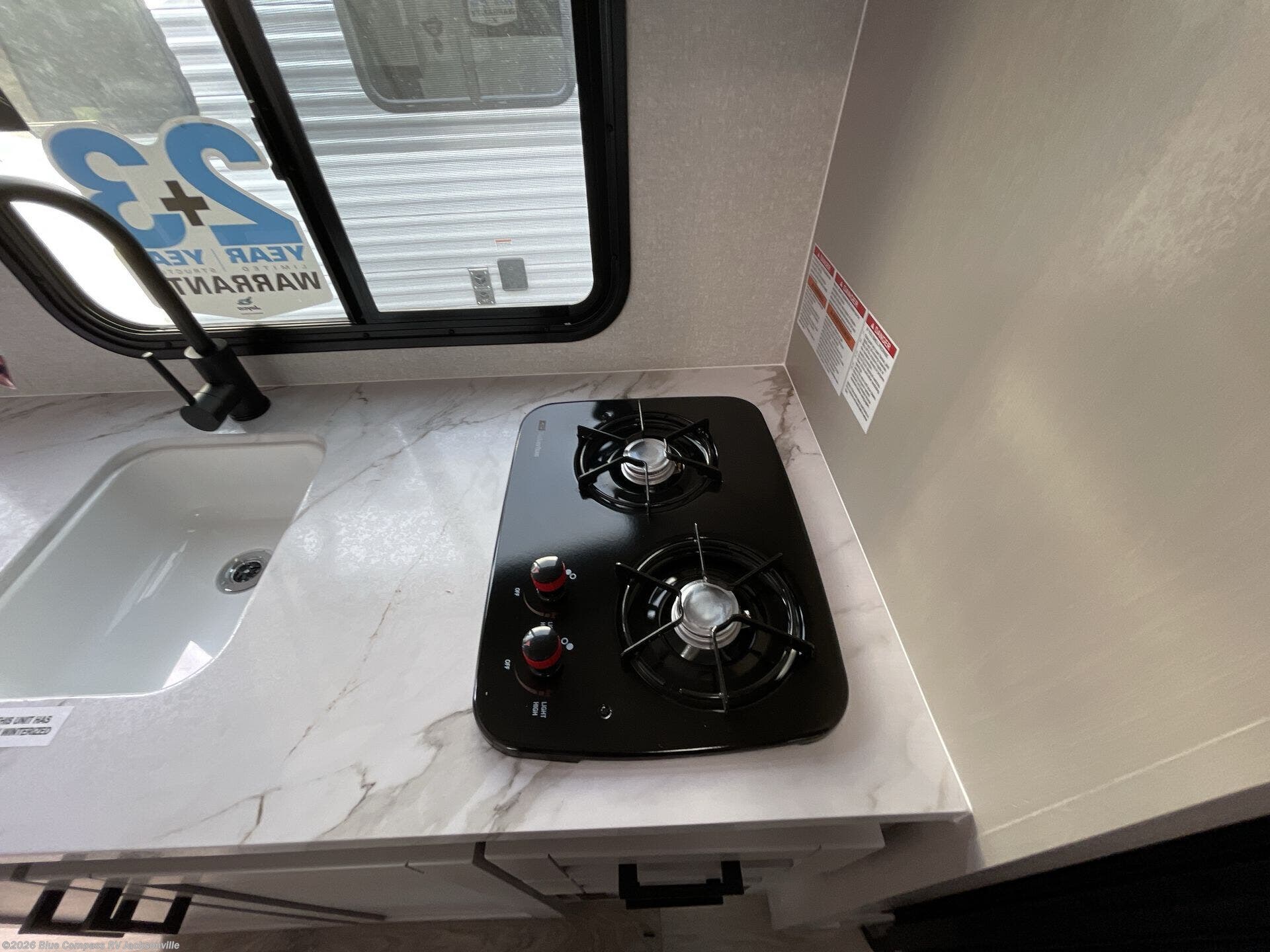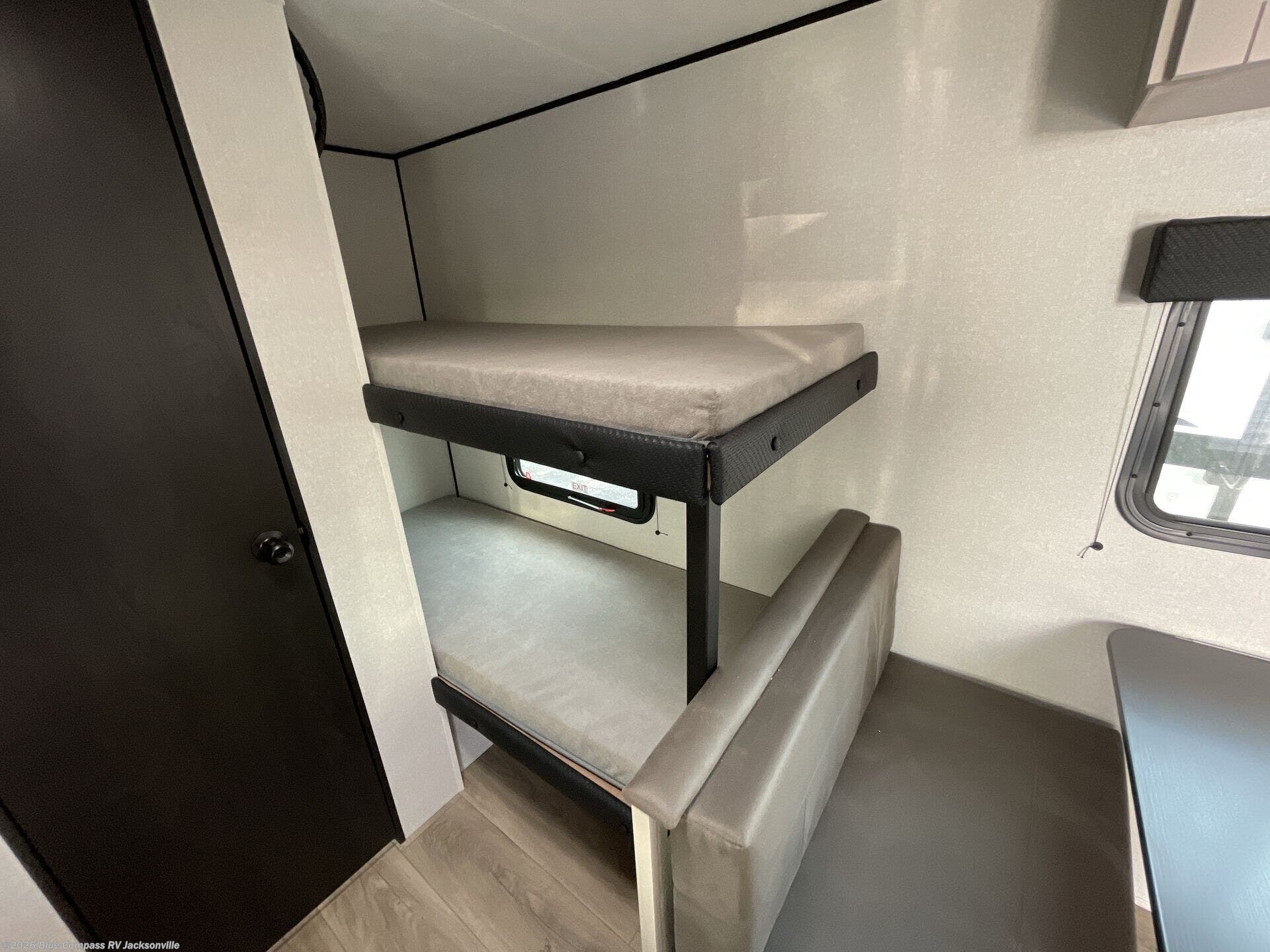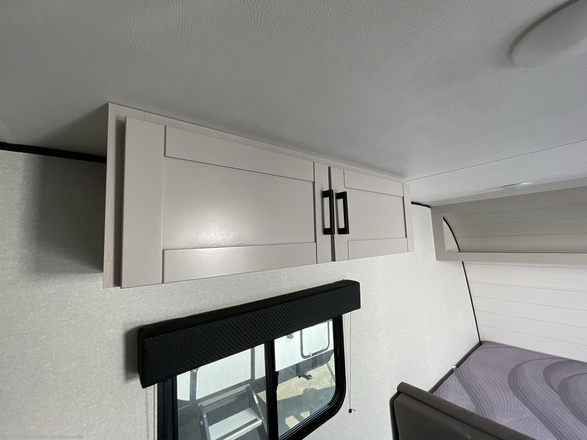 This compact travel trailer has everything you need for convenient camping trips! Once you arrive at the park, you can unload the exterior storage and put out the 10' power awning. The two burner cooktop and microwave oven will let you make lunch for your crew, and there is a 5 cu. ft. 12V refrigerator to keep your cold items fresh. A booth dinette will provide dining space when you don't want to eat outdoors, and this can convert to sleeping space for one guest or two little ones. You'll appreciate the private bath with a toilet and 36" tub/shower to freshen up in each day, and the bunk beds in the back provide compact sleeping space for more campers. The front queen bed will be reserved just for you, and there is a nightstand, wardrobe, and overhead cabinet here to keep your things tidy!