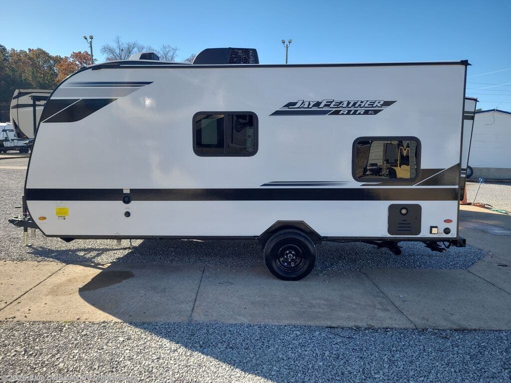 The Jay Feather Air SL travel trailer by Jayco is affordable, convenient, and lightweight for an easier tow! A Magnum Truss roof system and fully integrated A-frame provide a strong foundation to the trailer, plus there are galvanized-steel, impact resistant wheel wells for added protection. Some of the exterior conveniences you'll find include a front tongue jack and stabilizer jacks, roof mount solar prep, an exterior porch light, and G20 dark tinted privacy windows. Head inside to enjoy solid hardwood cabinet doors, residential-style kitchen countertops, a marine-grade toilet with foot flush, and vinyl flooring throughout that will be easy to keep clean. This super lite travel trailer is the perfect choice for rookie RVers and seasoned campers alike!