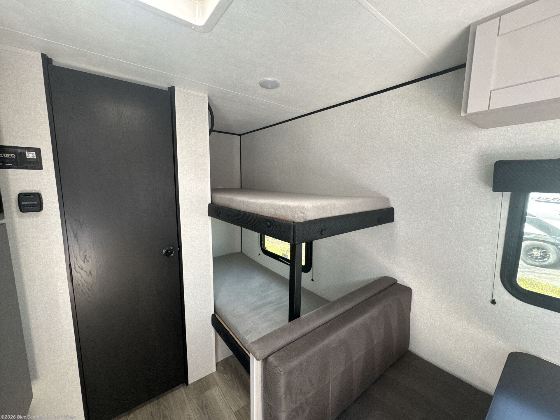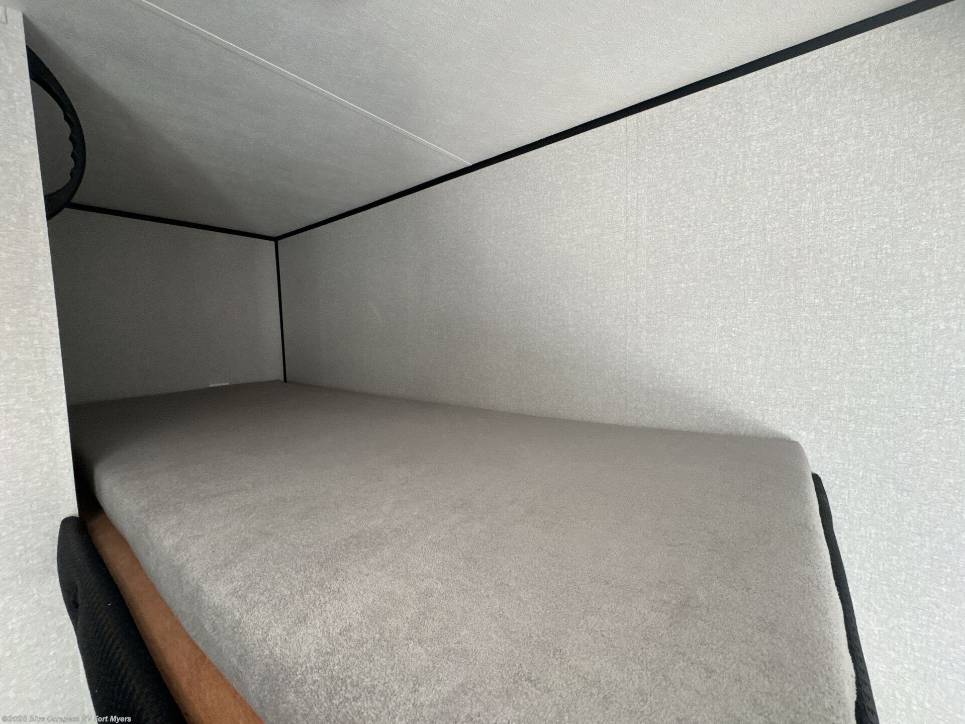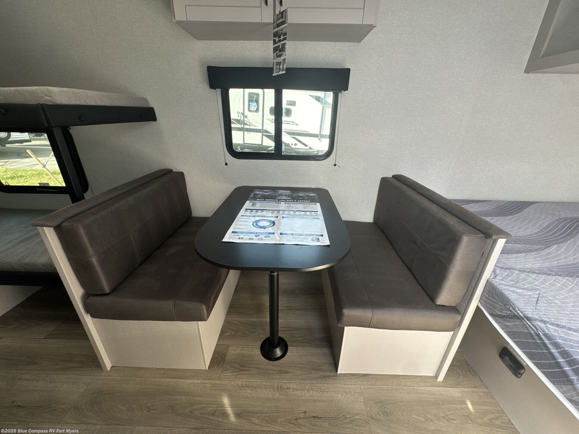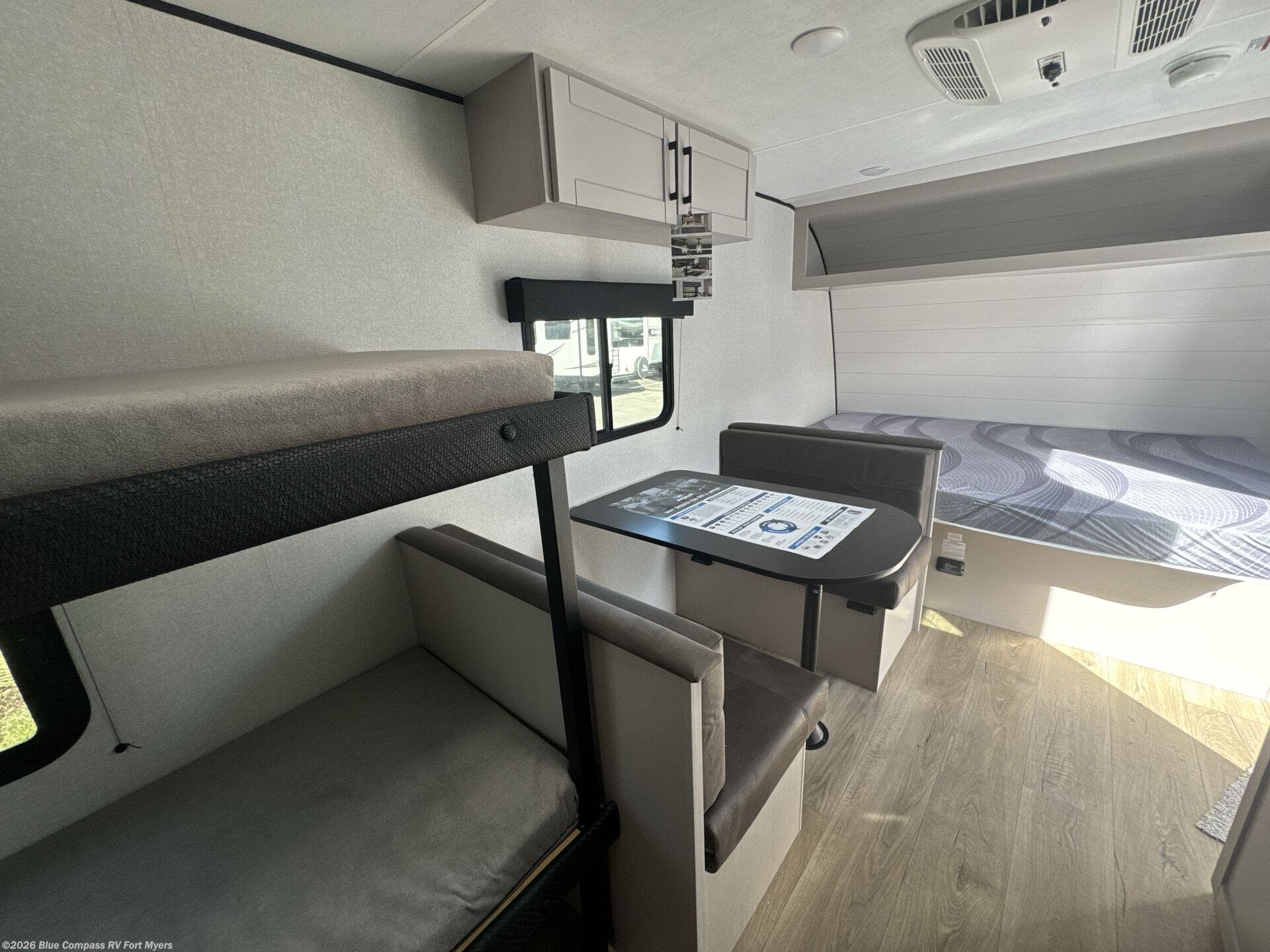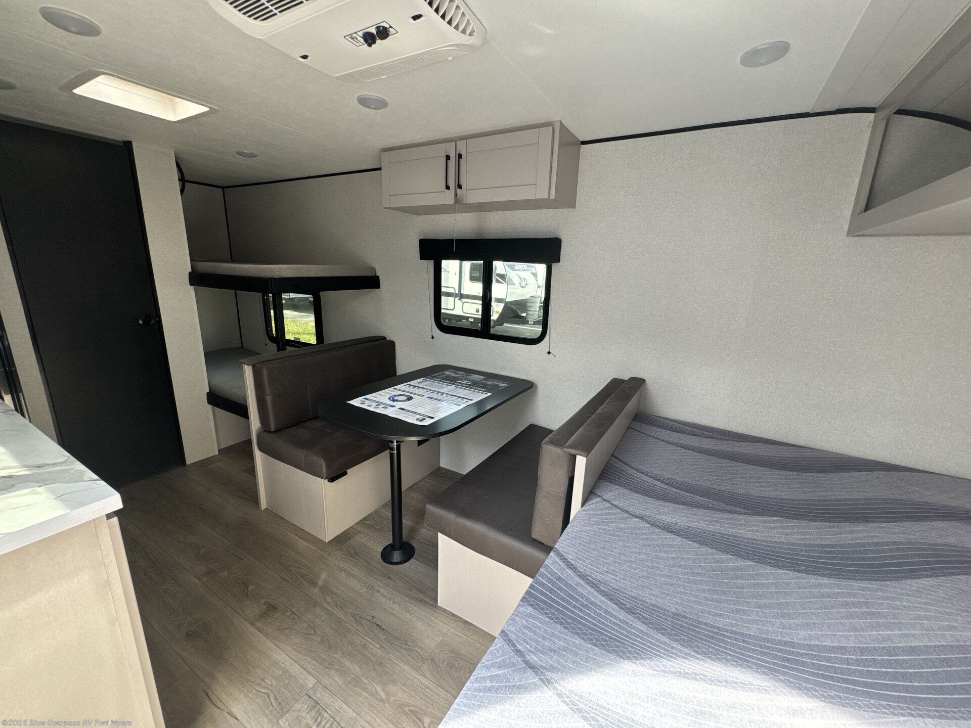 This compact travel trailer has everything you need for convenient camping trips! Once you arrive at the park, you can unload the exterior storage and put out the 10' power awning. The two burner cooktop and microwave oven will let you make lunch for your crew, and there is a 5 cu. ft. 12V refrigerator to keep your cold items fresh. A booth dinette will provide dining space when you don't want to eat outdoors, and this can convert to sleeping space for one guest or two little ones. You'll appreciate the private bath with a toilet and 36" tub/shower to freshen up in each day, and the bunk beds in the back provide compact sleeping space for more campers. The front queen bed will be reserved just for you, and there is a nightstand, wardrobe, and overhead cabinet here to keep your things tidy!