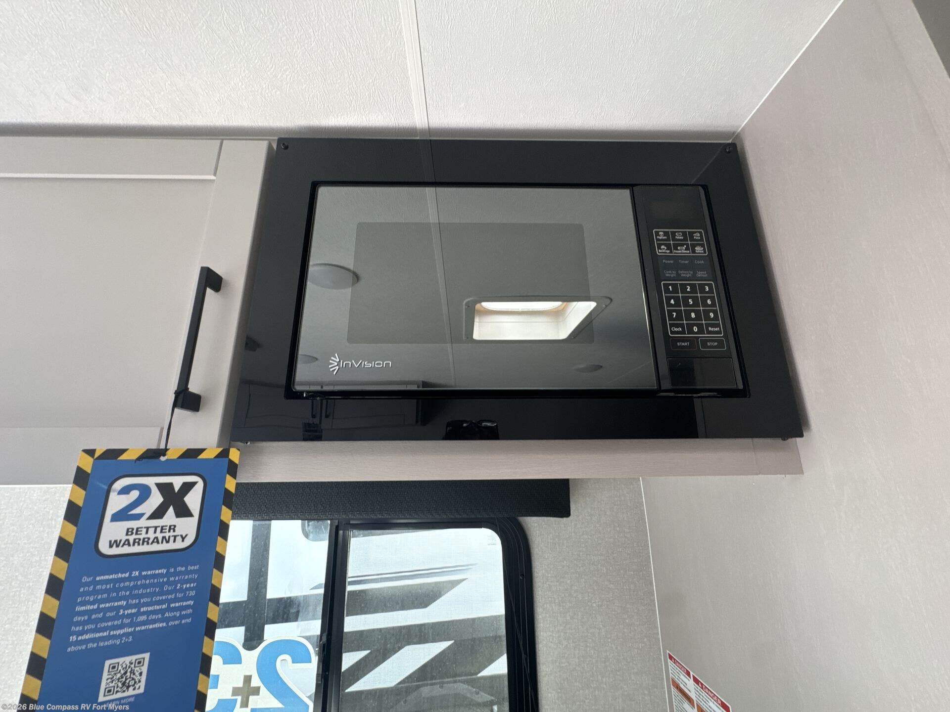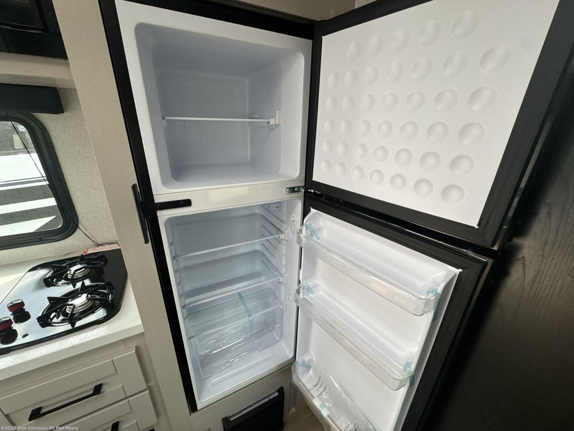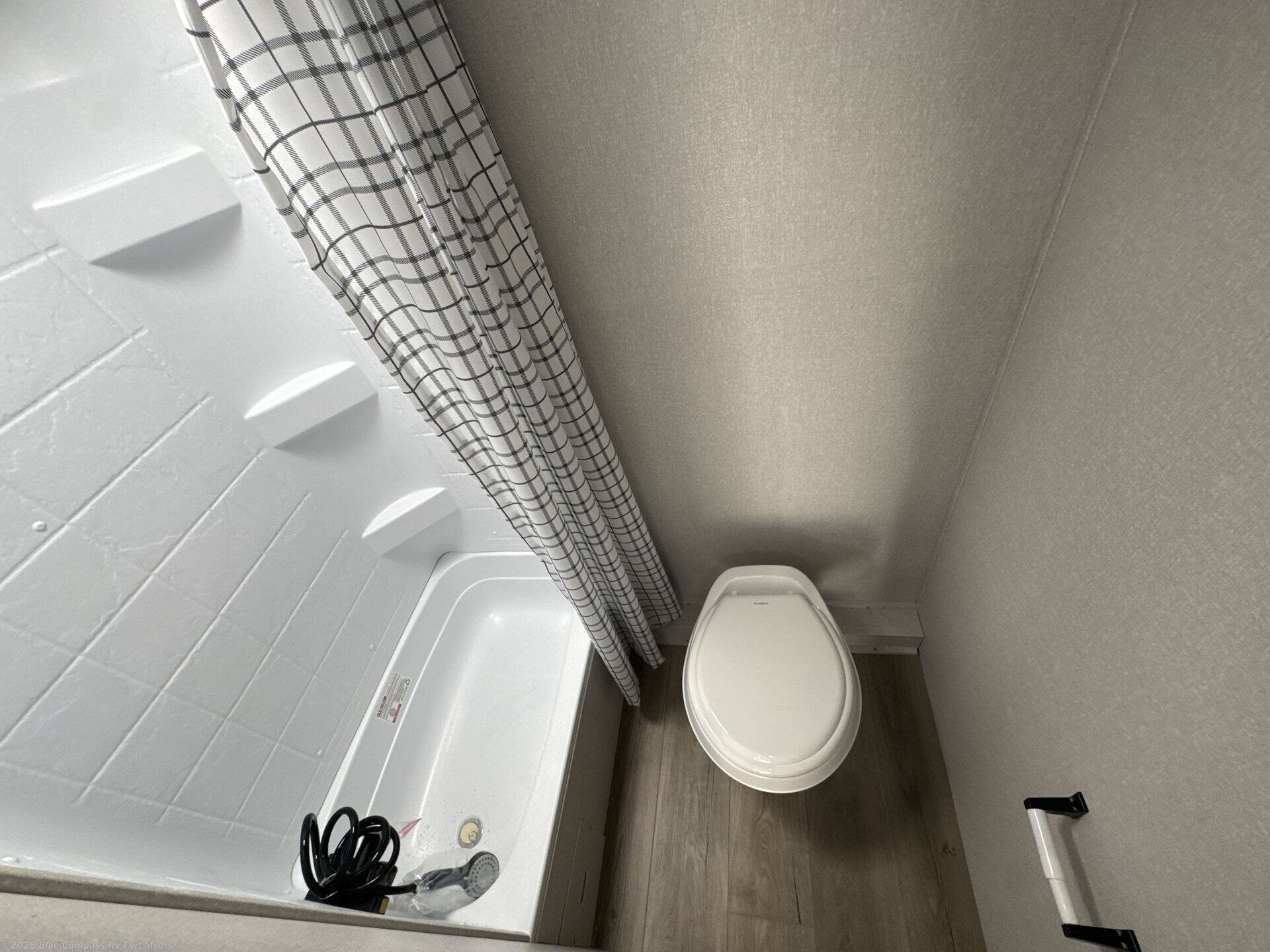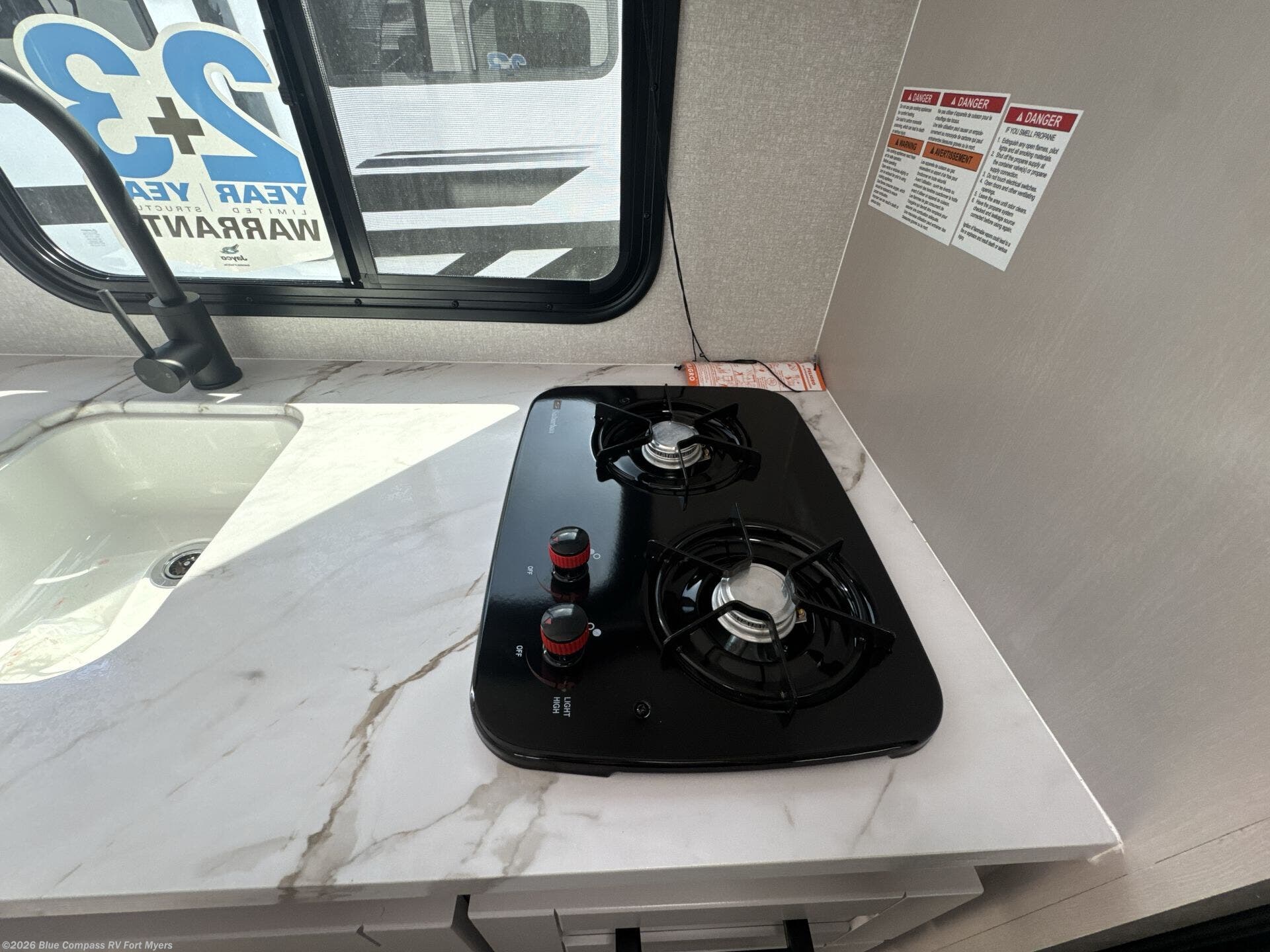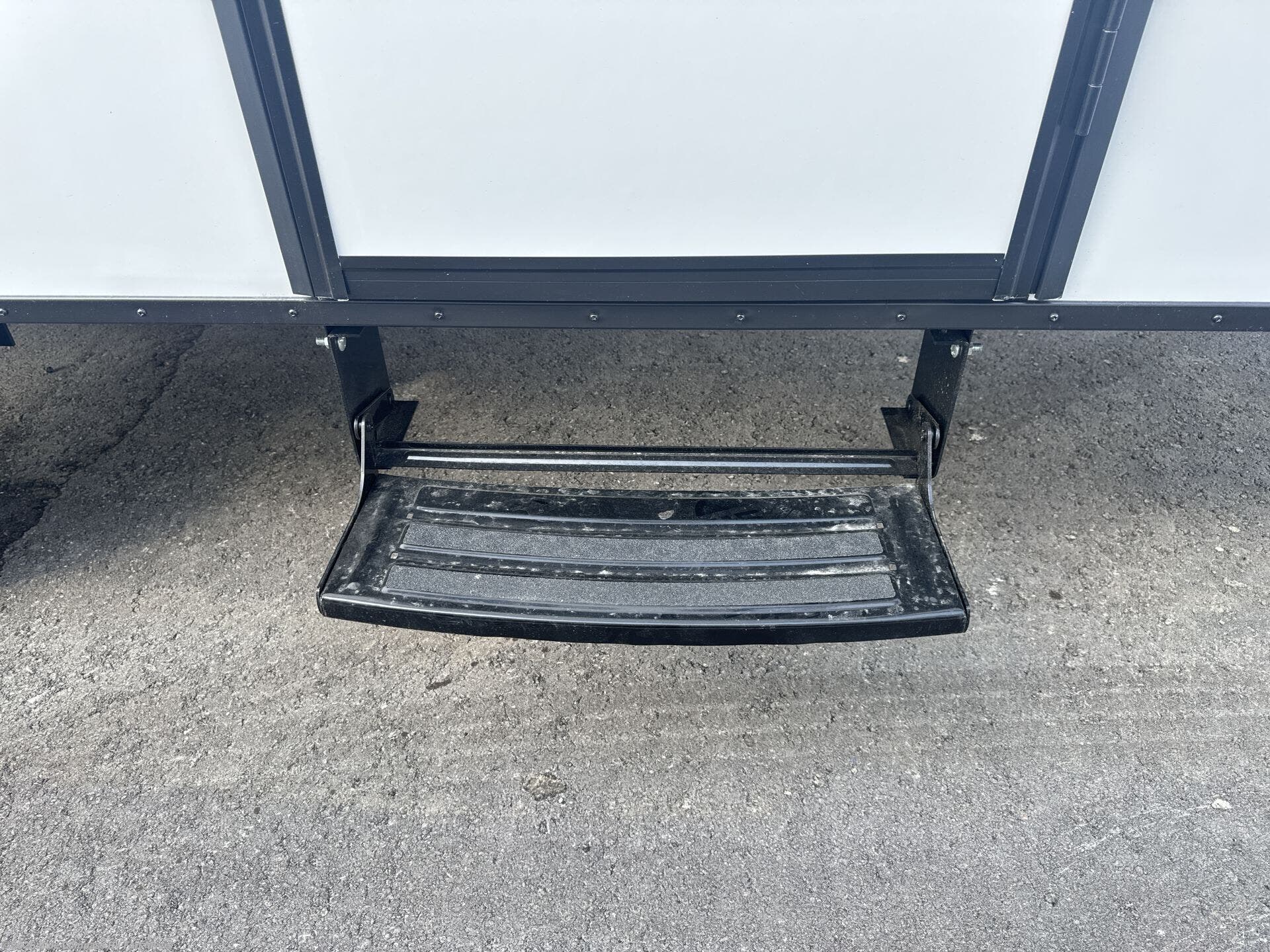 This compact travel trailer has everything you need for convenient camping trips! Once you arrive at the park, you can unload the exterior storage and put out the 10' power awning. The two burner cooktop and microwave oven will let you make lunch for your crew, and there is a 5 cu. ft. 12V refrigerator to keep your cold items fresh. A booth dinette will provide dining space when you don't want to eat outdoors, and this can convert to sleeping space for one guest or two little ones. You'll appreciate the private bath with a toilet and 36" tub/shower to freshen up in each day, and the bunk beds in the back provide compact sleeping space for more campers. The front queen bed will be reserved just for you, and there is a nightstand, wardrobe, and overhead cabinet here to keep your things tidy!