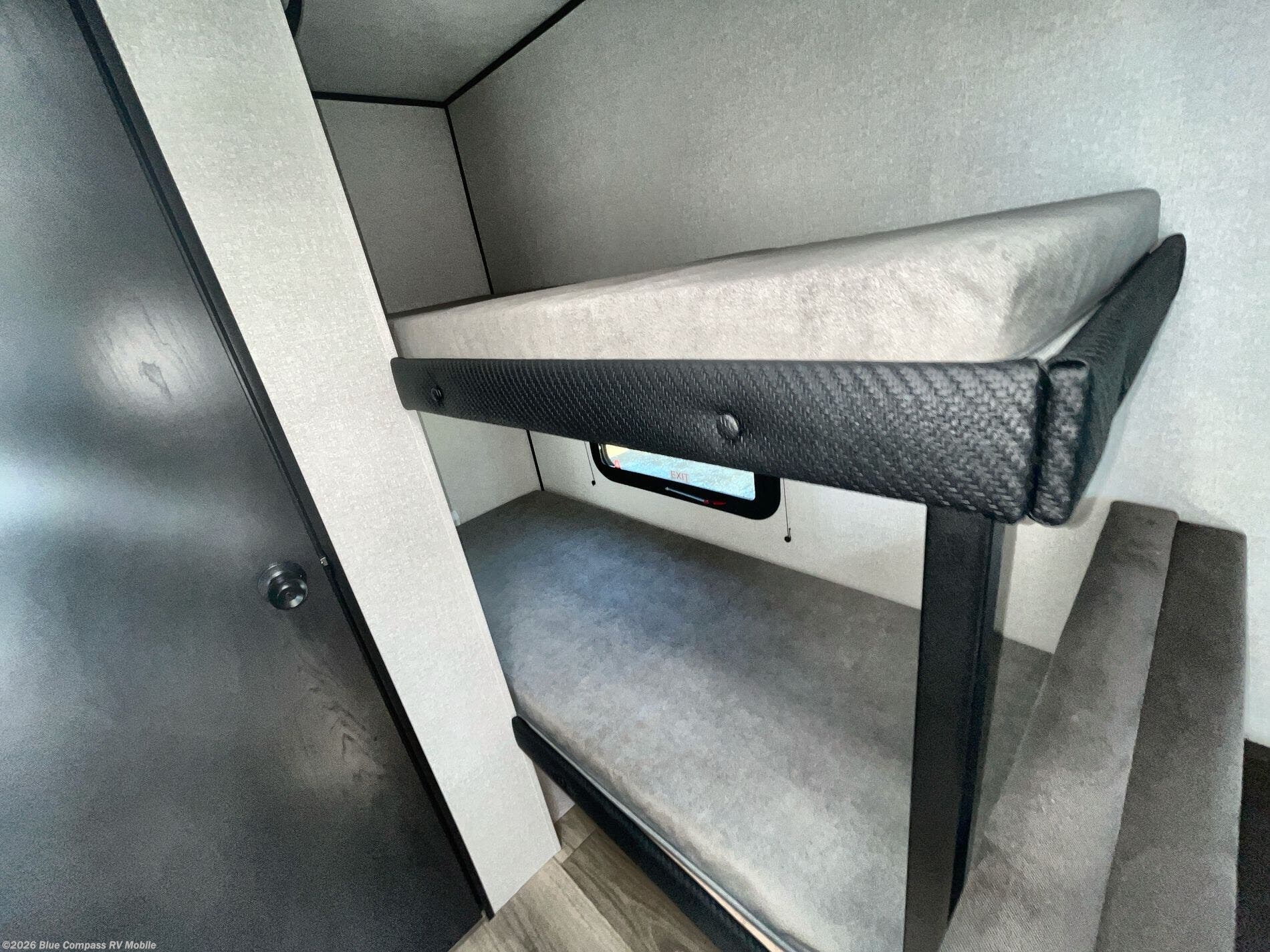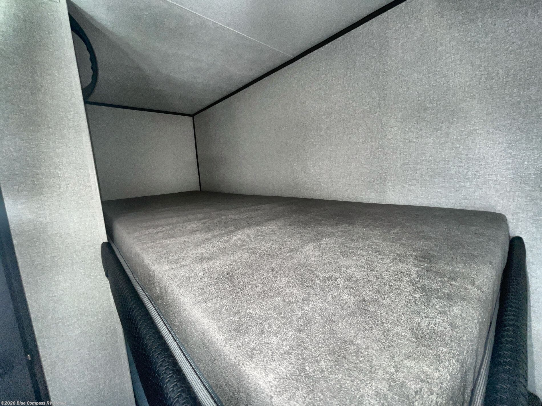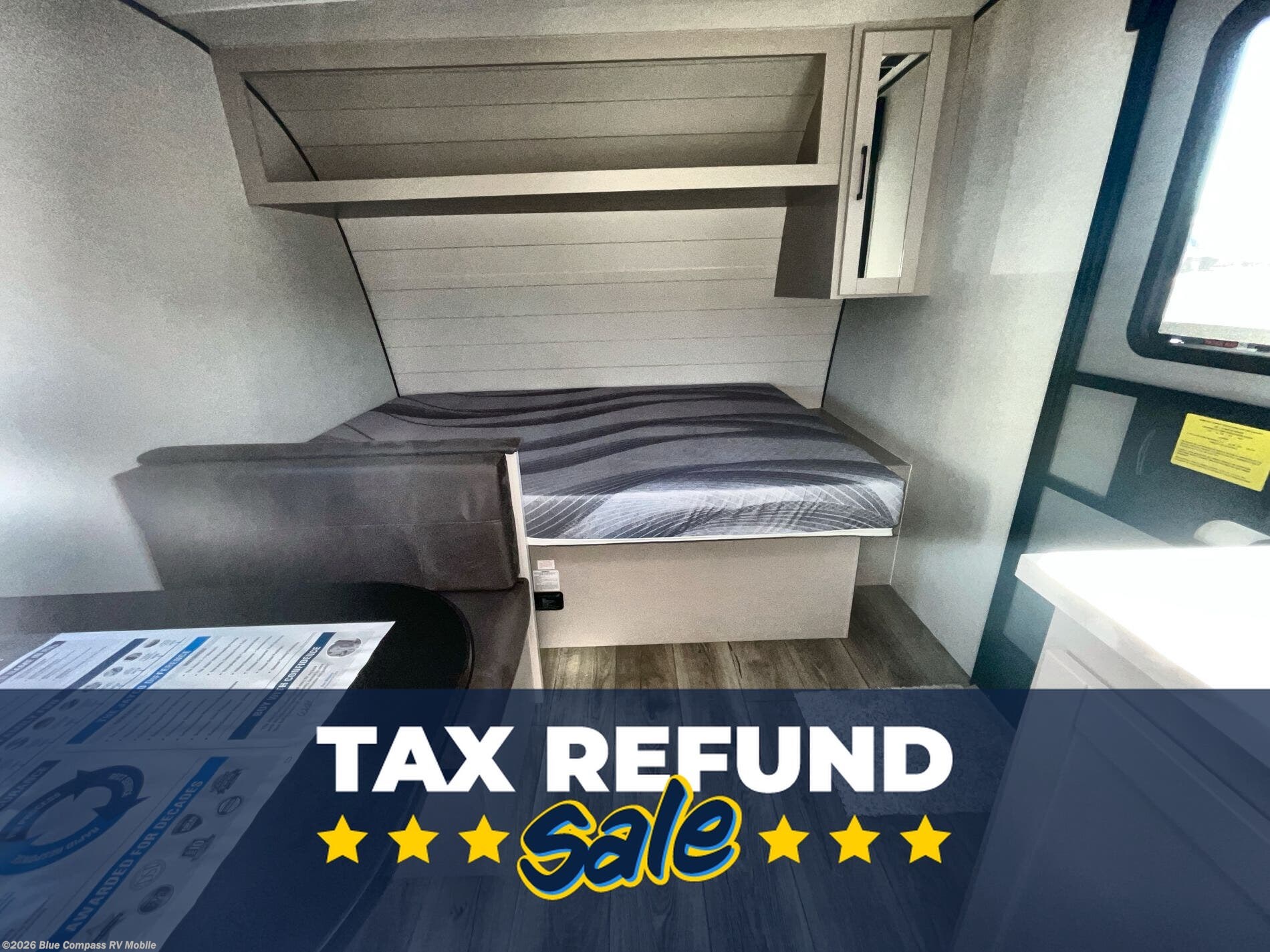 This compact travel trailer has everything you need for convenient camping trips! Once you arrive at the park, you can unload the exterior storage and put out the 10' power awning. The two burner cooktop and microwave oven will let you make lunch for your crew, and there is a 5 cu. ft. 12V refrigerator to keep your cold items fresh. A booth dinette will provide dining space when you don't want to eat outdoors, and this can convert to sleeping space for one guest or two little ones. You'll appreciate the private bath with a toilet and 36" tub/shower to freshen up in each day, and the bunk beds in the back provide compact sleeping space for more campers. The front queen bed will be reserved just for you, and there is a nightstand, wardrobe, and overhead cabinet here to keep your things tidy!