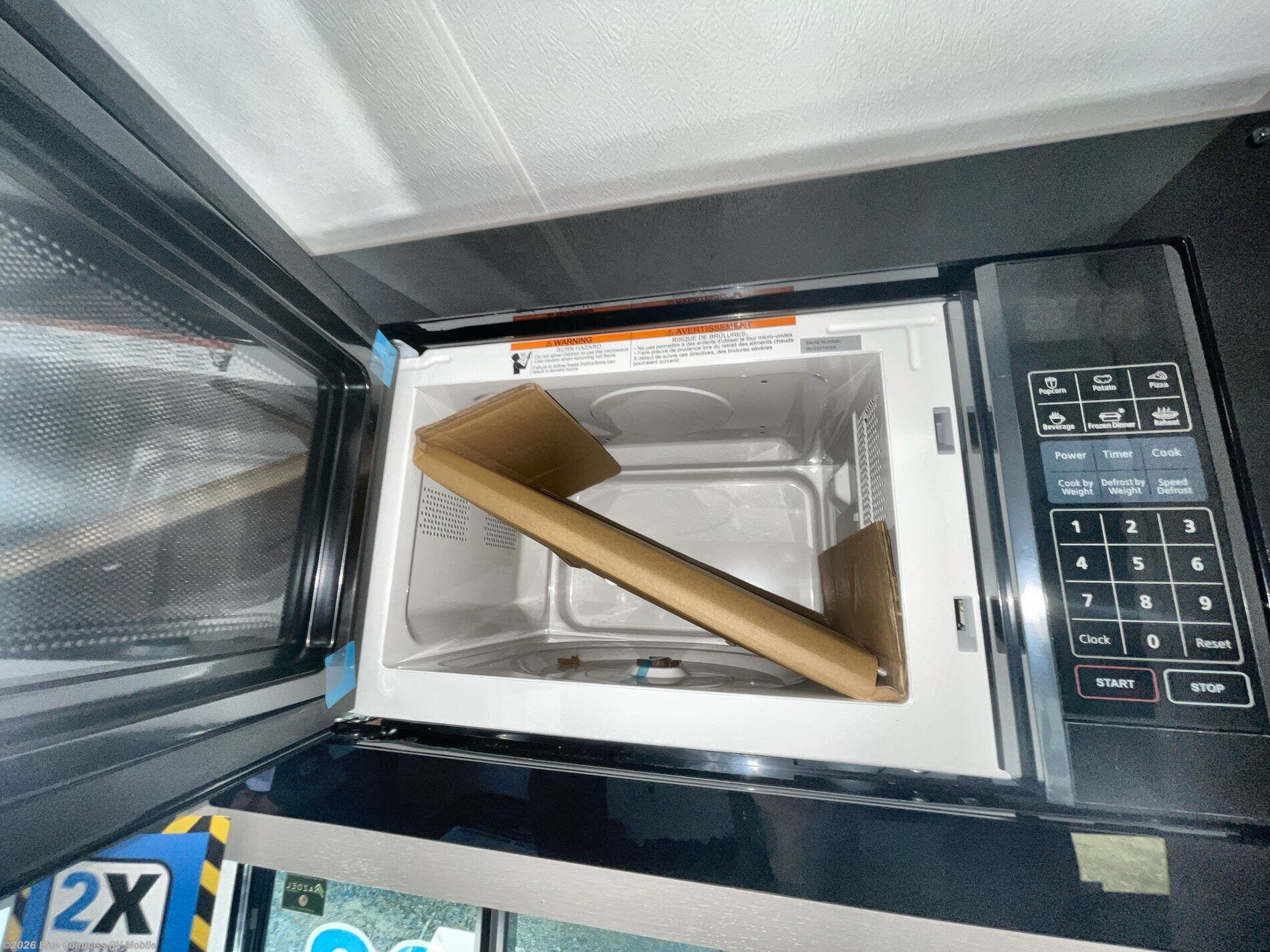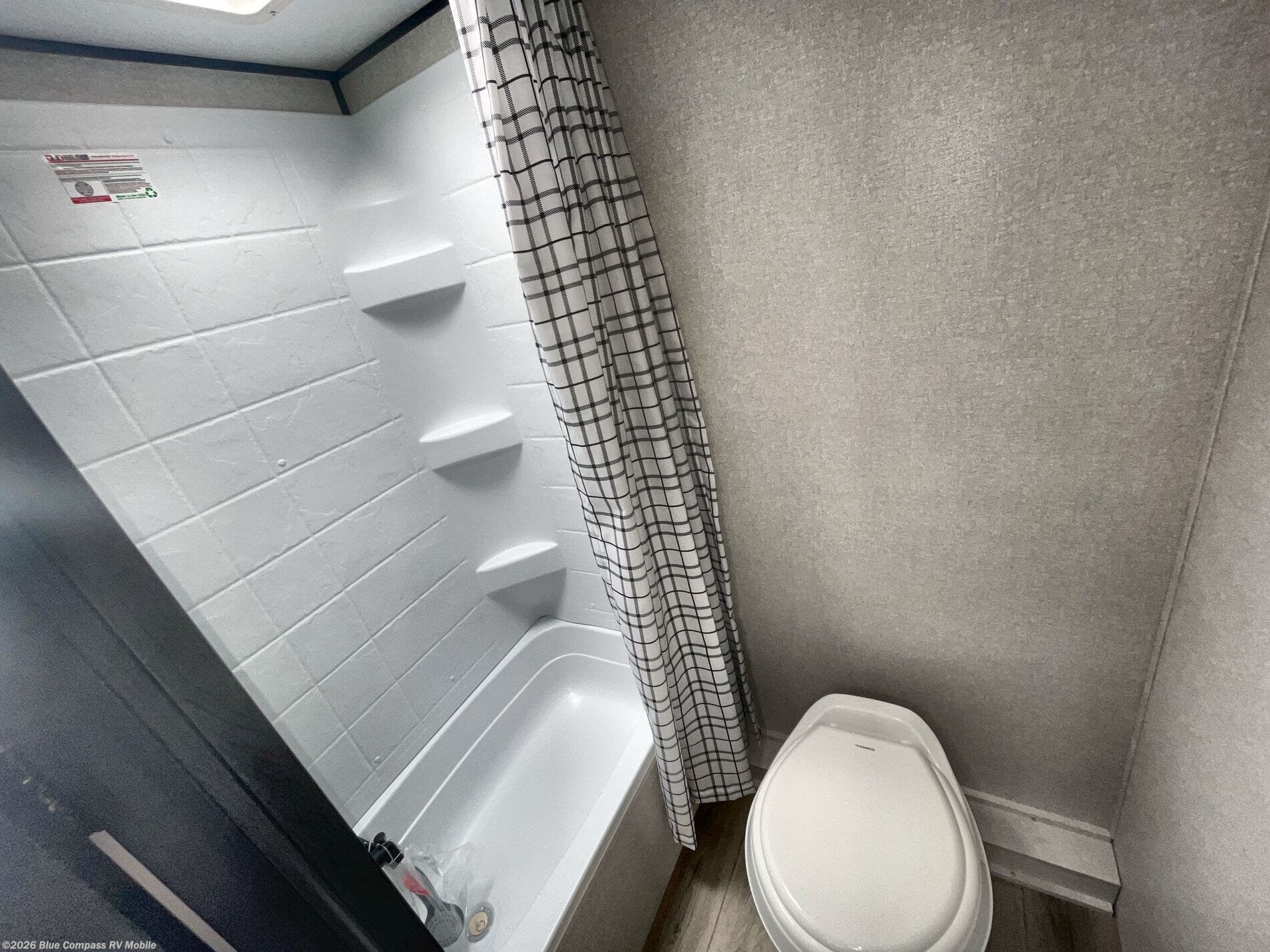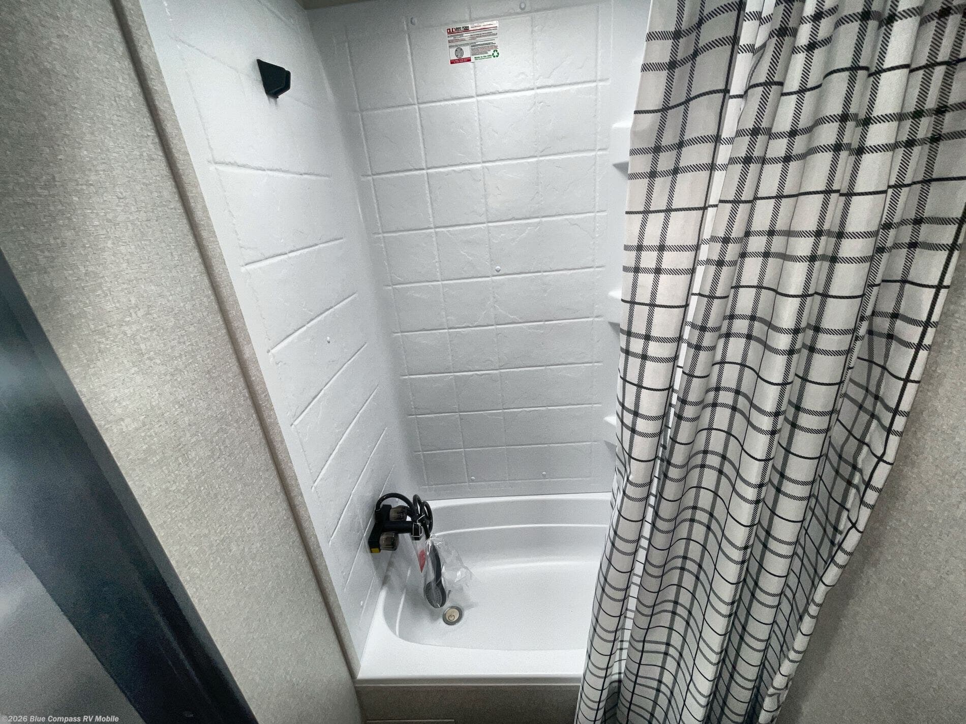 This compact travel trailer has everything you need for convenient camping trips! Once you arrive at the park, you can unload the exterior storage and put out the 10' power awning. The two burner cooktop and microwave oven will let you make lunch for your crew, and there is a 5 cu. ft. 12V refrigerator to keep your cold items fresh. A booth dinette will provide dining space when you don't want to eat outdoors, and this can convert to sleeping space for one guest or two little ones. You'll appreciate the private bath with a toilet and 36" tub/shower to freshen up in each day, and the bunk beds in the back provide compact sleeping space for more campers. The front queen bed will be reserved just for you, and there is a nightstand, wardrobe, and overhead cabinet here to keep your things tidy!