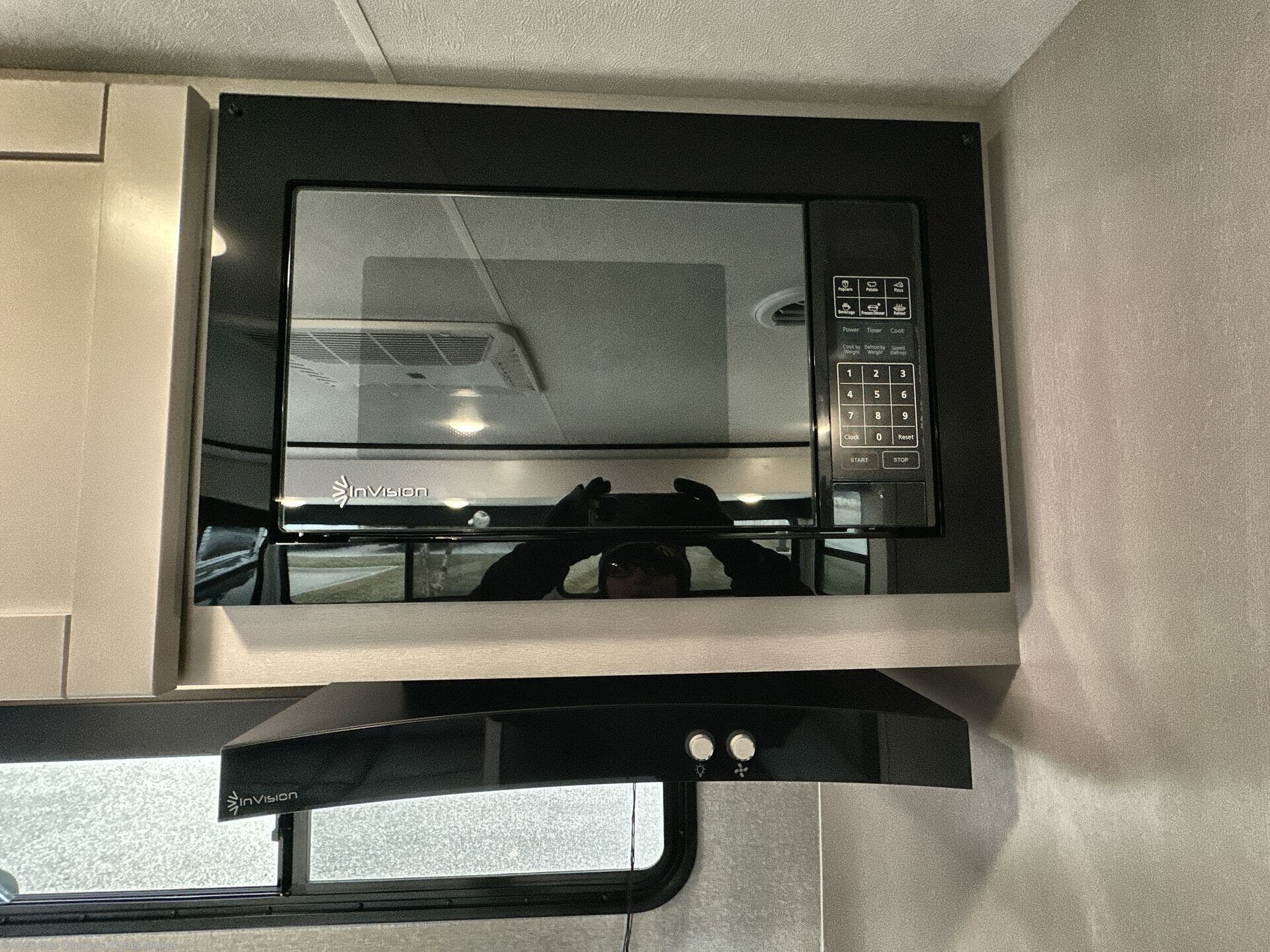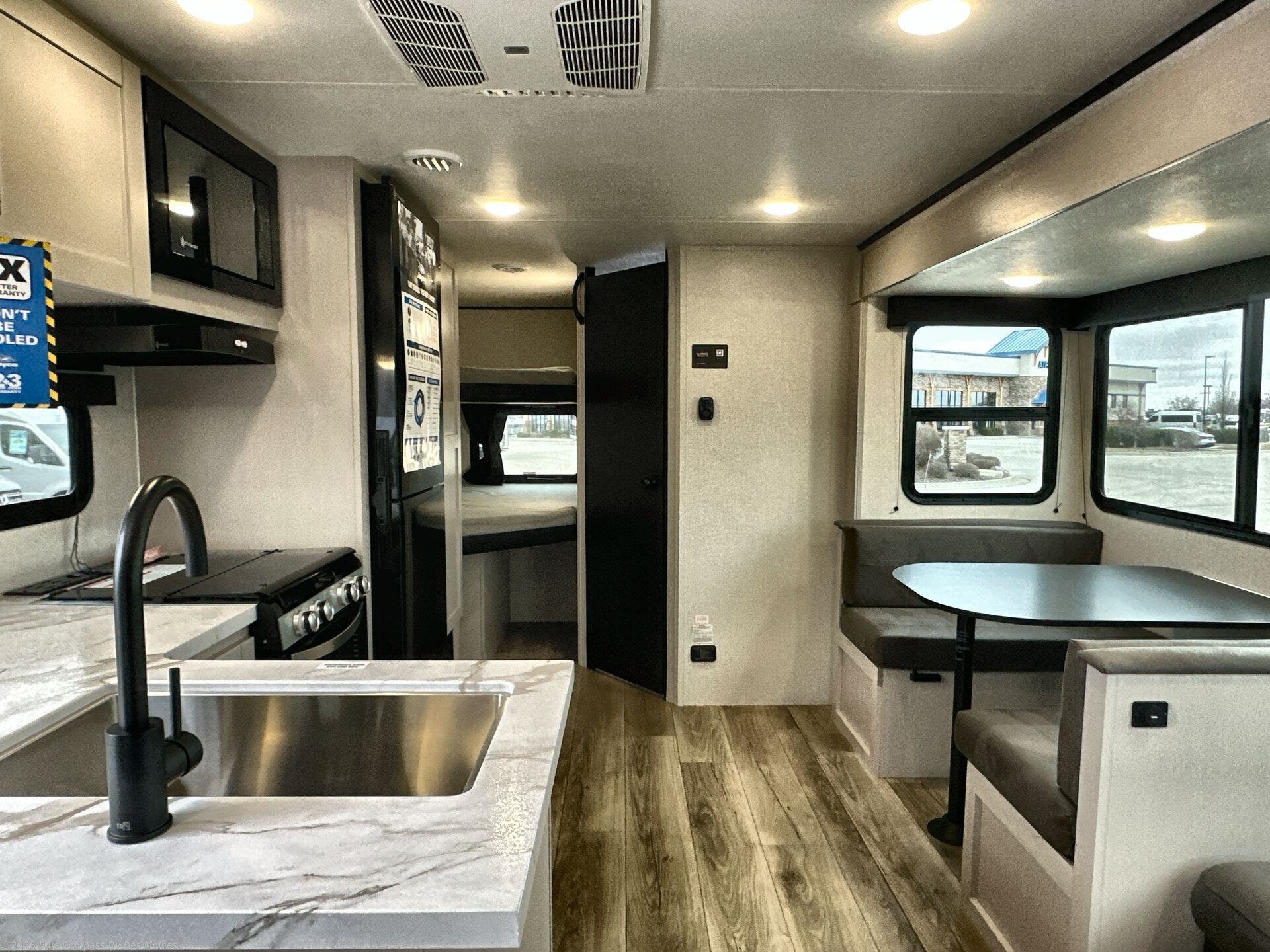 Camping with a larger group just got easier in this spacious travel trailer for eight! You'll have the front bedroom to yourselves which includes a walk-around queen bed with dual wardrobes and nightstands to keep your things tidy. The double-size bunks with storage below will be perfect for your guests or little ones, and the full bath adjacent to the bunks will let everyone freshen up each day. A booth dinette and jack-knife sofa within the large slide out provides a place to dine, play games, and convert to more sleeping space. And the chef of your group will find a full kitchen, complete with microwave oven, cooktop, pantry and 11 cu. ft. 12V refrigerator!