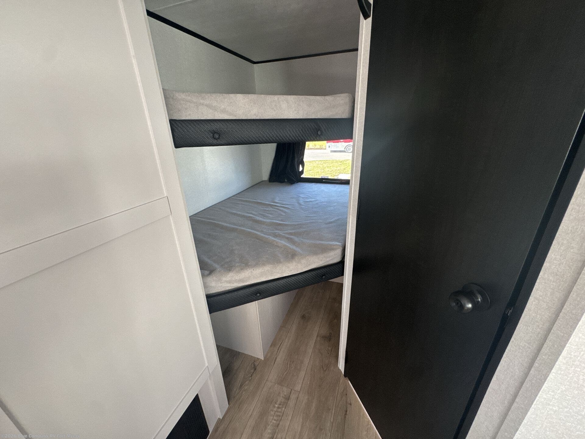 Camping with a larger group just got easier in this spacious travel trailer for eight! You'll have the front bedroom to yourselves which includes a walk-around queen bed with dual wardrobes and nightstands to keep your things tidy. The double-size bunks with storage below will be perfect for your guests or little ones, and the full bath adjacent to the bunks will let everyone freshen up each day. A booth dinette and jack-knife sofa within the large slide out provides a place to dine, play games, and convert to more sleeping space. And the chef of your group will find a full kitchen, complete with microwave oven, cooktop, pantry and 11 cu. ft. 12V refrigerator!
