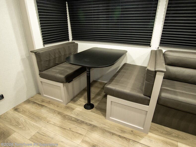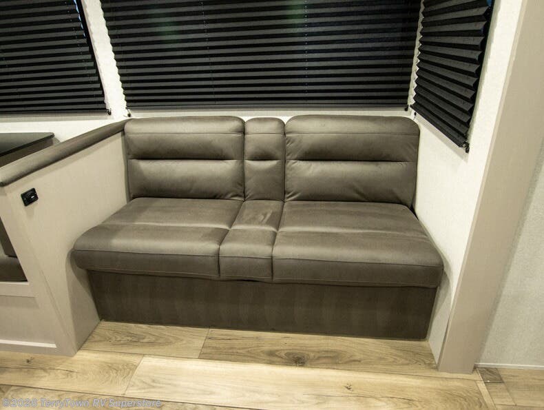 Camping with a larger group just got easier in this spacious travel trailer for eight! You'll have the front bedroom to yourselves which includes a walk-around queen bed with dual wardrobes and nightstands to keep your things tidy. The double-size bunks with storage below will be perfect for your guests or little ones, and the full bath adjacent to the bunks will let everyone freshen up each day. A booth dinette and jack-knife sofa within the large slide out provides a place to dine, play games, and convert to more sleeping space. And the chef of your group will find a full kitchen, complete with microwave oven, cooktop, pantry and 11 cu. ft. 12V refrigerator!