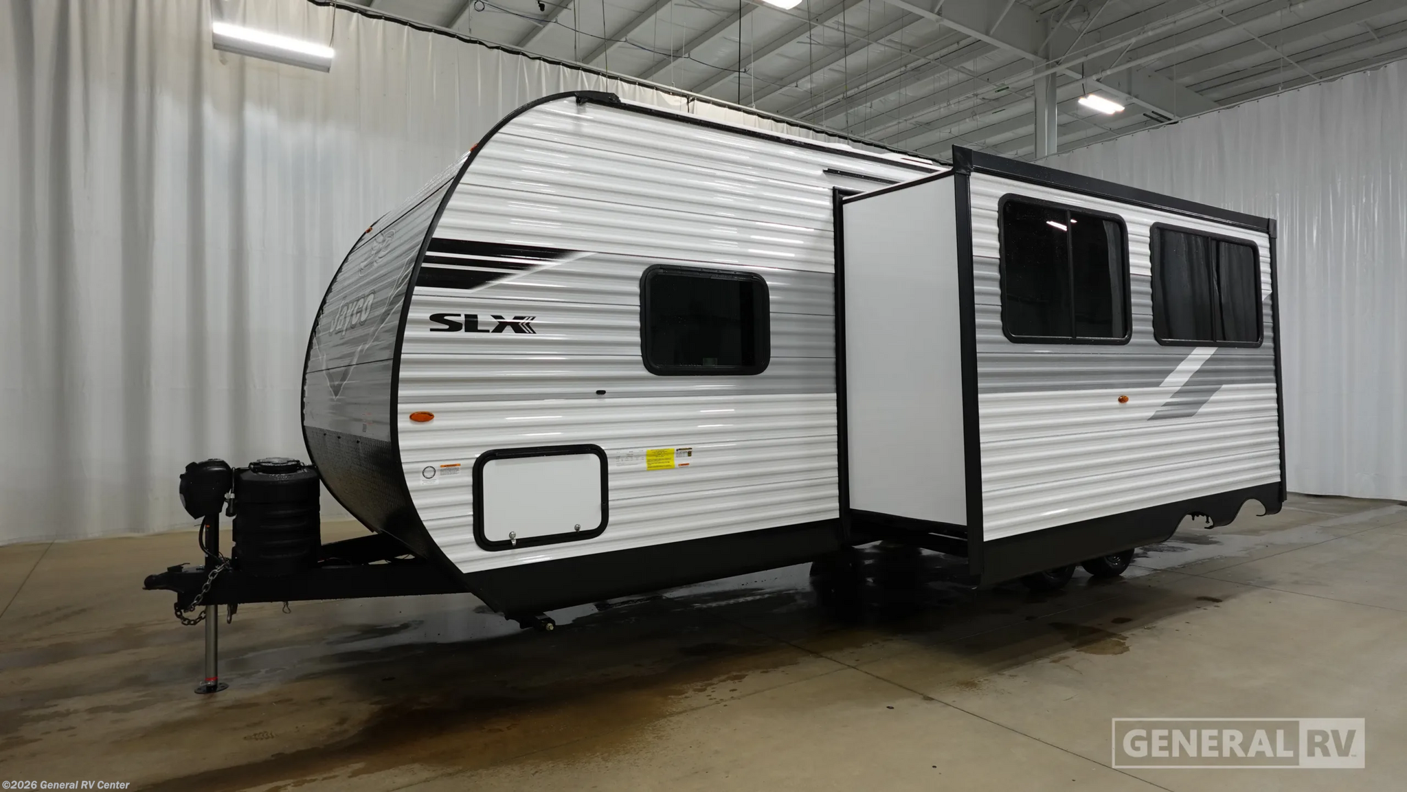 Discover the 2026 Jayco Jay Flight SLX 261BHS, where comfort and adventure meet in perfect harmony. This RV is designed to accommodate up to ten people, making it ideal for family trips or group getaways. As you enter, you'll find a beautifully arranged center kitchen equipped with a mid-size electric refrigerator and a three-burner cooktop, perfect for preparing delicious meals on the road. The adjacent center living area features a cozy jack-knife sofa, creating a welcoming space to relax and unwind. The front bedroom offers a queen-sized bed with ample wardrobe space, ensuring restful nights after a day of exploration. At the rear, the double bunks provide additional sleeping options, while the bathroom with a tub/shower combo ensures convenience for everyone. The 16-foot powered retractable awning extends your living space outdoors, allowing you to enjoy the beauty of nature in comfort. With a generous fresh water capacity of 76 gallons and a cargo capacity of 1296 pounds, this RV is ready for extended adventures. Whether you're planning a weekend getaway or a cross-country journey, the Jayco Jay Flight SLX 261BHS promises a memorable experience with its thoughtful design and reliable features. For more details or to see this model in person, visit your nearest General RV dealership.