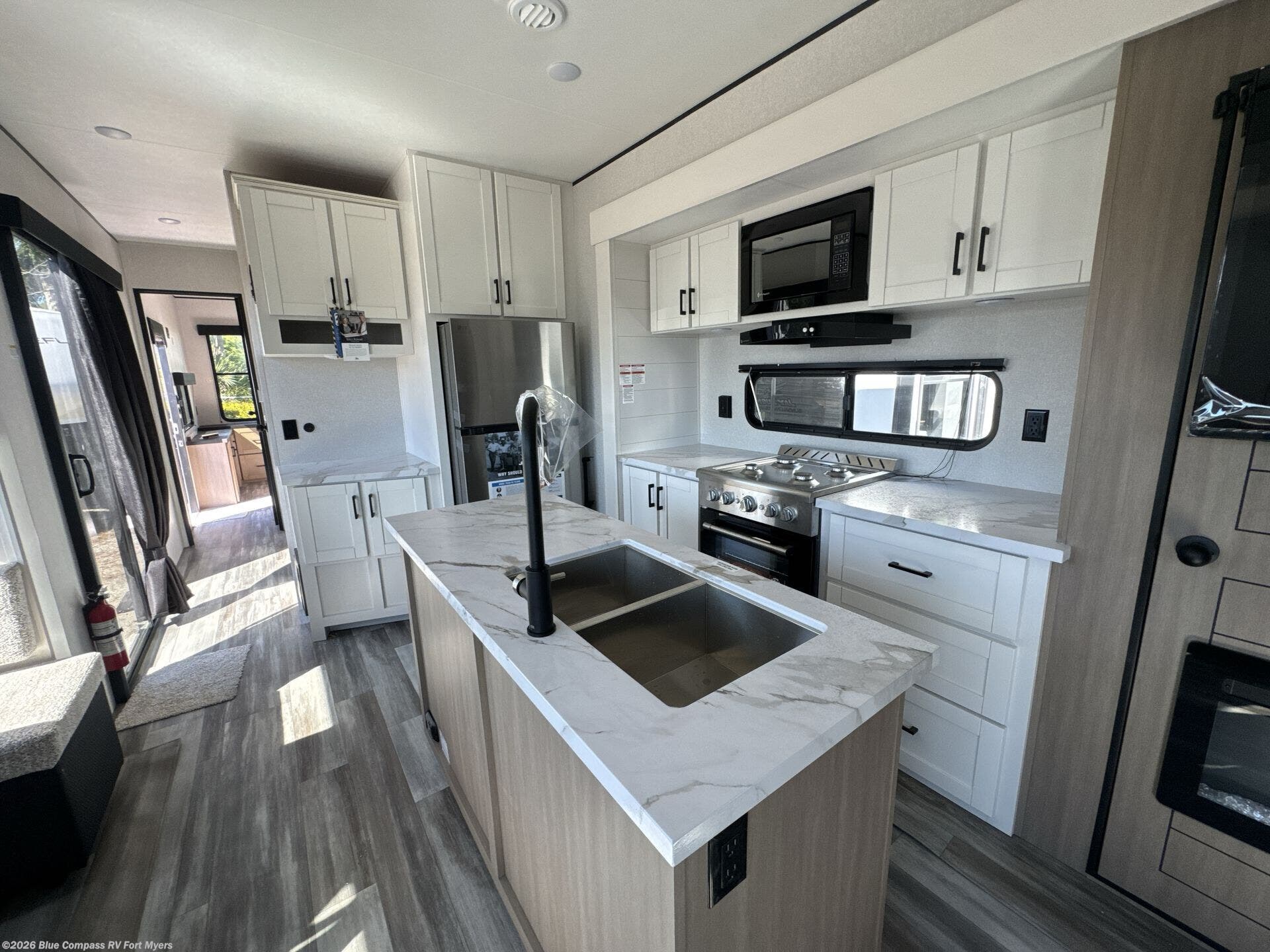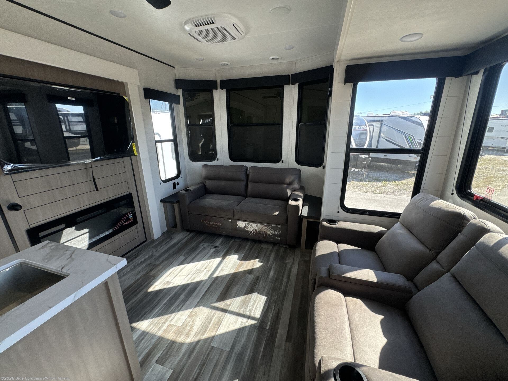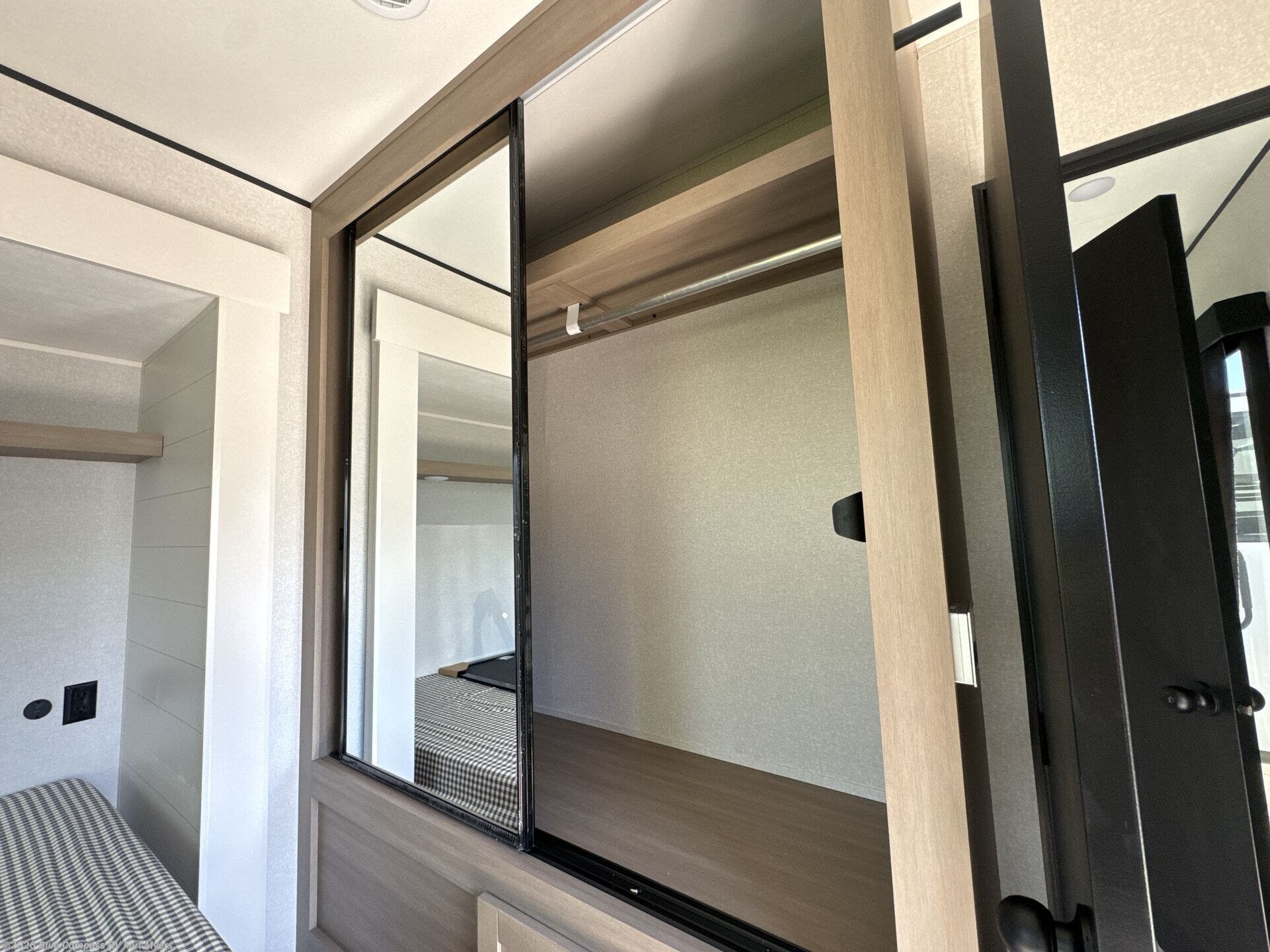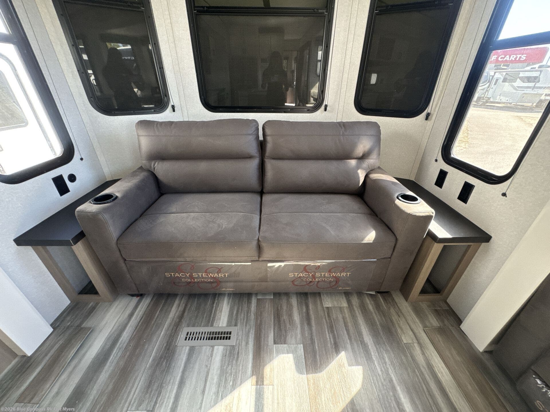 Your crew of four will love extended stays in this triple slide out trailer! Once you've unpacked your bags, you can head to the kitchen to prepare lunch on the cooktop and kitchen island. There is a table and chairs with a bench to dine at, and you can relax on the theater seat after your meal is cleaned up. A front tri-fold sofa will provide more seating space, along with sleeping space for guests. A full bath includes washer and dryer prep if you plan to add these appliances, and the rear private bedroom is sure to make you feel right at home. There is a queen bed slide, a wardrobe, vanity, and large dresser so nothing gets left behind!
