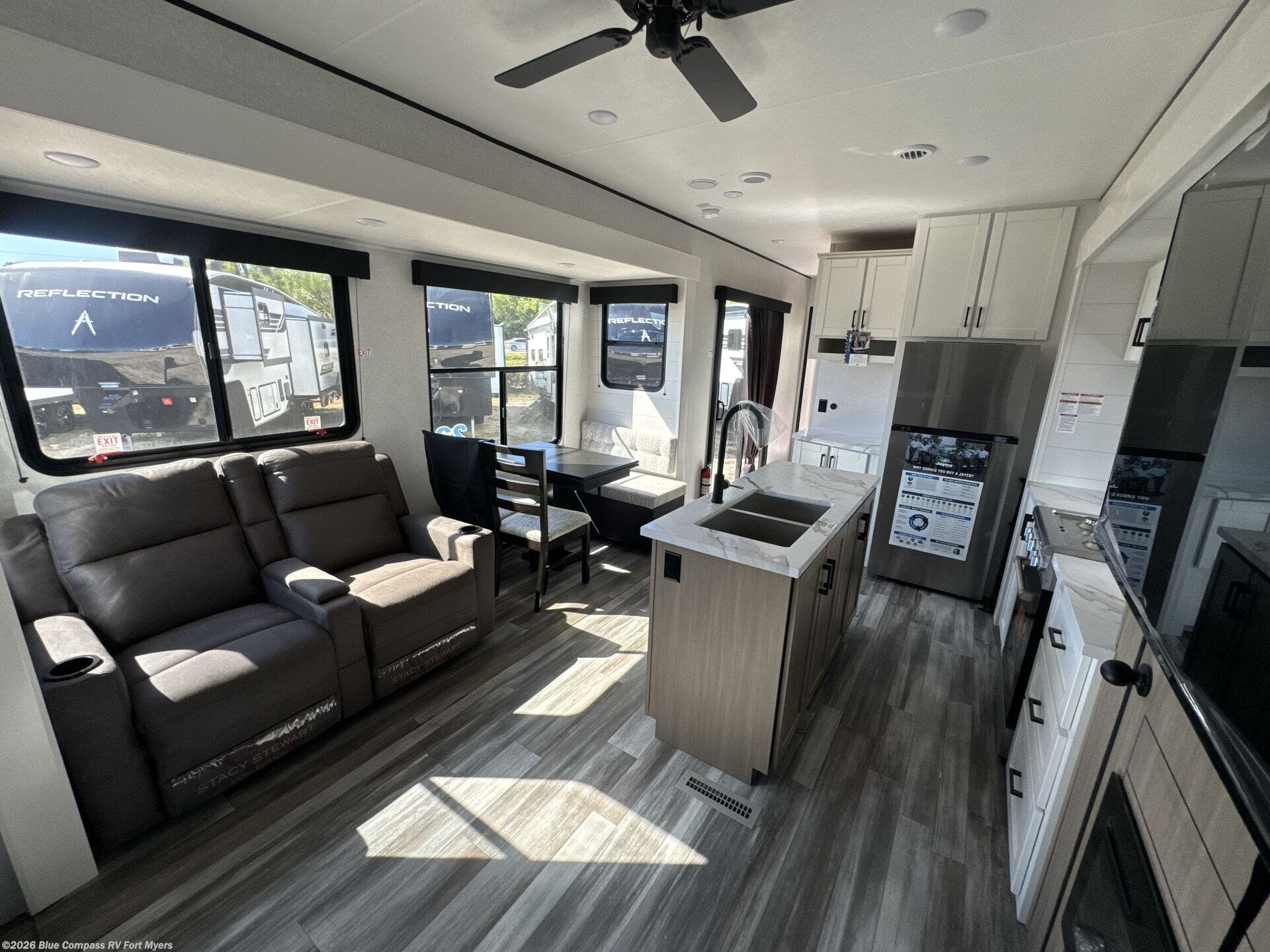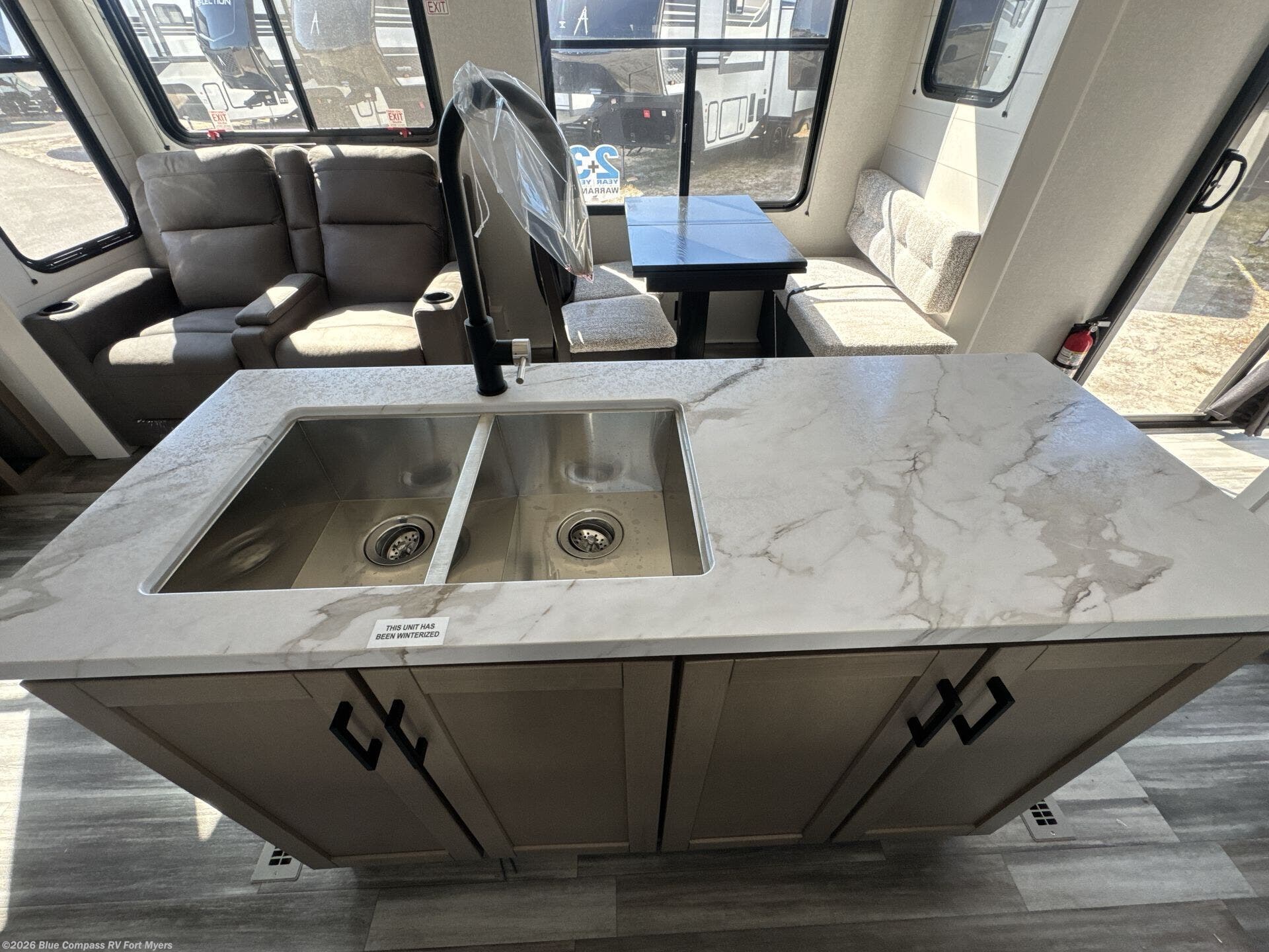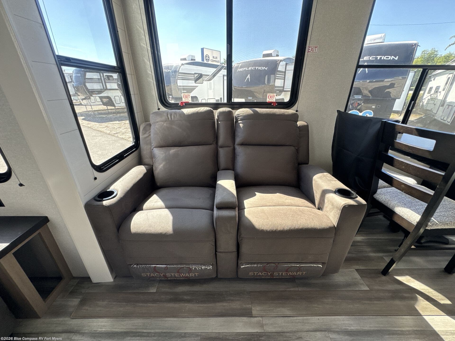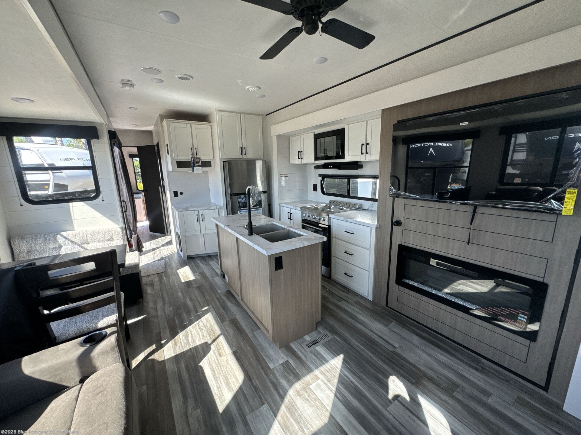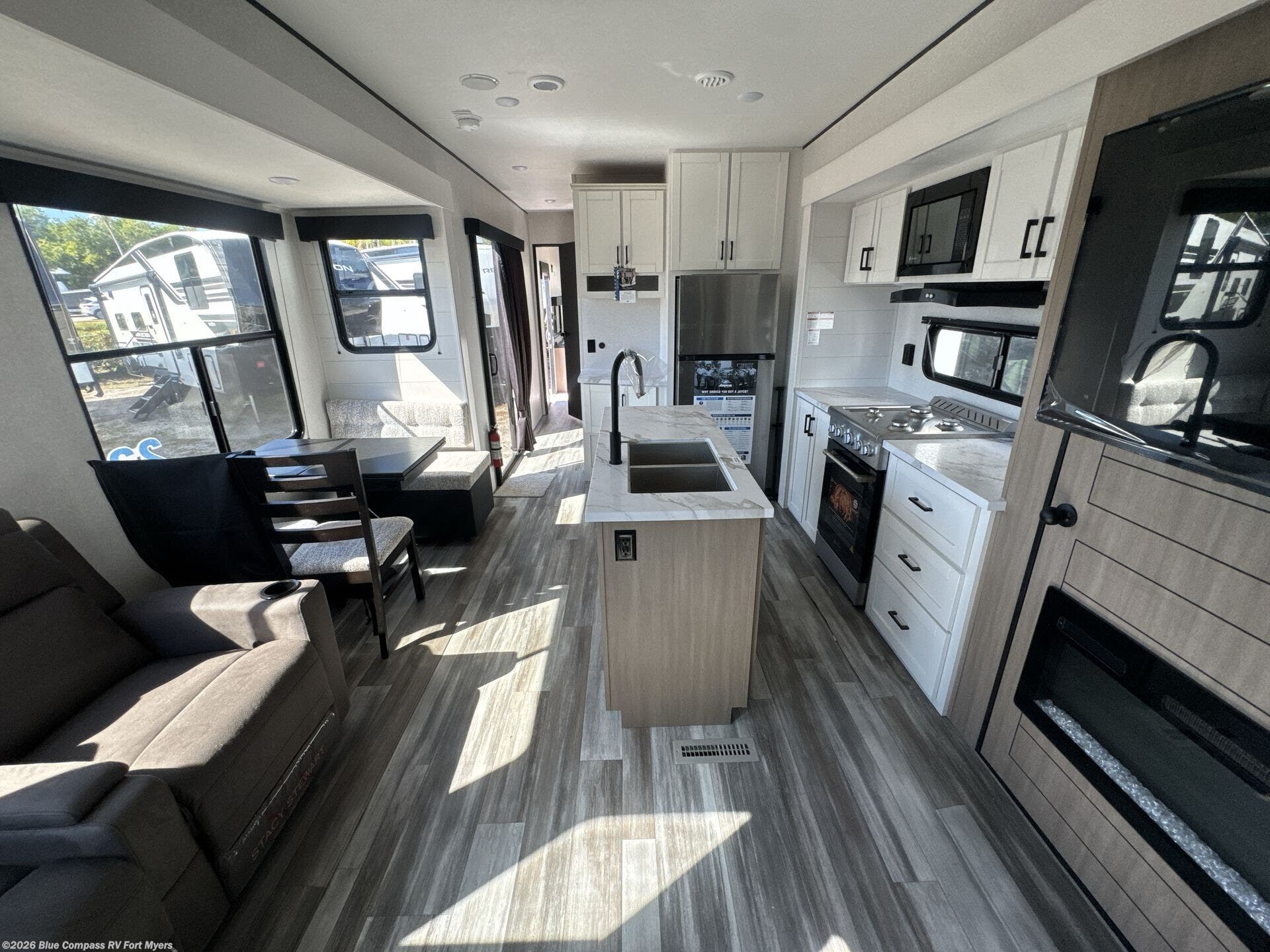 Your crew of four will love extended stays in this triple slide out trailer! Once you've unpacked your bags, you can head to the kitchen to prepare lunch on the cooktop and kitchen island. There is a table and chairs with a bench to dine at, and you can relax on the theater seat after your meal is cleaned up. A front tri-fold sofa will provide more seating space, along with sleeping space for guests. A full bath includes washer and dryer prep if you plan to add these appliances, and the rear private bedroom is sure to make you feel right at home. There is a queen bed slide, a wardrobe, vanity, and large dresser so nothing gets left behind!