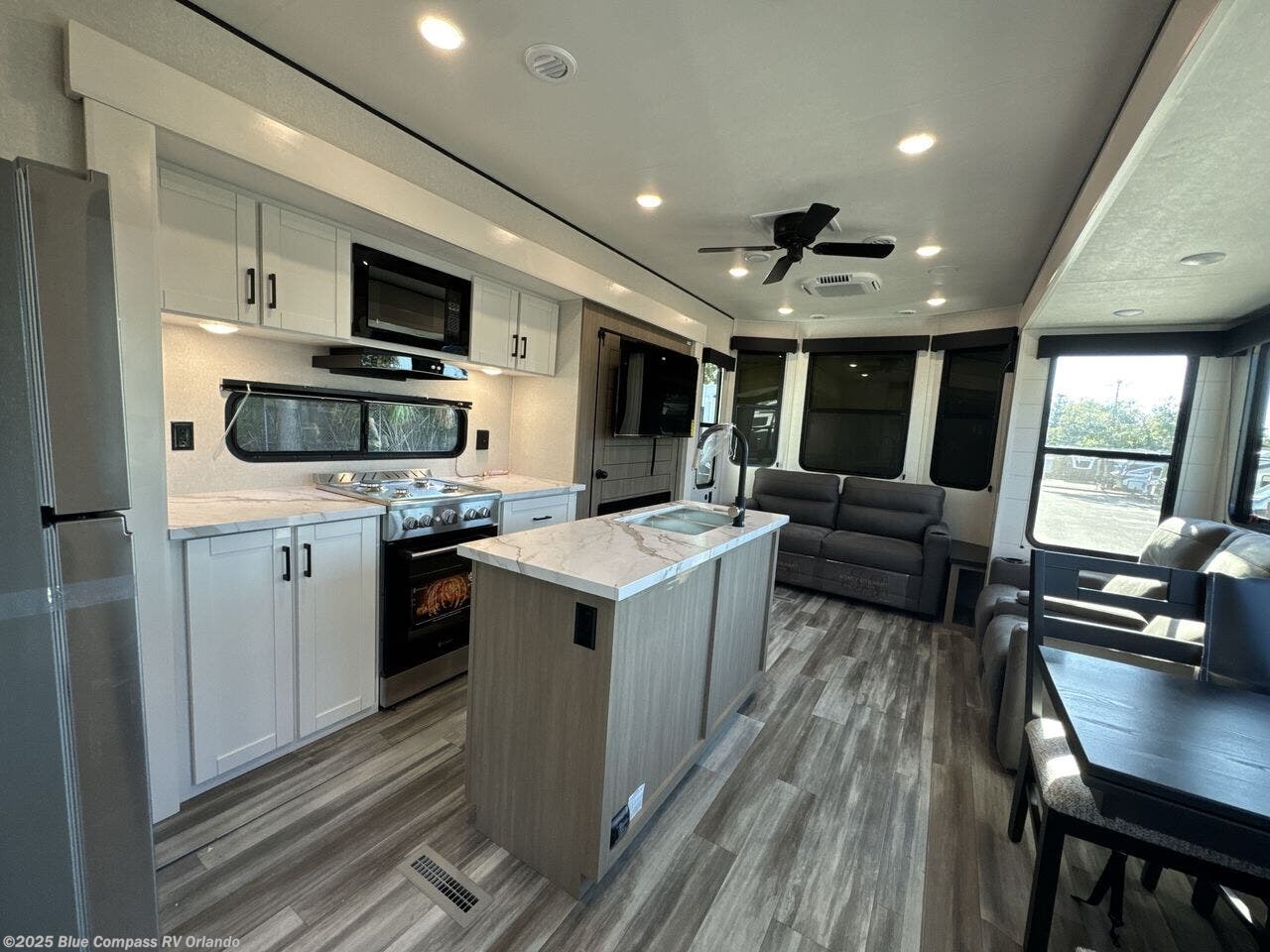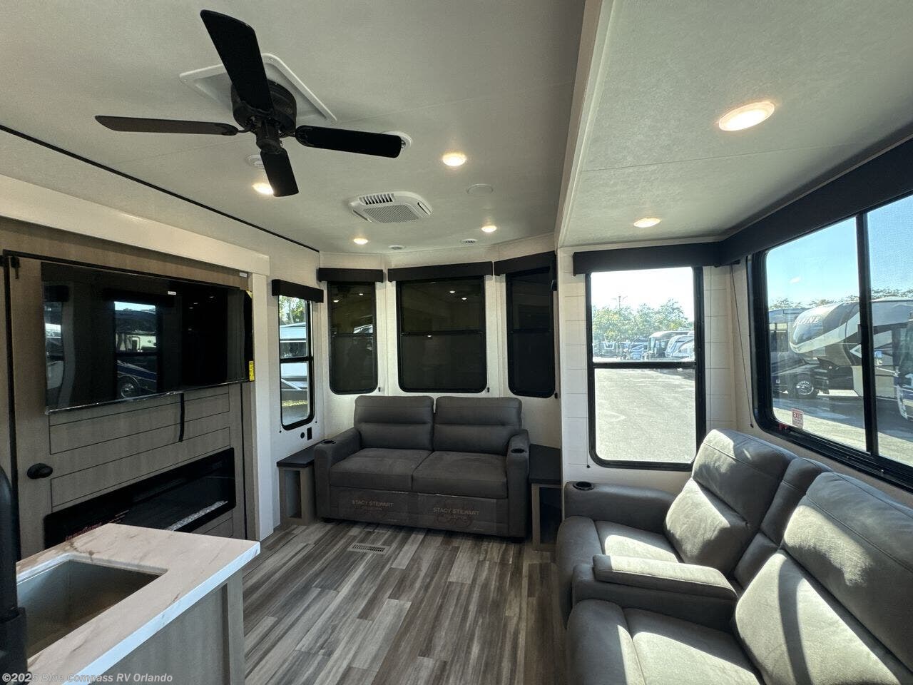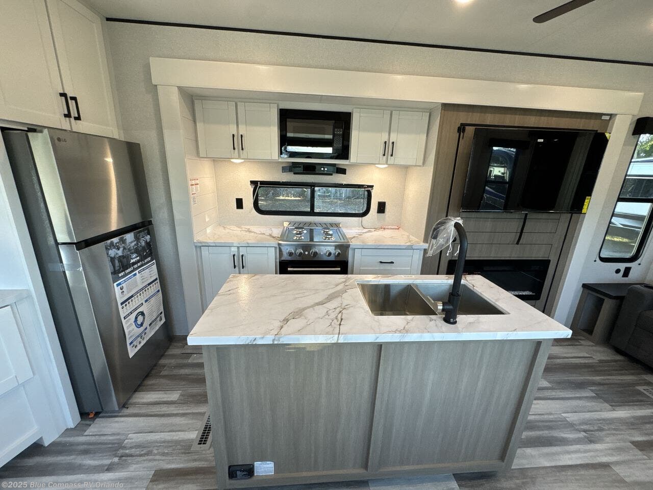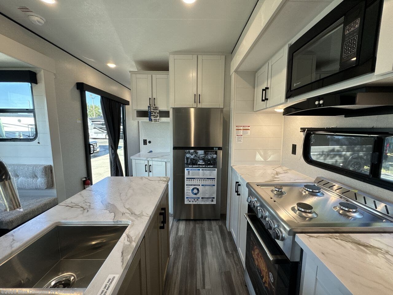 Your crew of four will love extended stays in this triple slide out trailer! Once you've unpacked your bags, you can head to the kitchen to prepare lunch on the cooktop and kitchen island. There is a table and chairs with a bench to dine at, and you can relax on the theater seat after your meal is cleaned up. A front tri-fold sofa will provide more seating space, along with sleeping space for guests. A full bath includes washer and dryer prep if you plan to add these appliances, and the rear private bedroom is sure to make you feel right at home. There is a queen bed slide, a wardrobe, vanity, and large dresser so nothing gets left behind!