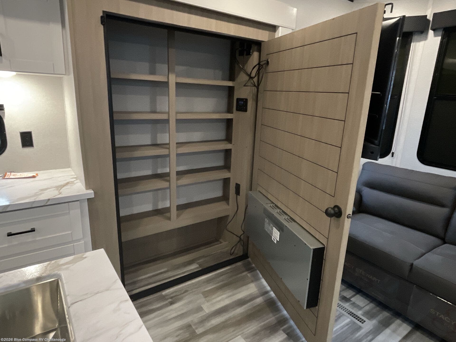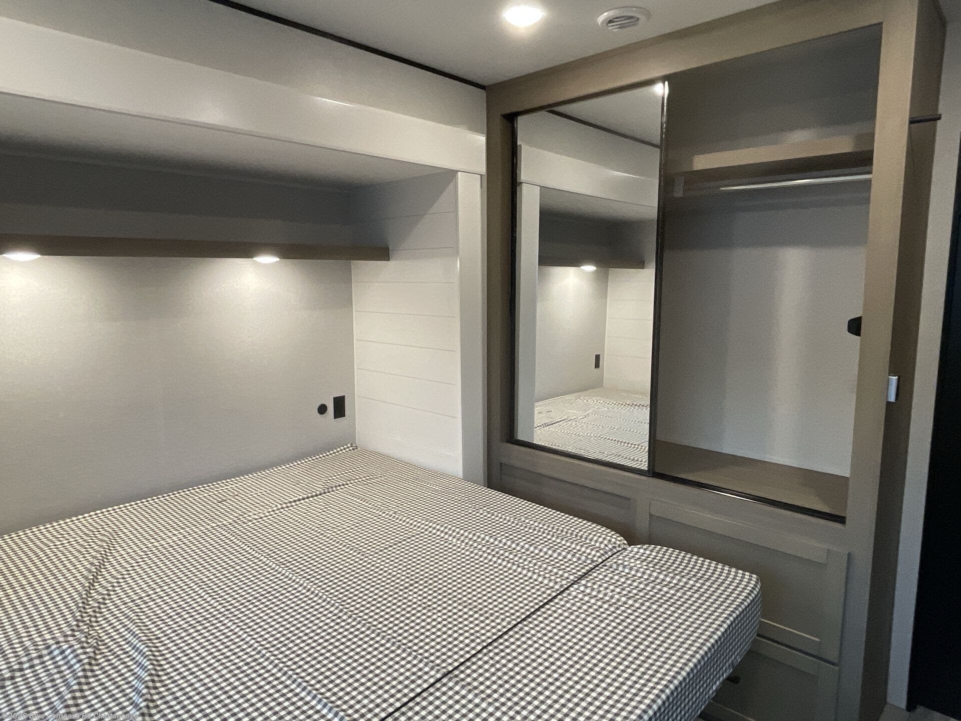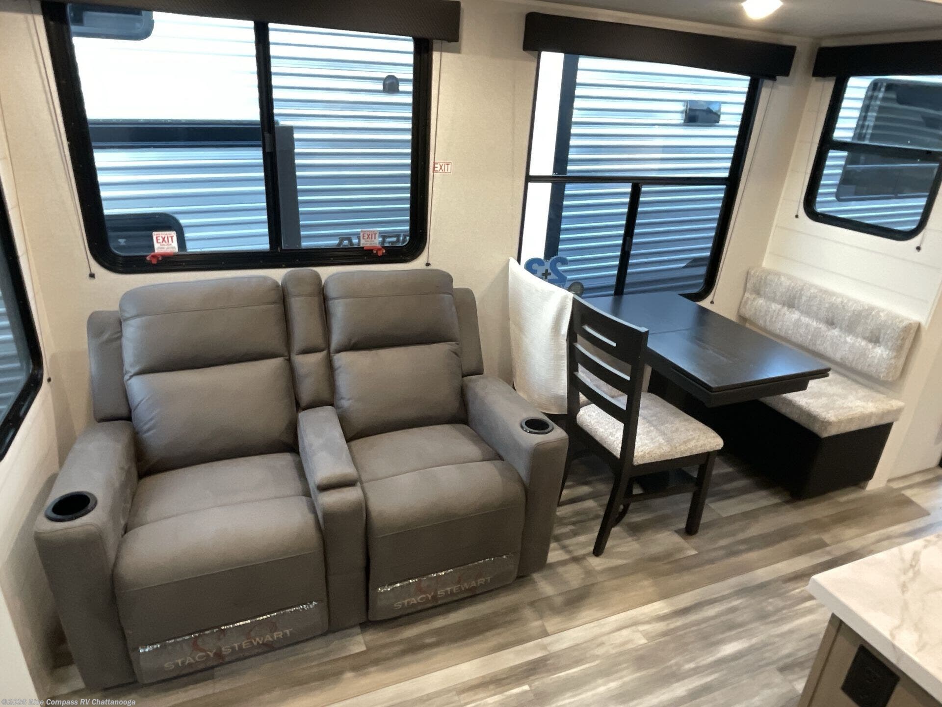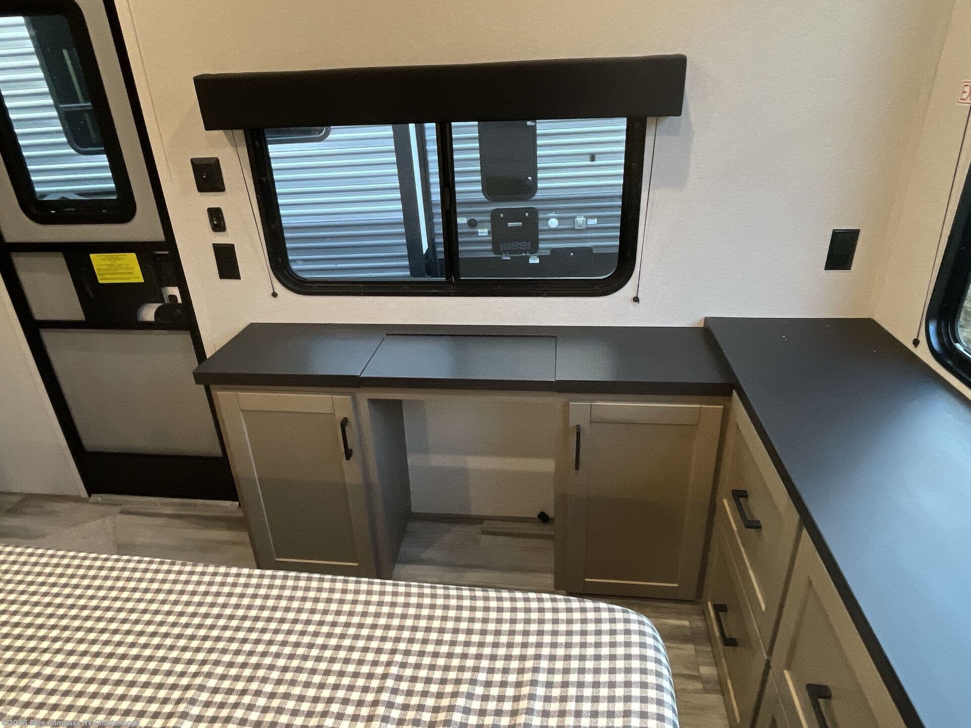 Your crew of four will love extended stays in this triple slide out trailer! Once you've unpacked your bags, you can head to the kitchen to prepare lunch on the cooktop and kitchen island. There is a table and chairs with a bench to dine at, and you can relax on the theater seat after your meal is cleaned up. A front tri-fold sofa will provide more seating space, along with sleeping space for guests. A full bath includes washer and dryer prep if you plan to add these appliances, and the rear private bedroom is sure to make you feel right at home. There is a queen bed slide, a wardrobe, vanity, and large dresser so nothing gets left behind!