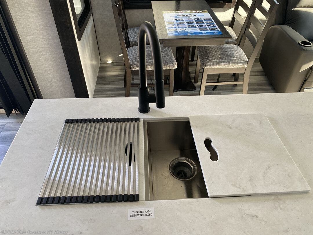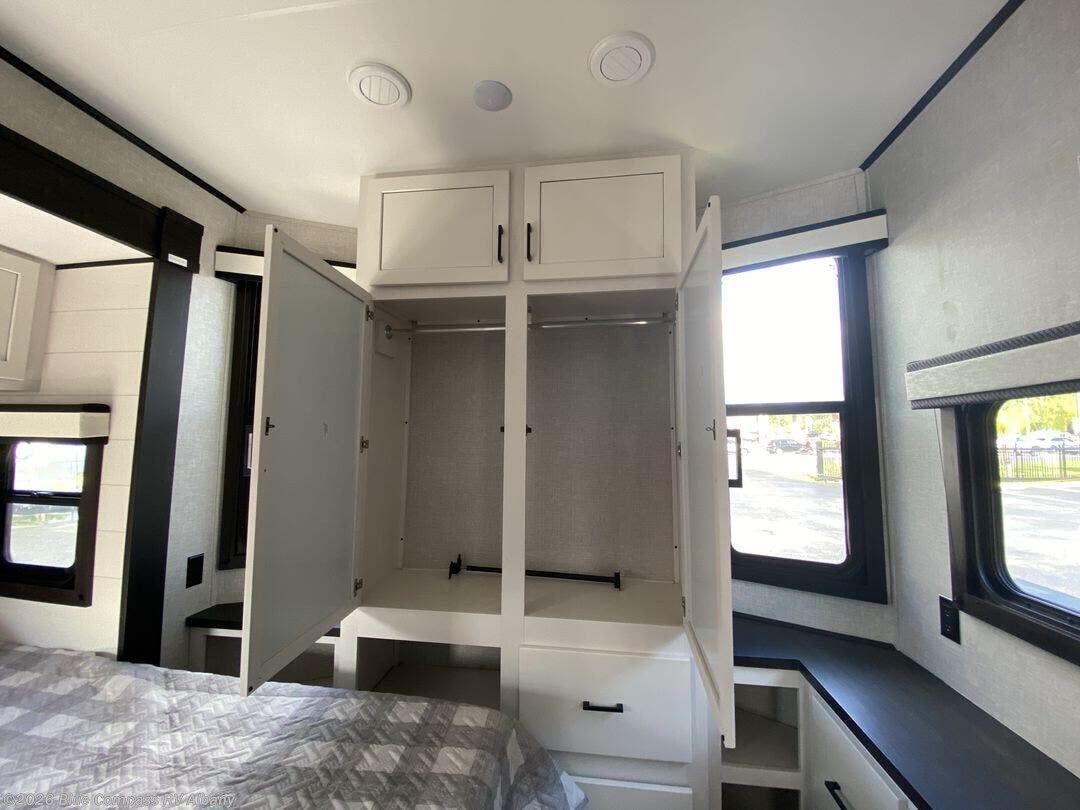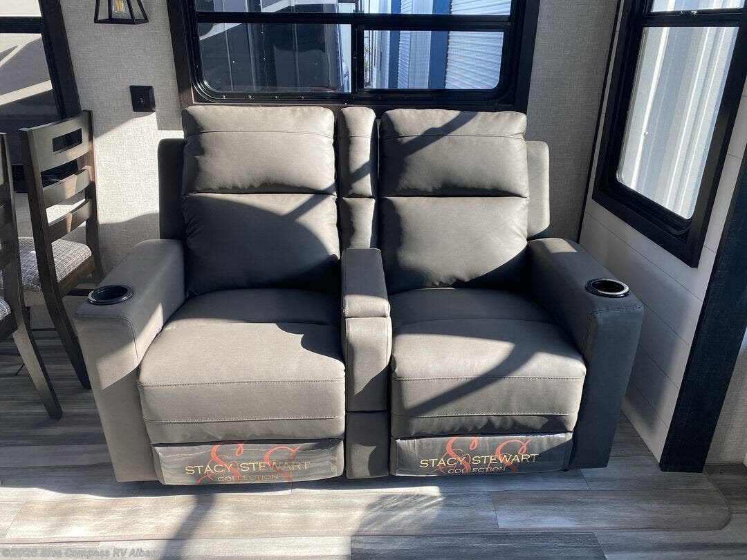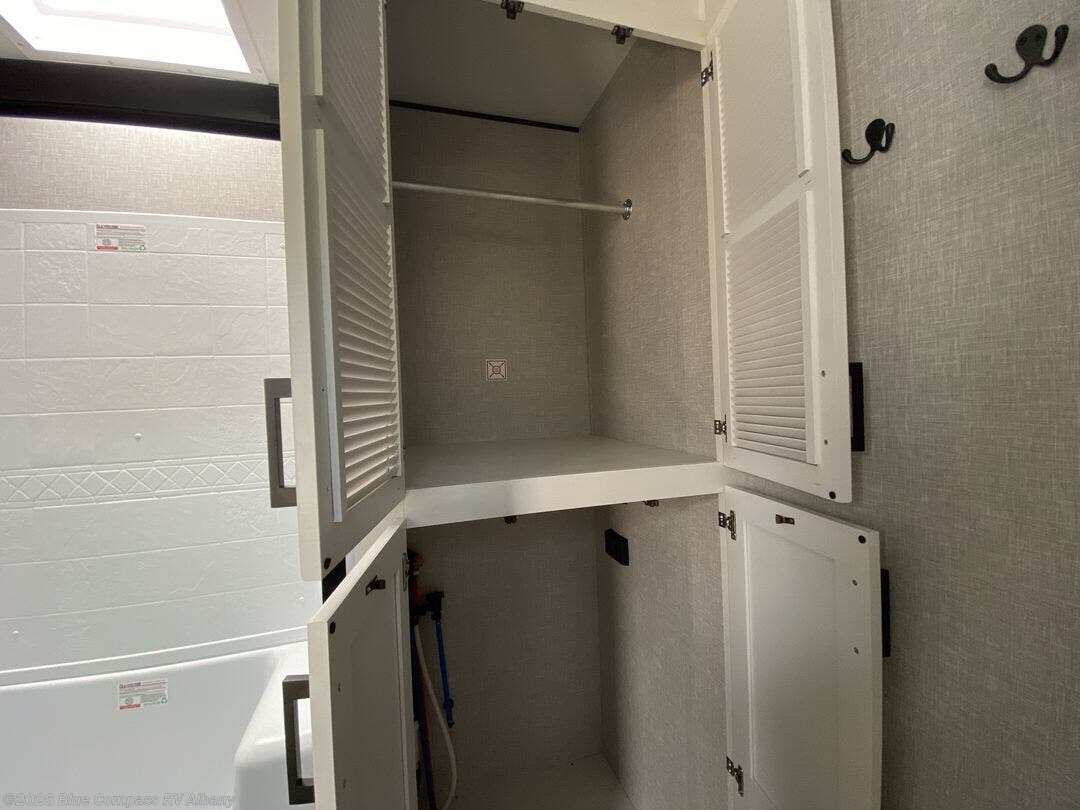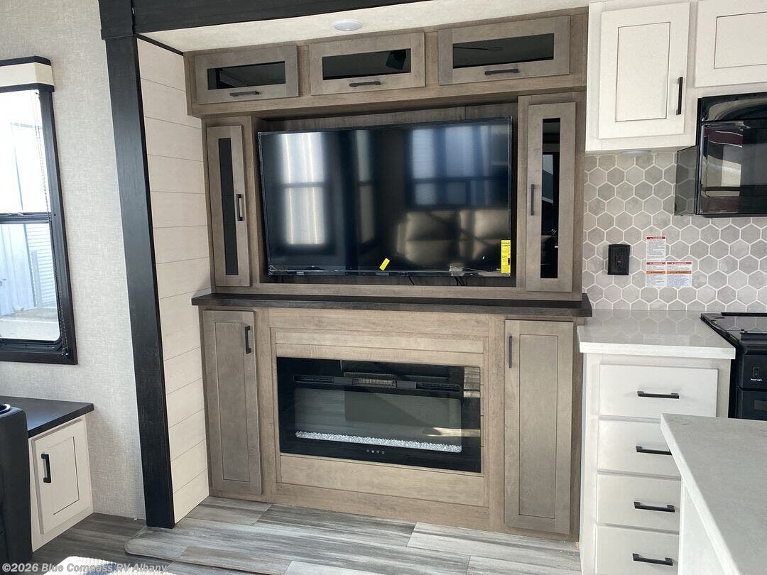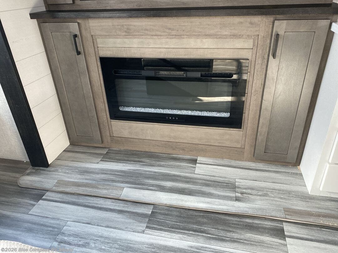 Extended stays are made easy in this travel trailer for four. You will love having your own bedroom up front with a queen bed slide, a wardrobe, plus two chests for your things, and your guests can sleep on the tri-fold sofa in the rear living area. A ceiling fan will keep the air moving while the chef makes eggs and bacon in the morning, and you all can dine at the free-standing table with chairs. Spend your day outdoors hiking, biking, or swimming, and the full bath will allow you to clean up after your adventures. You may want to make it a movie night since there is an entertainment center with a TV, or you can just relax by the fireplace and visit!