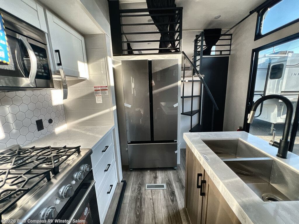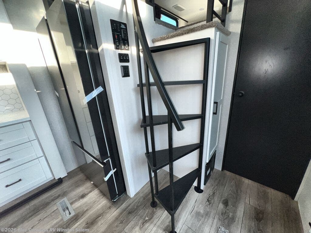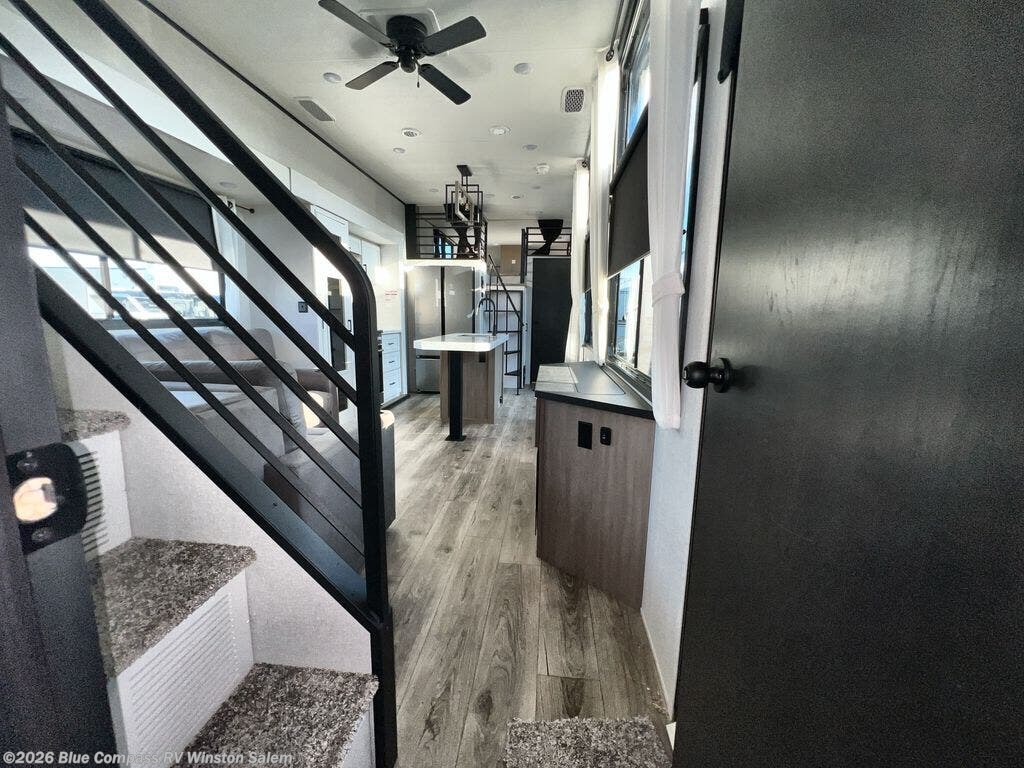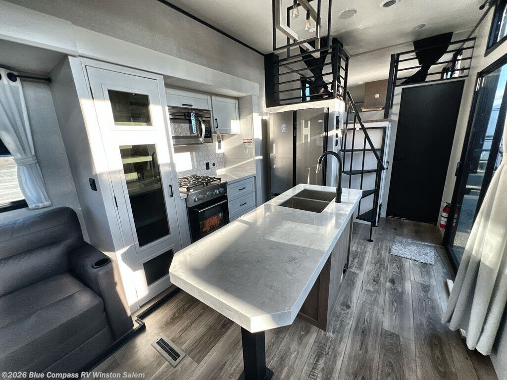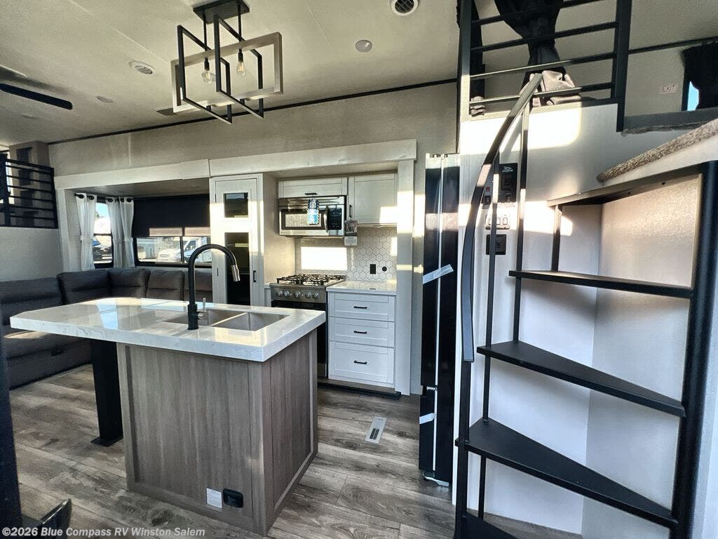 Travel in comfort with your family. You will love having your own bedroom up front with a queen bed, a bench with storage below, plus a dresser and overhead cabinet for your things. The front loft above the bedroom includes three bunk mats, a nightstand, and overhead shelves to keep this space tidy. In the living area, you will be able to enjoy the entertainment center, and a ceiling fan will keep the air moving while the chef cooks delicious meals in the morning. And you all can dine at the kitchen island which includes bar stools. The Kitchen is also fitted with a residential refrigerator, microwave, four cooktop burner, sink and pantry perfect to cook with luxury and comfort. Finally, you'll find a full rear bath with a walk-in shower plus washer and dryer prep. There is even a second loft above the bathroom for more sleeping or storage space!