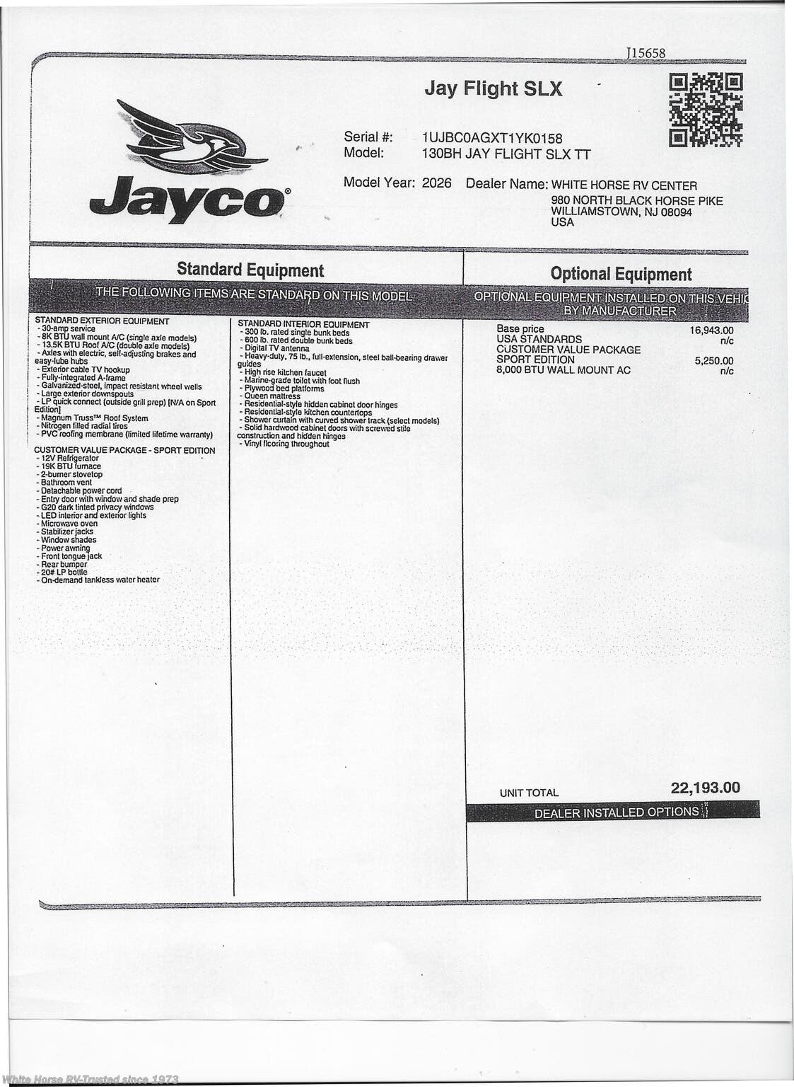 Request More Info on this 2026 Jayco Jay Flight SLX 130BH Offered for sale by White Horse RV Center