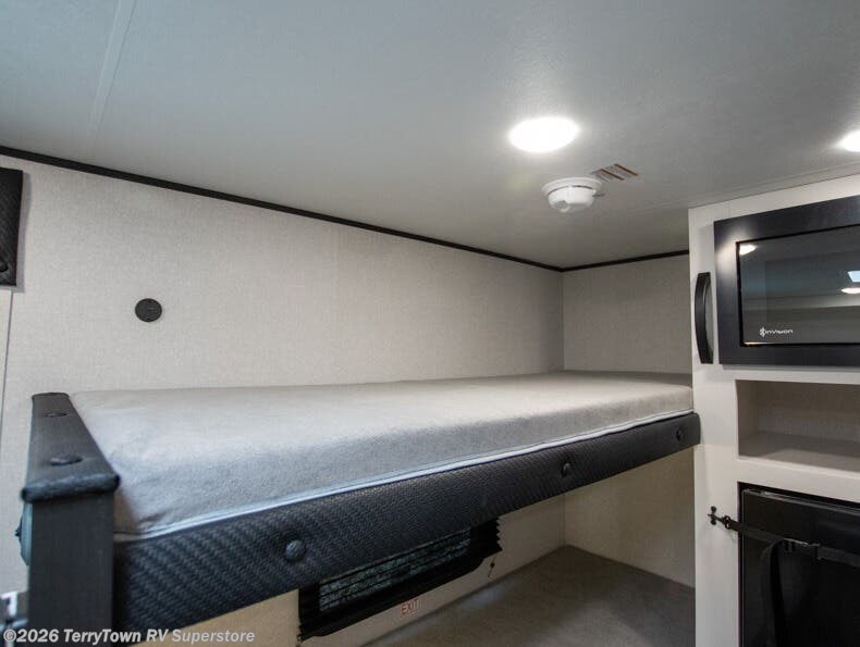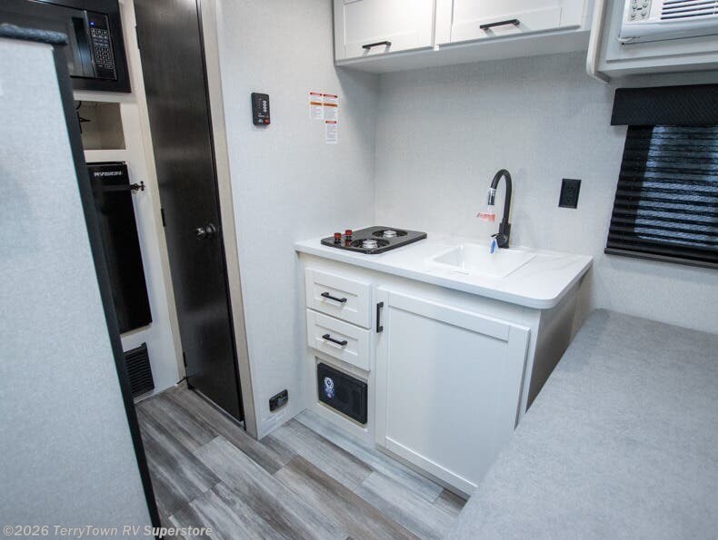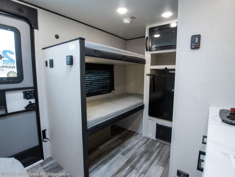 Your crew of four will love camping in this cozy travel trailer! There are bunk beds in the rear corner and a private bath in the other rear corner for easy nighttime use. You will have the front bed to yourselves, along with an overhead shelf and a nightstand/wardrobe for your clothes. The Customer Value Package on this Sport Edition model includes a 19K BTU furnace, stabilizer jacks, a power awning, an entry door with a window and shade prep, and many more stand-out features!