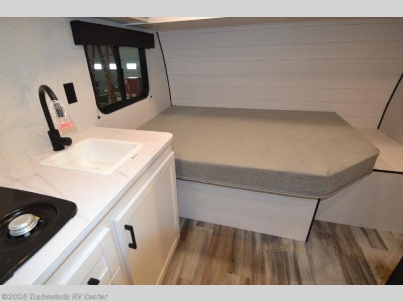 Your crew of four will love camping in this cozy travel trailer! There are bunk beds in the rear corner and a private bath in the other rear corner for easy nighttime use. You will have the front bed to yourselves, along with an overhead shelf and a nightstand/wardrobe for your clothes. The Customer Value Package on this Sport Edition model includes a 19K BTU furnace, stabilizer jacks, a power awning, an entry door with a window and shade prep, and many more stand-out features!