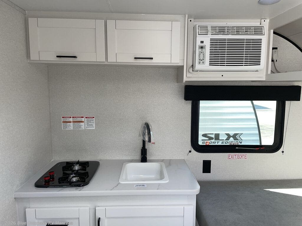 Your crew of four will love camping in this cozy travel trailer! There are bunk beds in the rear corner and a private bath in the other rear corner for easy nighttime use. You will have the front bed to yourselves, along with an overhead shelf and a nightstand/wardrobe for your clothes. The Customer Value Package on this Sport Edition model includes a 19K BTU furnace, stabilizer jacks, a power awning, an entry door with a window and shade prep, and many more stand-out features!
