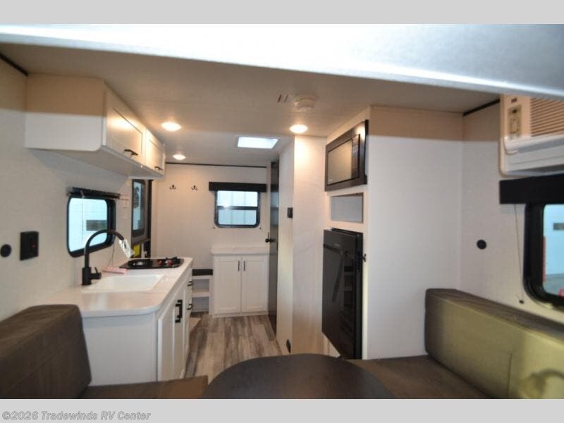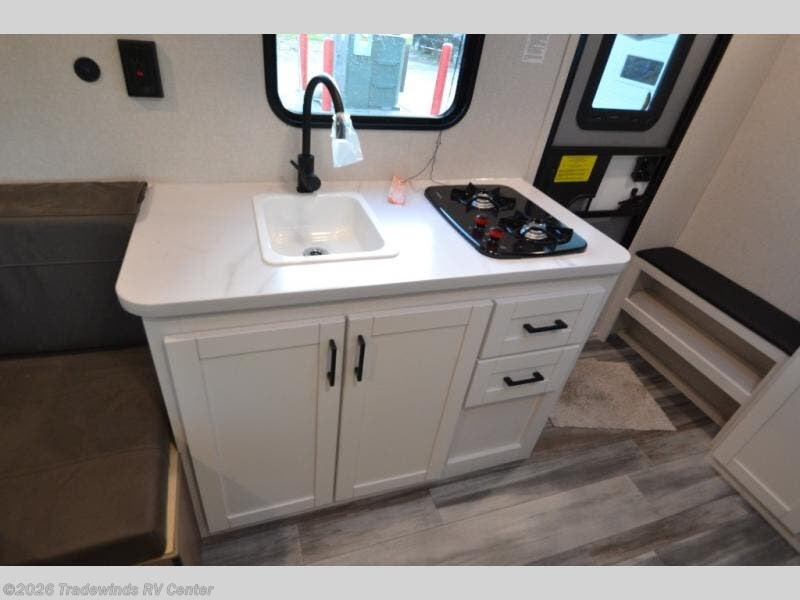 Easy to tow and versatile are just two ways to describe this travel trailer! The front twin beds/bench seats with a table can convert to a king-size bed, and you'll have an overhead shelf to keep your things organized. A two-burner stovetop and microwave will let you cook meals each day, and a 12V refrigerator will keep food fresh. The private bath includes a toilet and shower to clean up in each day, and the dresser just outside the bath will be perfect for clean clothes and towels!