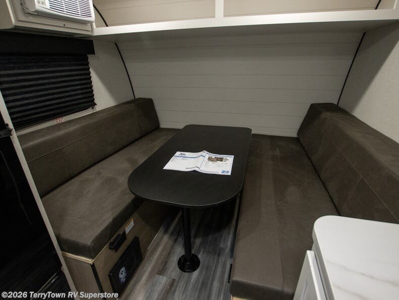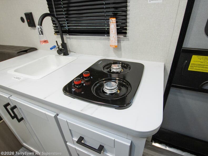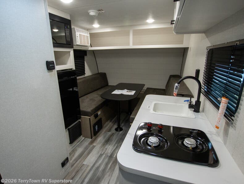 Easy to tow and versatile are just two ways to describe this travel trailer! The front twin beds/bench seats with a table can convert to a king-size bed, and you'll have an overhead shelf to keep your things organized. A two-burner stovetop and microwave will let you cook meals each day, and a 12V refrigerator will keep food fresh. The private bath includes a toilet and shower to clean up in each day, and the dresser just outside the bath will be perfect for clean clothes and towels!
