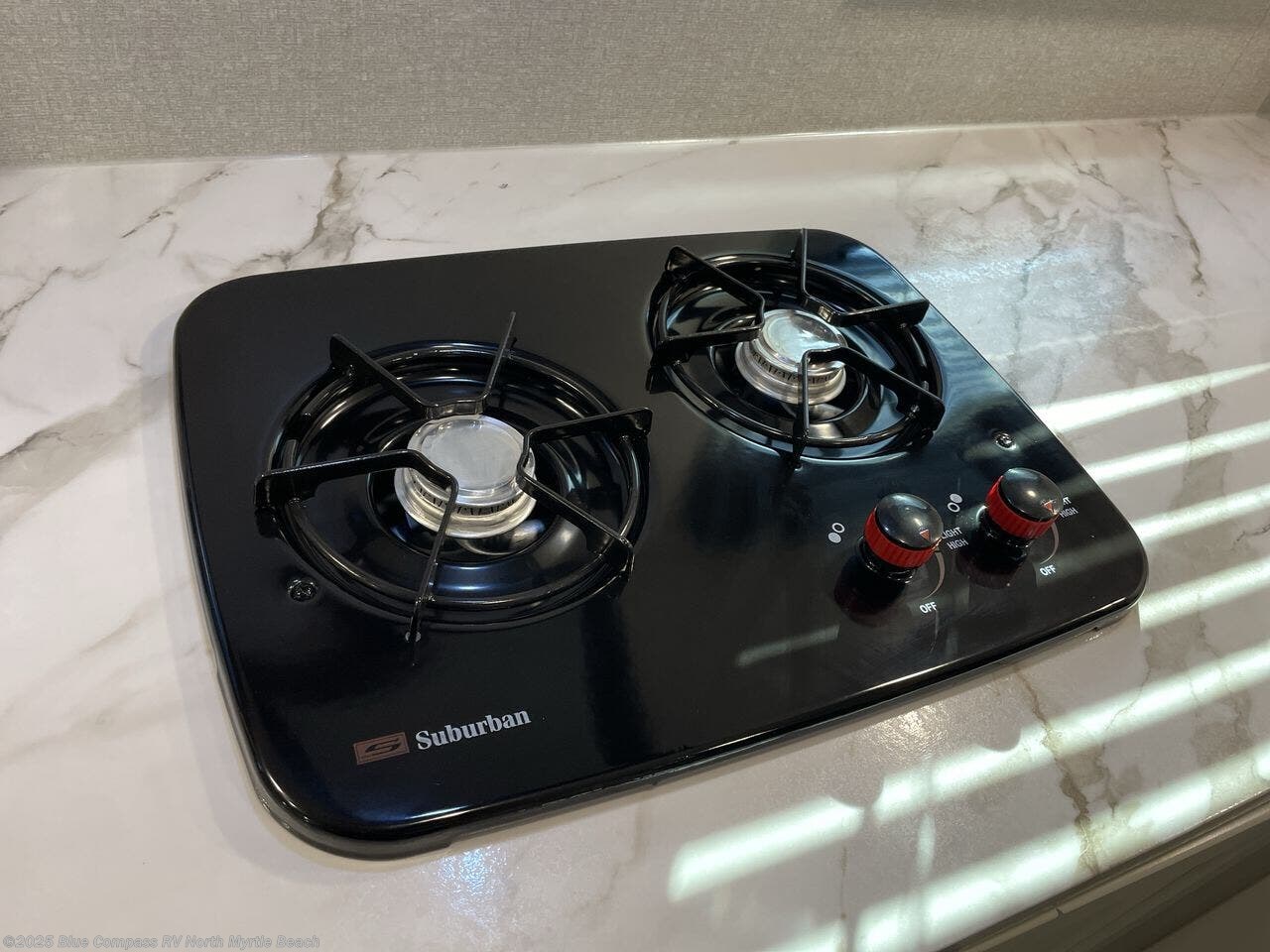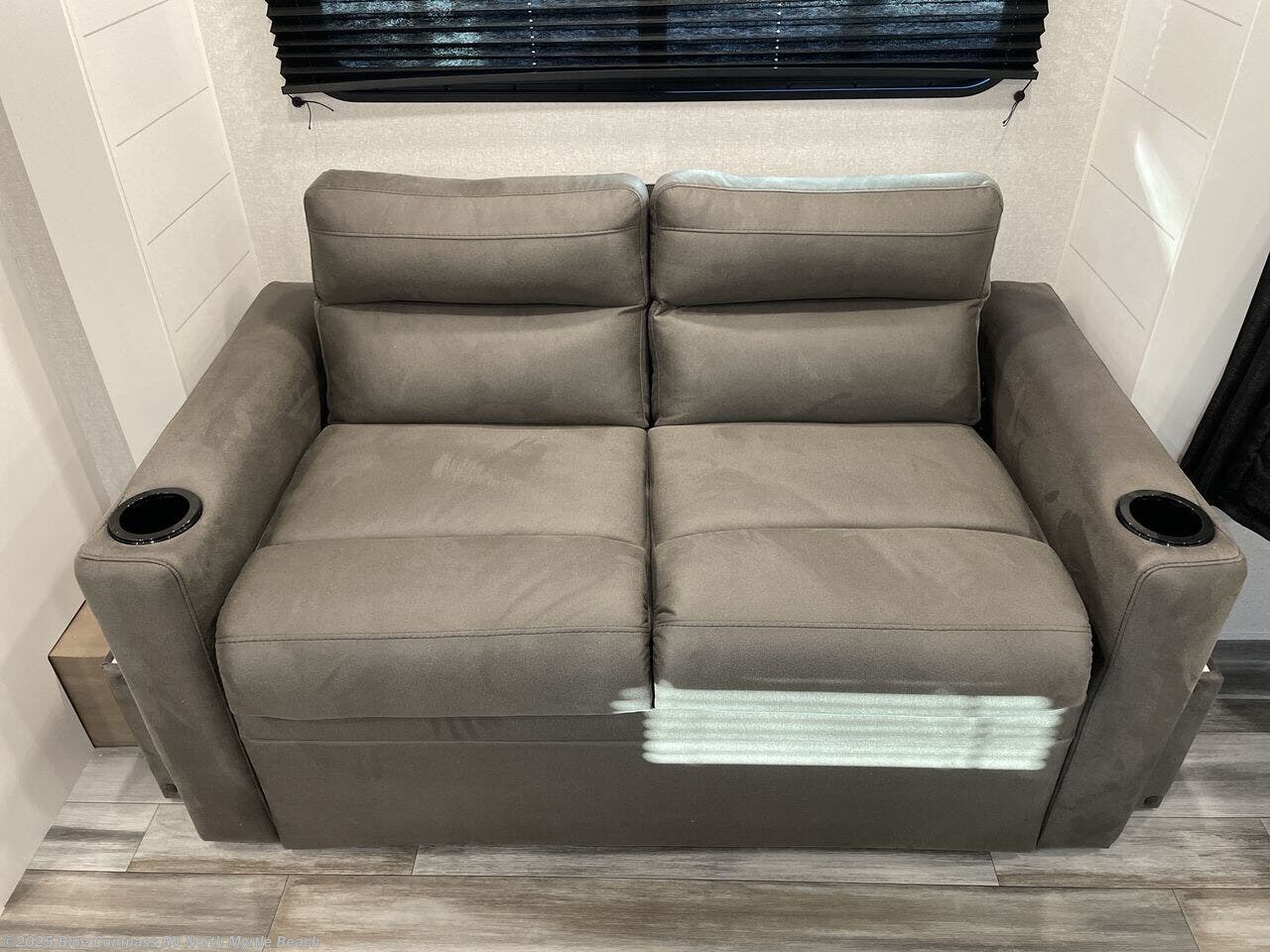 This single-axle couple's travel trailer is sure to bring you happiness at the campground. There is a front queen bed with a privacy curtain if you have a guest staying over on the jack-knife sofa, and the movable table in front of the sofa will provide more floor space when needed. A cooktop and microwave oven will let you make meals each day, and an 8 cu. ft. 12V refrigerator will be perfect for perishables. This model also includes a full rear bath with a shower, a toilet, plus a sink and a linen closet for clean towels.