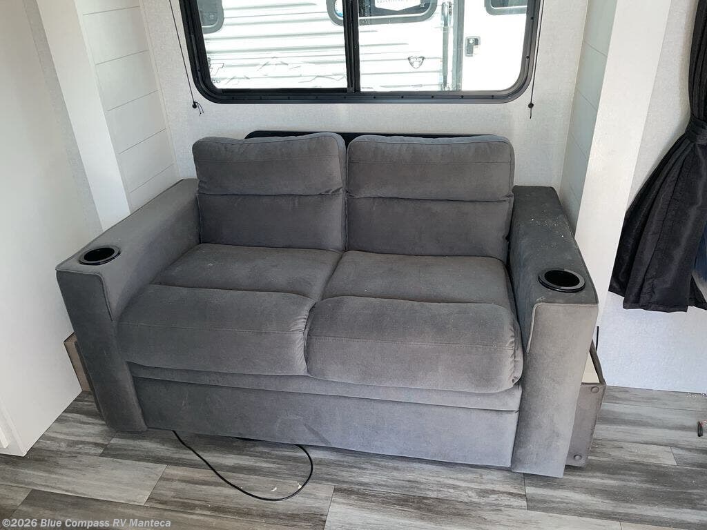 This single-axle couple's travel trailer is sure to bring you happiness at the campground. There is a front queen bed with a privacy curtain if you have a guest staying over on the jack-knife sofa, and the movable table in front of the sofa will provide more floor space when needed. A cooktop and microwave oven will let you make meals each day, and an 8 cu. ft. 12V refrigerator will be perfect for perishables. This model also includes a full rear bath with a shower, a toilet, plus a sink and a linen closet for clean towels.