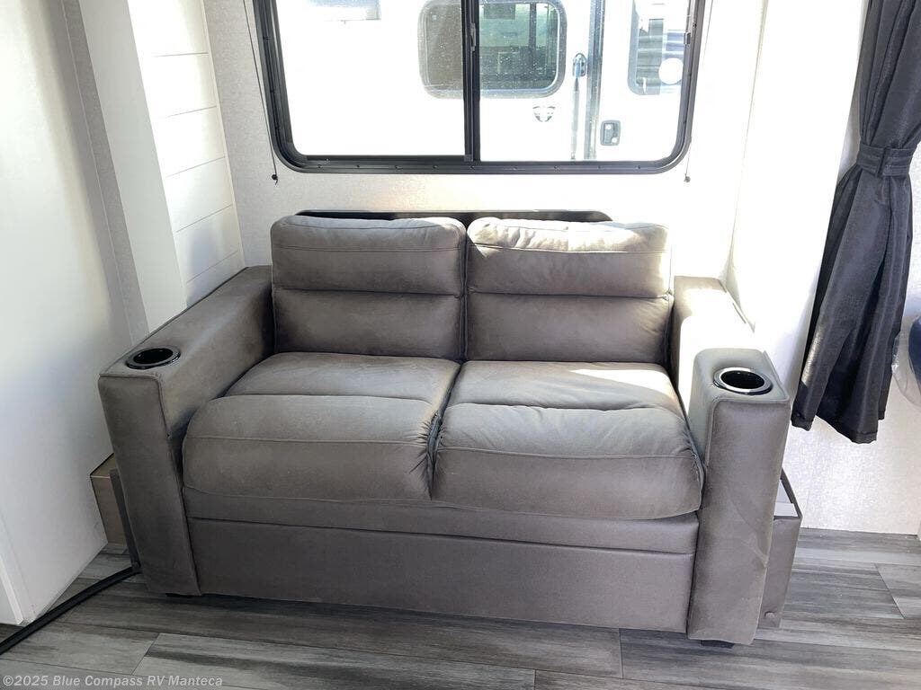 This single-axle couple's travel trailer is sure to bring you happiness at the campground. There is a front queen bed with a privacy curtain if you have a guest staying over on the jack-knife sofa, and the movable table in front of the sofa will provide more floor space when needed. A cooktop and microwave oven will let you make meals each day, and an 8 cu. ft. 12V refrigerator will be perfect for perishables. This model also includes a full rear bath with a shower, a toilet, plus a sink and a linen closet for clean towels.